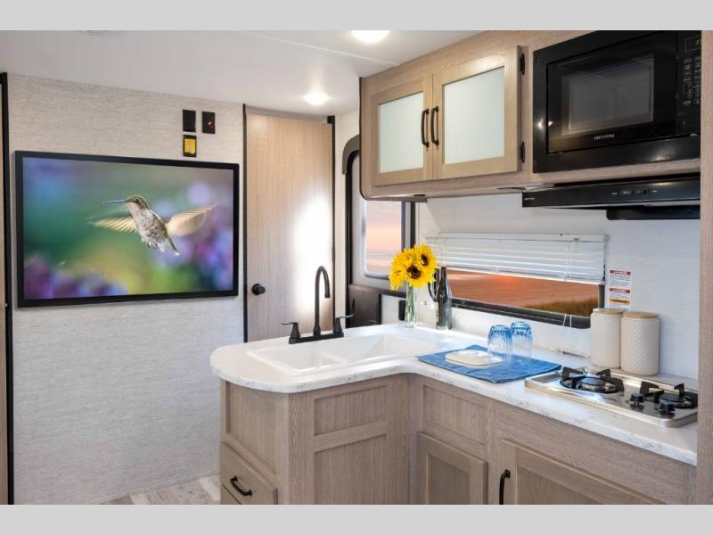 The Kingsport Lite travel trailers by Gulf Stream are the perfect RV for families wanting to start their camping lifestyle, but not break the bank. These lightweight units are built with a diamond plate lower front, a one-piece synthetic vinyl roof, and a uni-body construction with steel hurricane straps tying the walls to the floor for added durability. The front power hitch jack and four stabilizer jacks will make set-up hassle-free once you arrive at the campground, and you can put out the electric awning to rest in the shade when you're done. Each model includes convenient amenities, like the 13,500 BTU A/C, the tankless water heater, a central control panel, and multiple USB ports for your tablet, phone, and camera! The inside is designed to make you feel at home with radiant LED lighting, designer kitchen backsplash, pleated privacy shades, craft-made cabinetry, plus many more features. Start your RV lifestyle with an affordable, lightweight Kingsport Lite travel trailer today!