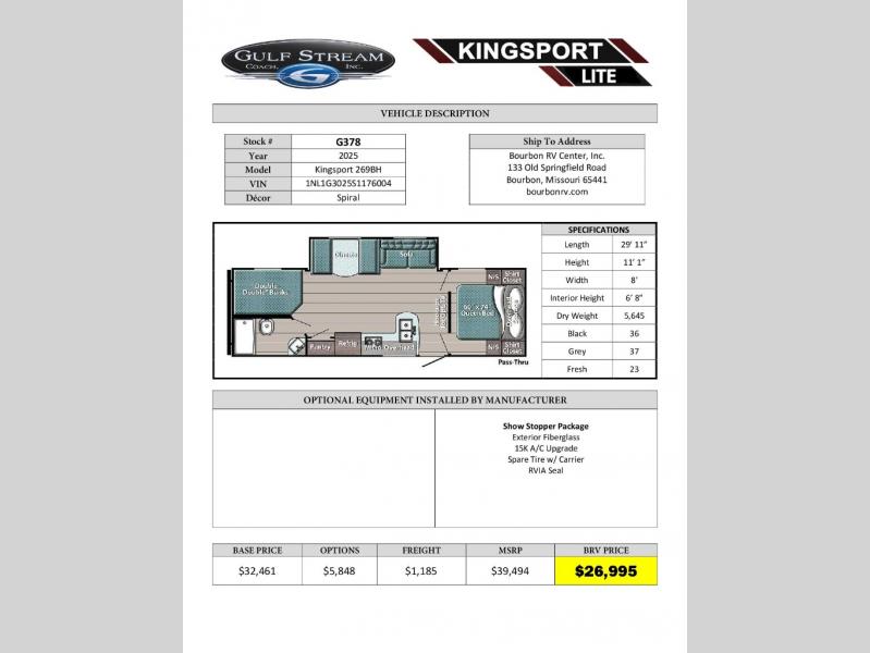 The Gulf Stream Kingsport Lite 269BH is the perfect budget-minded family-friendly bunkhouse! This rear bunk house sleeps up to 8. Bright, roomy, and open floorplan. Mom & Dad will love having a private front bedroom. Upgraded to include white exterior fiberglass for low maintenance and protection from hail damage. Backed by Gulf Stream's three-year warranty.