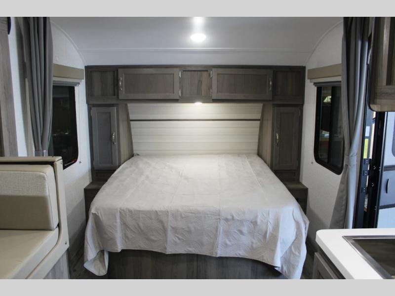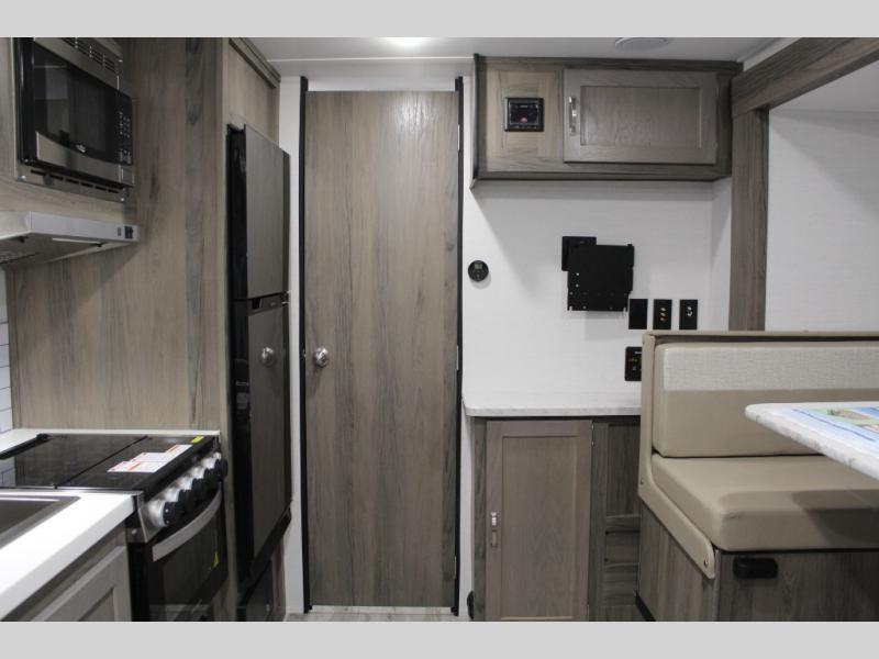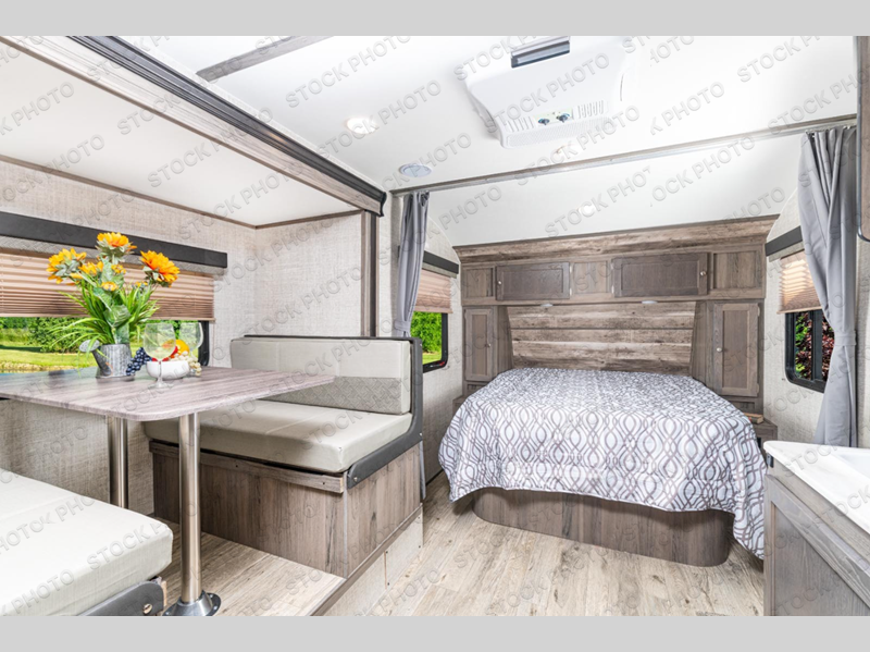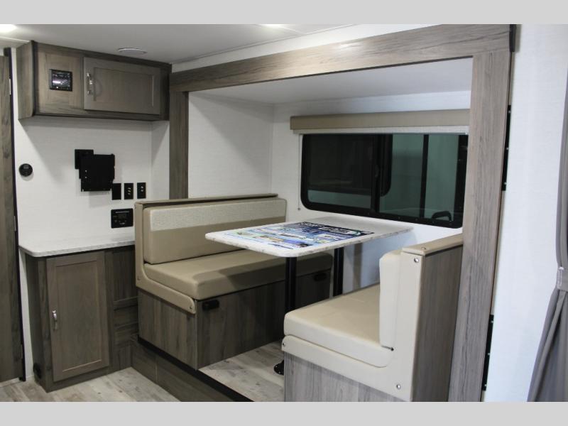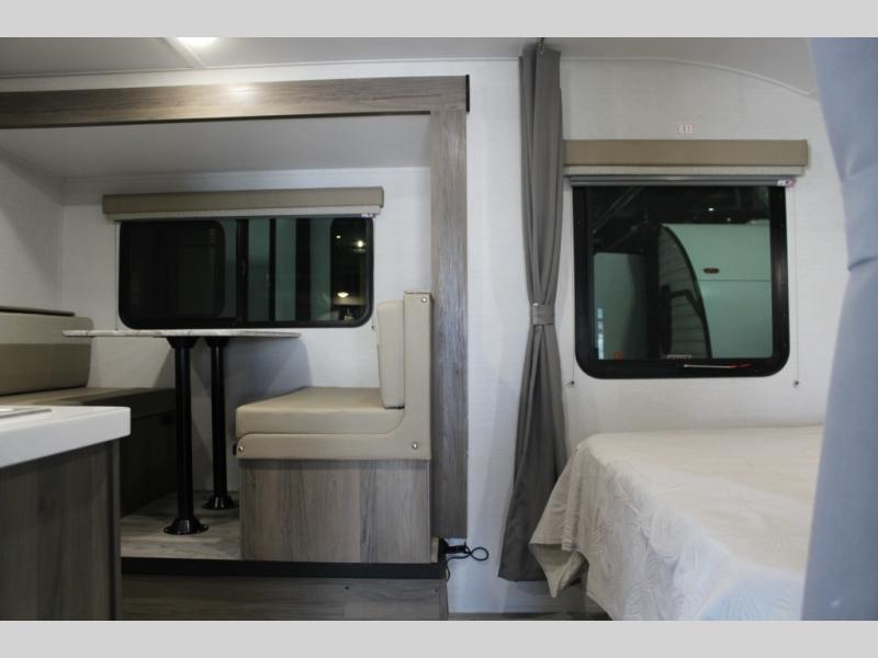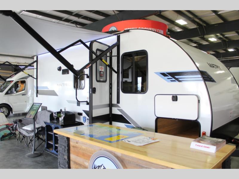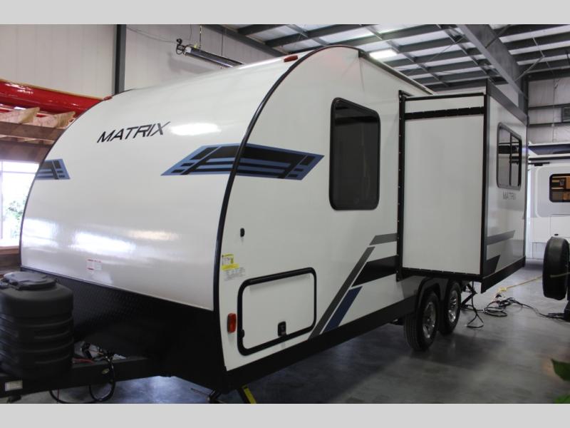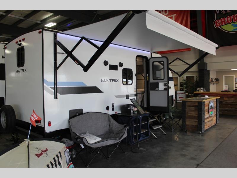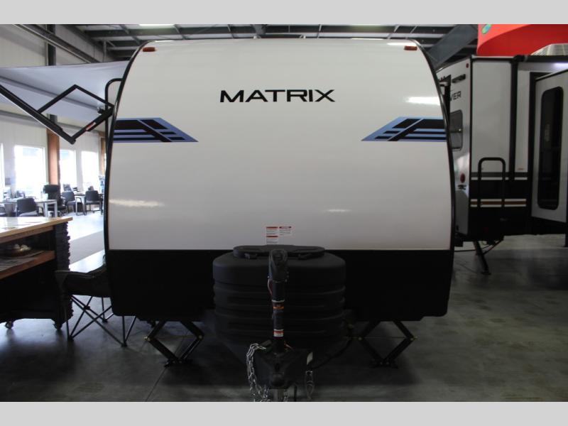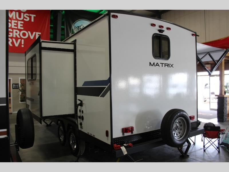 This Matrix SVT travel trailer is a lightweight companion that will travel with you to all of your favorite places! Before heading out, you'll want to stock up the 8 cubic foot 12V refrigerator with food, the dual shirt closets with your garments, the full rear bathroom medicine cabinet with your toiletries, and the exterior pass-through storage with your beach gear. You can invite a friend or two to come inside and play games at the booth dinette slide, or you can call it an early night and draw the privacy curtain before jumping into the 60" x 74" bed.