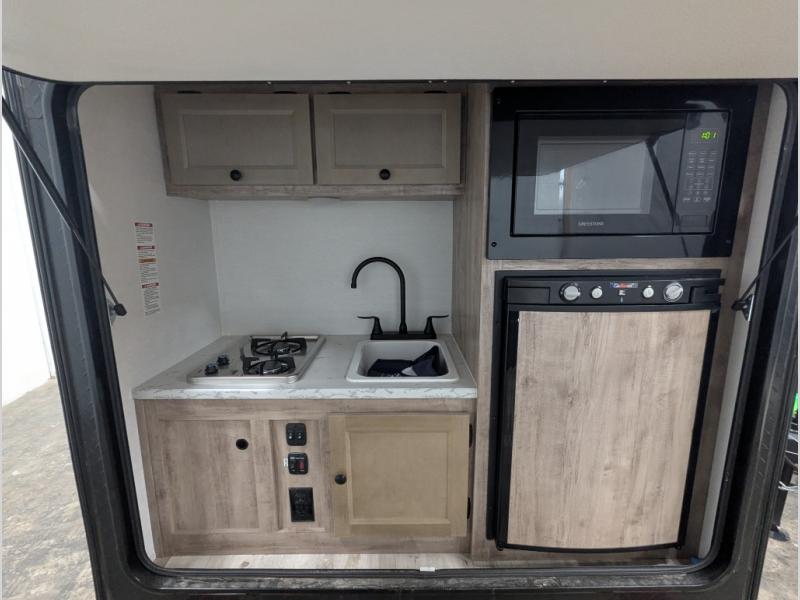 You and your spouse will have a great time in the woods with this teardrop trailer! Get a good night's rest each night when you set up the 76" x 54" bed and relax on it as a sofa during the day. There are hookups for an optional TV too and storage shelves to keep your items out of the way. The exterior kitchen has everything you need to prepare delicious home cooked meals like a gas/electric refrigerator, a microwave oven, a hot/cold sink, and a two burner gas cooktop to fry up the catch of the day. You even have an outside shower to rinse the mud off your feet!