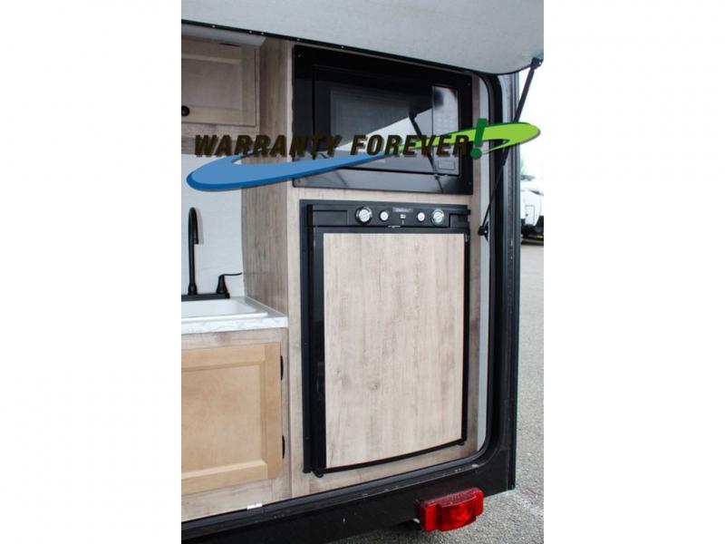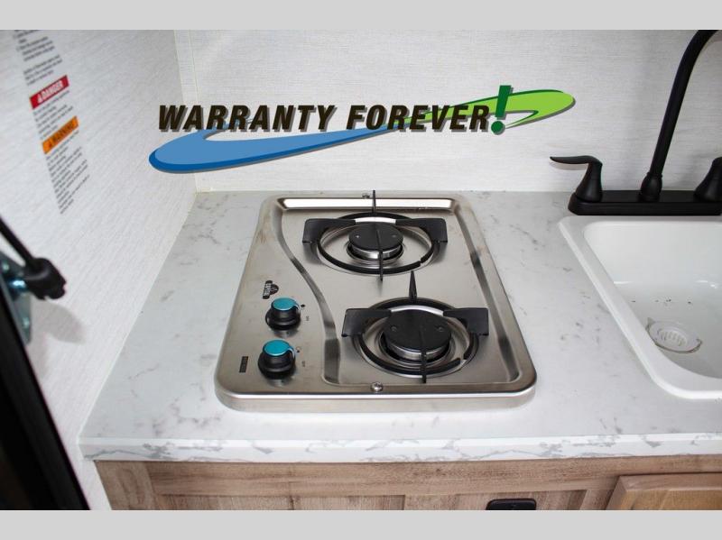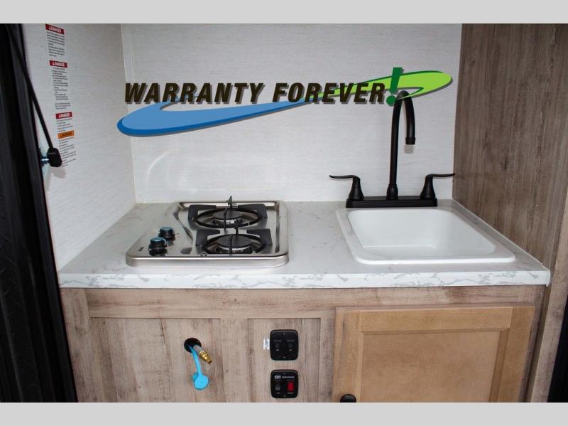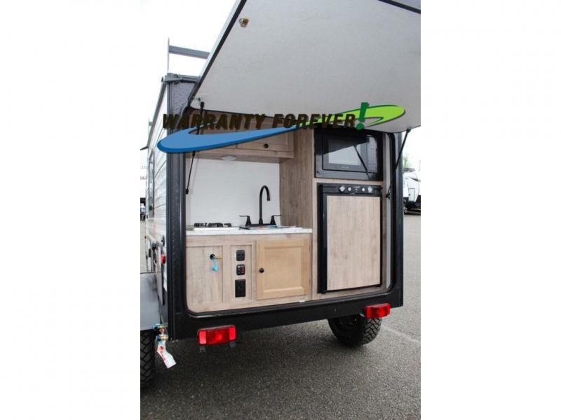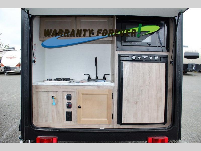 You and your spouse will have a great time in the woods with this teardrop trailer! Get a good night's rest each night when you set up the 76" x 54" bed and relax on it as a sofa during the day. There are hookups for an optional TV too and storage shelves to keep your items out of the way. The exterior kitchen has everything you need to prepare delicious home cooked meals like a gas/electric refrigerator, a microwave oven, a hot/cold sink, and a two burner gas cooktop to fry up the catch of the day. You even have an outside shower to rinse the mud off your feet!