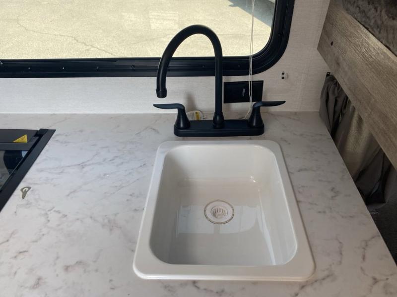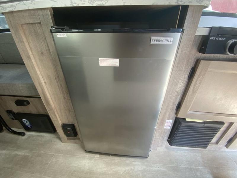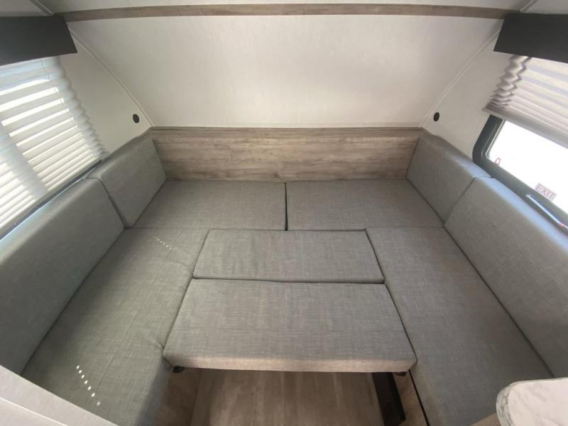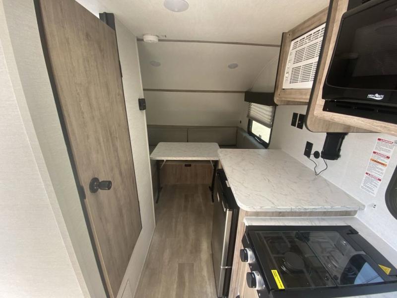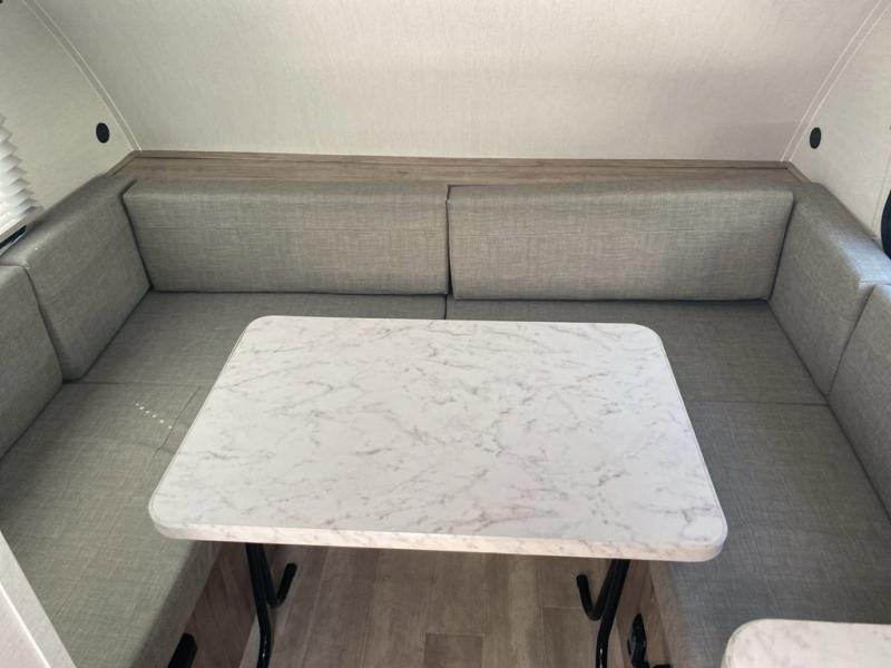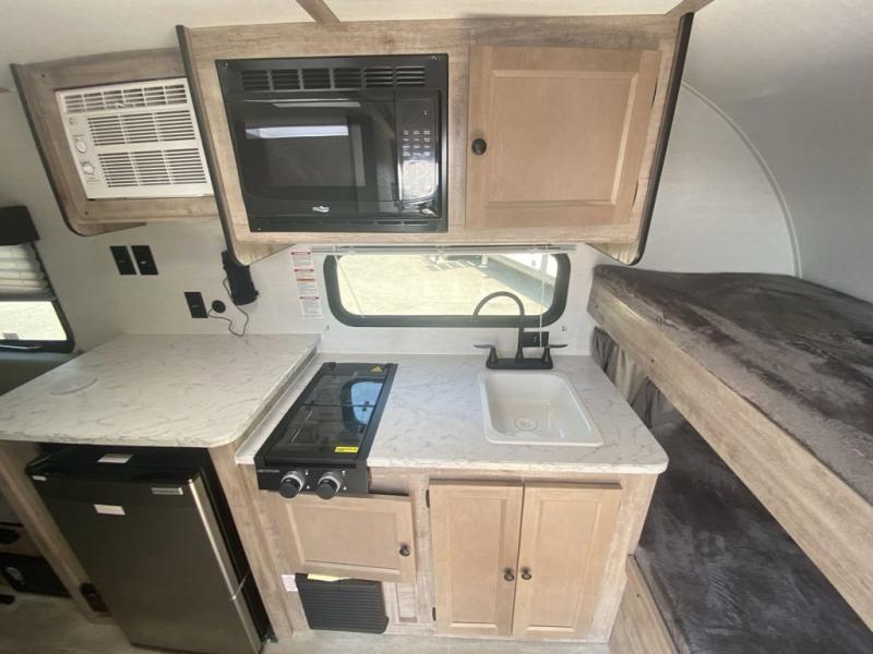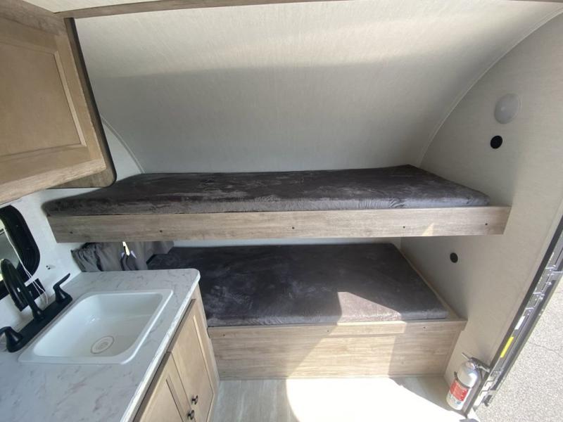 Wherever you decide to roam, you can enjoy at-home comforts with this teardrop trailer! The front bunk beds provide compact sleeping space, and the rear convertible U-shaped dinette will be perfect for eating, game night, and sleeping! A two burner gas cooktop with a glass cover and a microwave oven let you make meals each day, and the gas/electric refrigerator will keep your perishables fresh. You will also appreciate a convenient wet bath with this model, a TV mount if you want to add an optional TV, and a control panel for easy access to your units functions!
