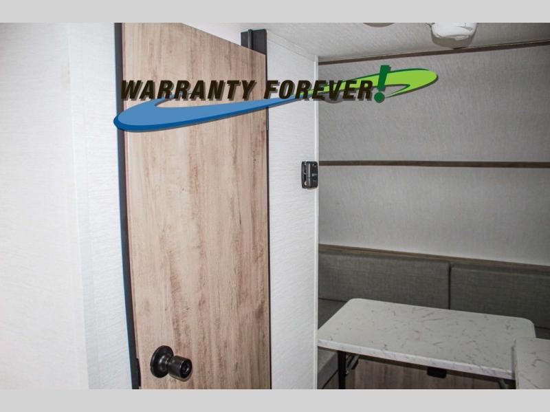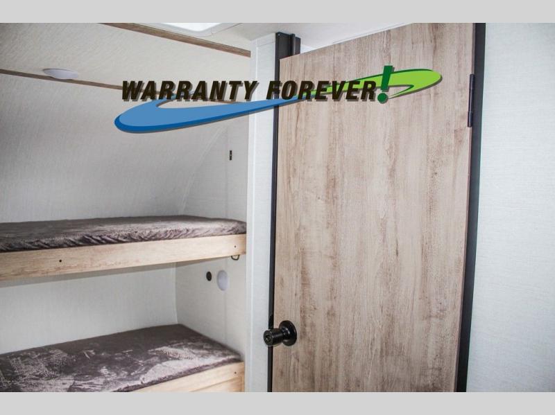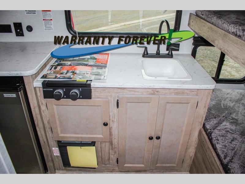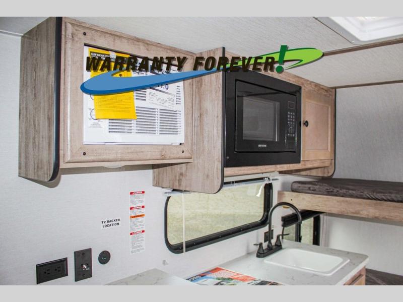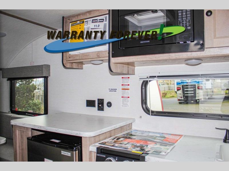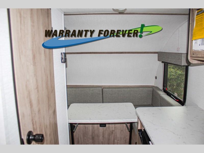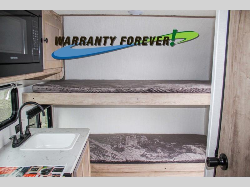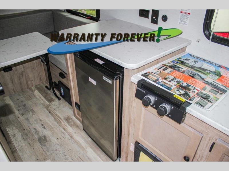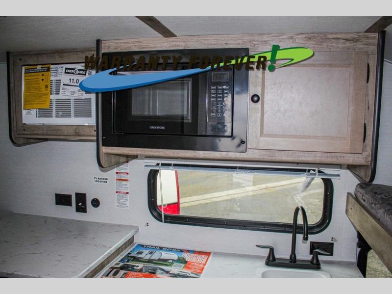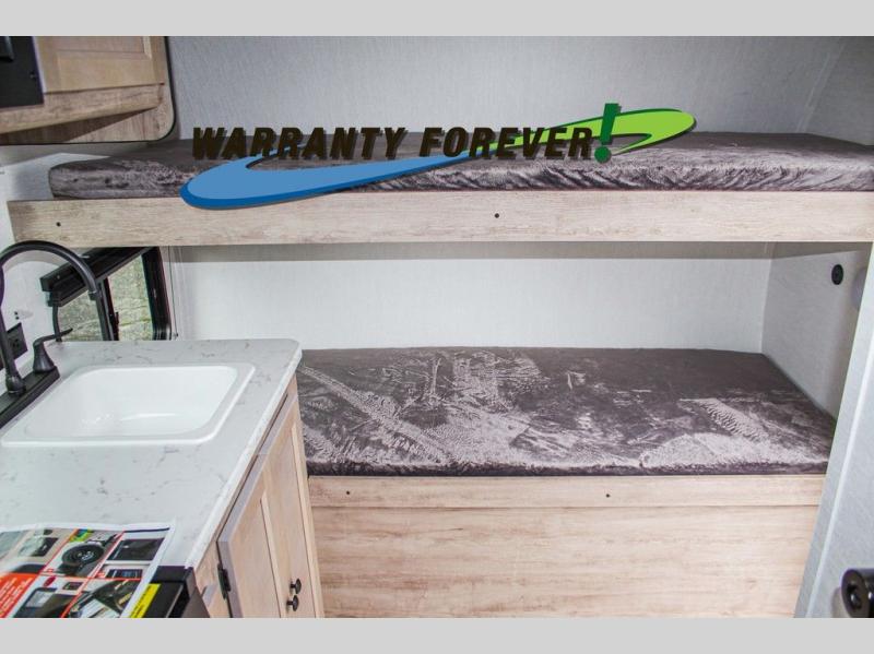 Wherever you decide to roam, you can enjoy at-home comforts with this teardrop trailer! The front bunk beds provide compact sleeping space, and the rear convertible U-shaped dinette will be perfect for eating, game night, and sleeping! A two burner gas cooktop with a glass cover and a microwave oven let you make meals each day, and the gas/electric refrigerator will keep your perishables fresh. You will also appreciate a convenient wet bath with this model, a TV mount if you want to add an optional TV, and a control panel for easy access to your units functions!