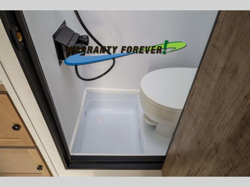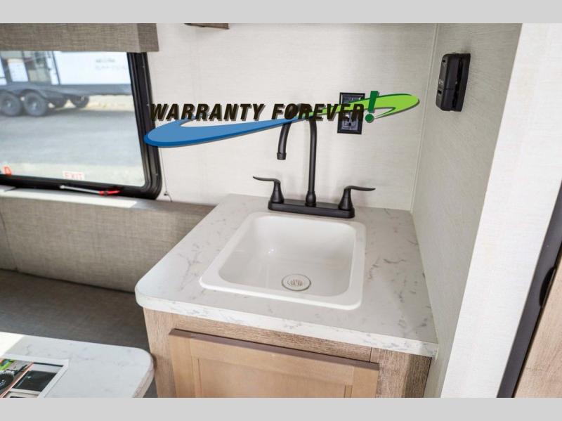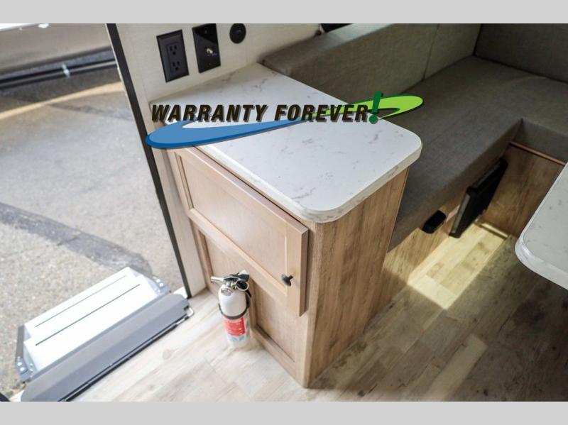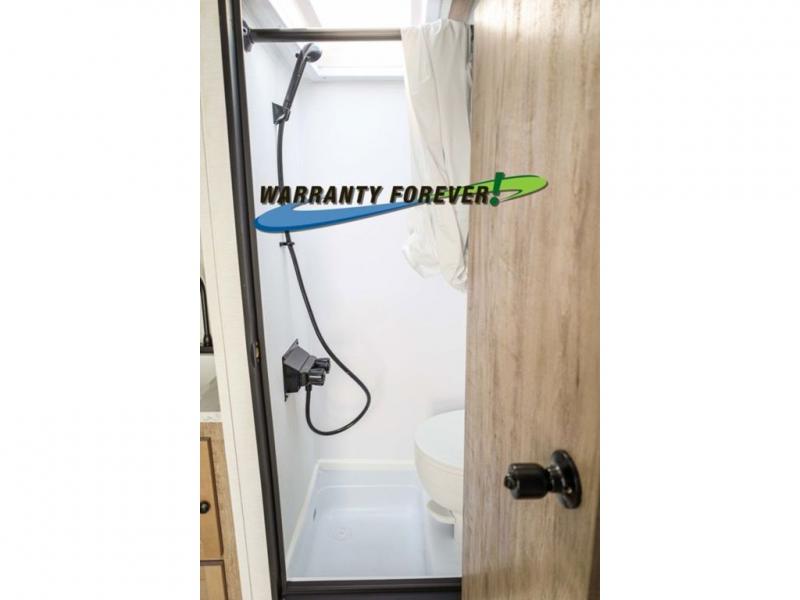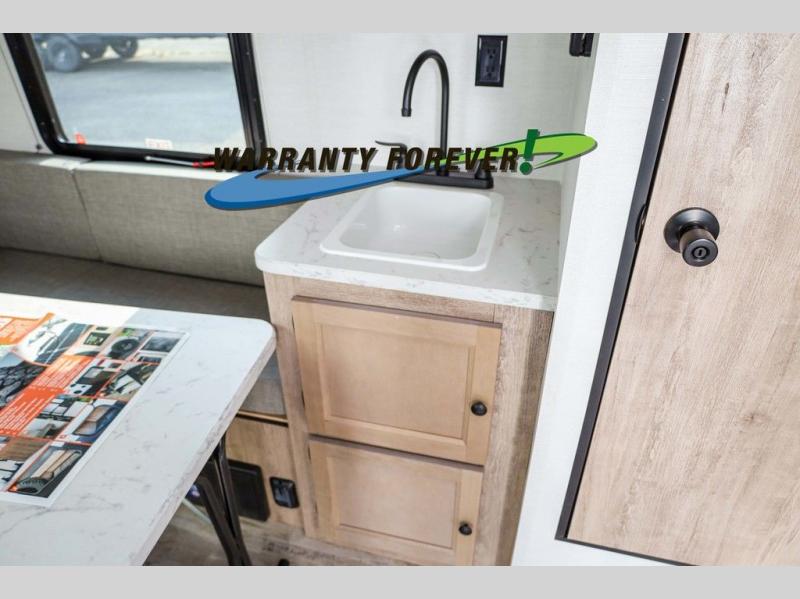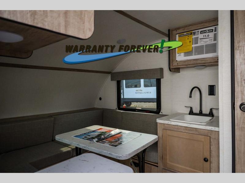 This teardrop trailer offers versatility! The rear U-shaped dinette is not only great for enjoying meals and playing games, but also for transforming into a bed to get a good night's rest. You can use the exterior 36" x 11" trunk for your outdoor gear and the overhead cabinets inside. After a fun day outside, head to the front corner bathroom to freshen up in the wet bath with a sliding door. The kitchen has everything you need to prepare delicious home cooked meals like a gas/electric under counter refrigerator, a microwave oven, a hot/cold sink, and a two burner gas cooktop with a glass cover to fry up the catch of the day. You even have an outside shower to rinse the mud off your feet!