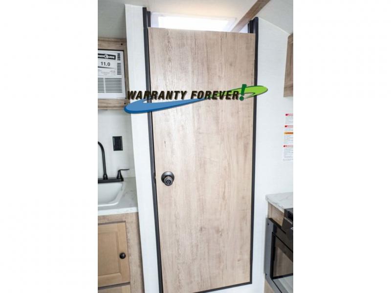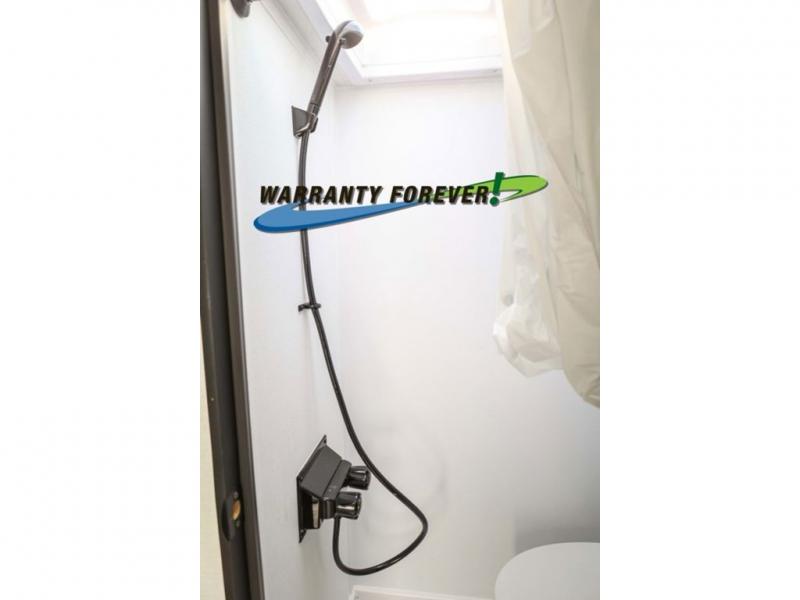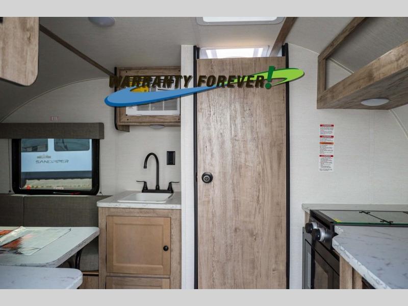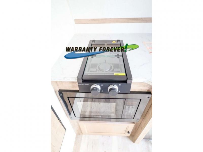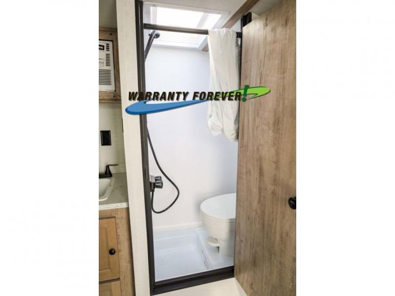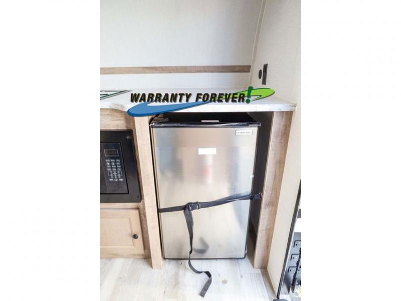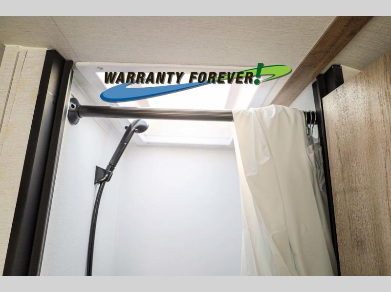 This teardrop trailer offers versatility! The rear U-shaped dinette is not only great for enjoying meals and playing games, but also for transforming into a bed to get a good night's rest. You can use the exterior 36" x 11" trunk for your outdoor gear and the overhead cabinets inside. After a fun day outside, head to the front corner bathroom to freshen up in the wet bath with a sliding door. The kitchen has everything you need to prepare delicious home cooked meals like a gas/electric under counter refrigerator, a microwave oven, a hot/cold sink, and a two burner gas cooktop with a glass cover to fry up the catch of the day. You even have an outside shower to rinse the mud off your feet!