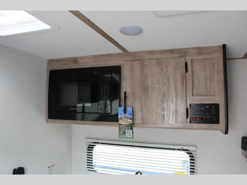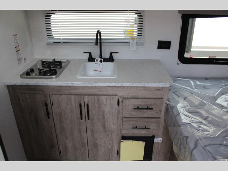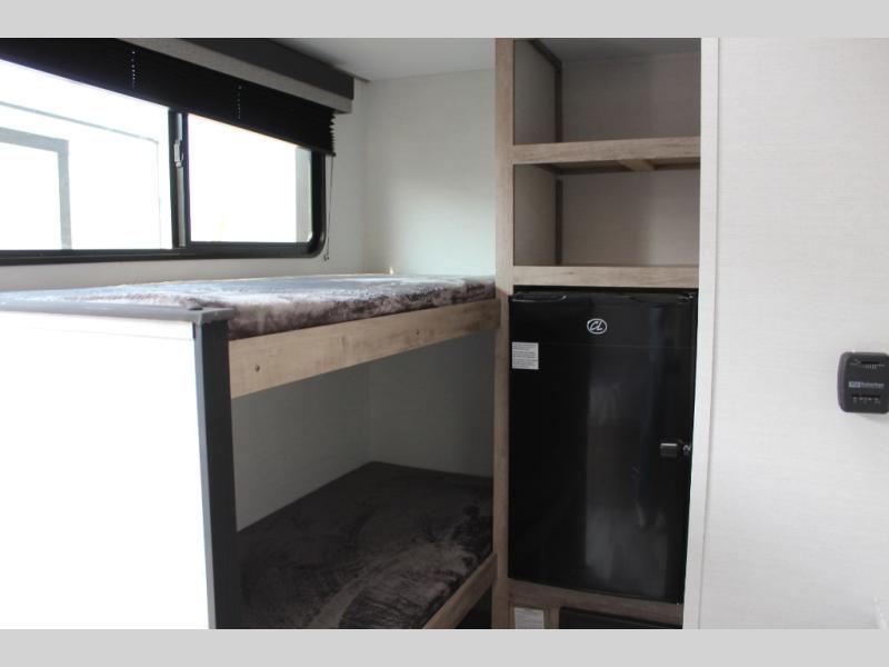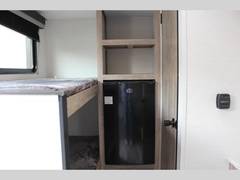 This travel trailer is ideal for families seeking adventure and relaxation! The incredible microwave and refrigerator simplify meal planning, while the two-burner cooktop lets you cook up delicious meals for the whole family. The bunk beds are a hit with kids, providing a fun and cozy sleeping space, while the comfortable bed is perfect for parents to unwind. Ample storage space is available, including flip-up storage and overhead shelves, keeping your belongings organized and within reach.