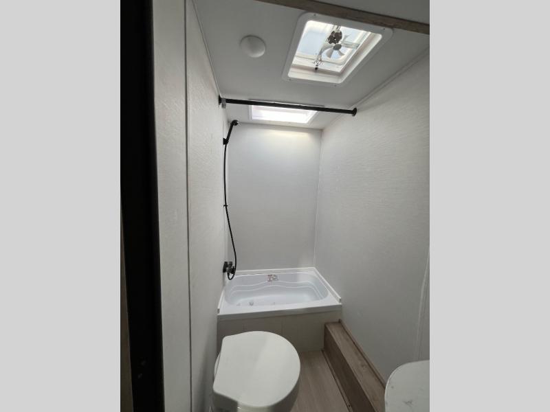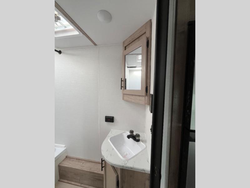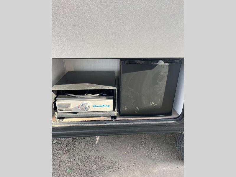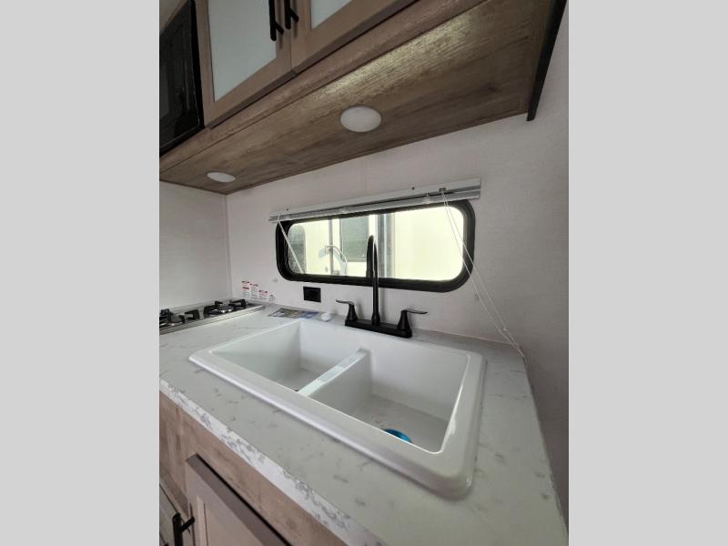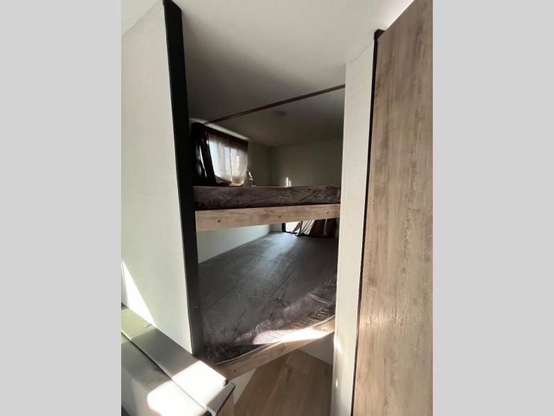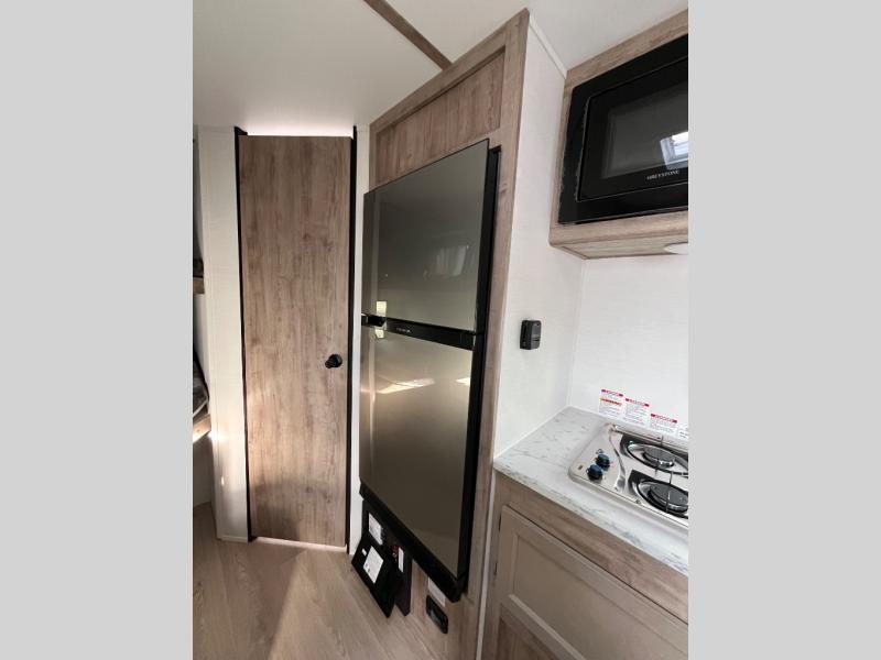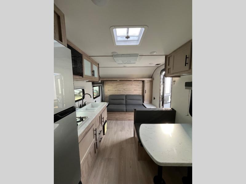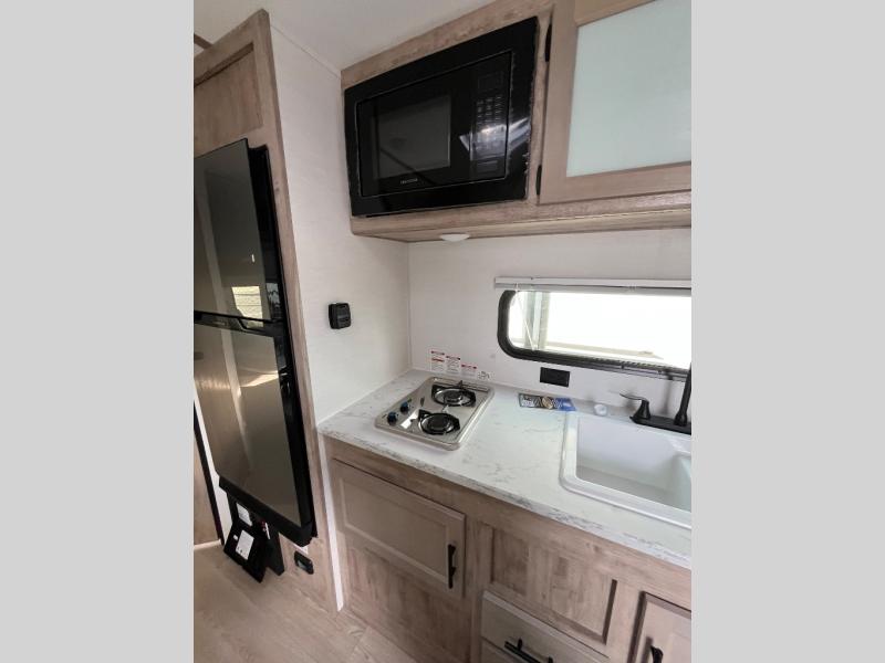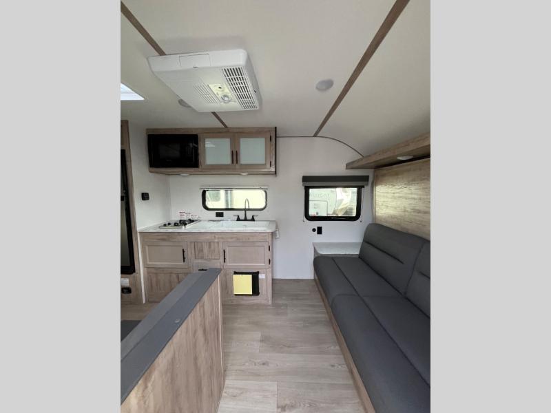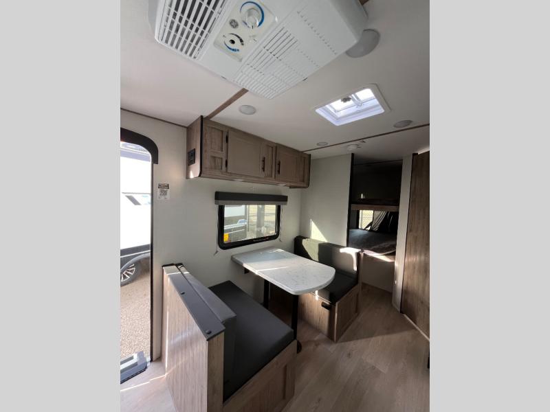 Family camping trips are easy in this convenient travel trailer. There is a versatile queen Murphy bed up front that will fold up during the day so you can relax on the sofa. Your guests can sleep on the double bed towards the back, and you can add the optional double bunk if you need more sleeping space. The chef of your group can make meals on the two burner cooktop or in the microwave oven, and there is a booth dinette to dine at. Don't forget to check out the pass-through storage that will allow you to bring along the fishing poles and hiking gear!