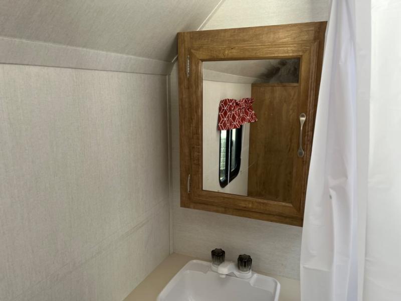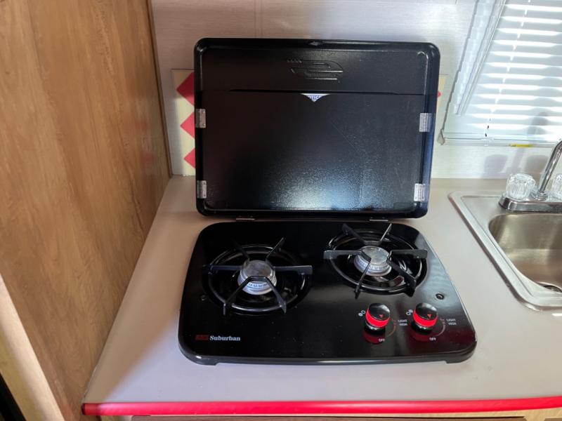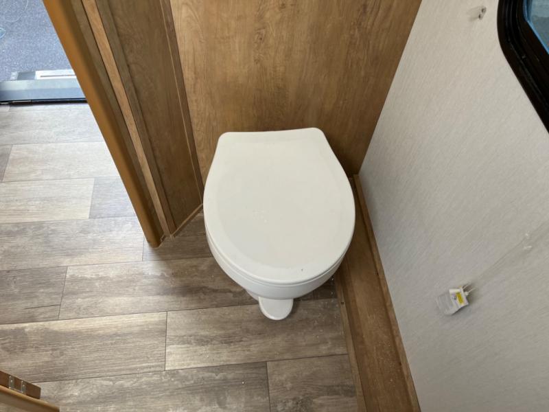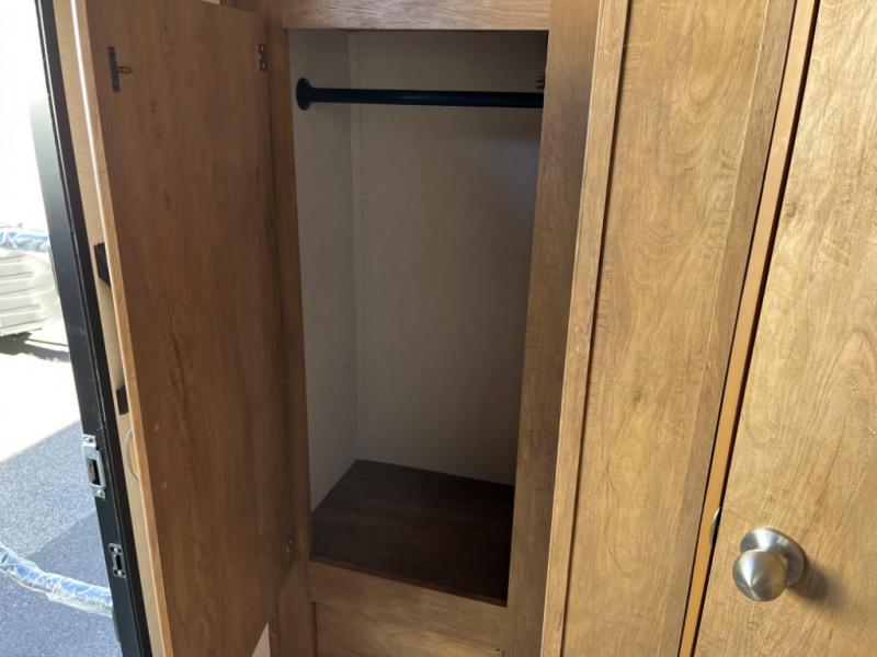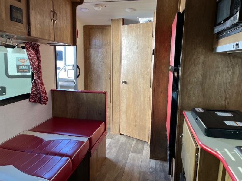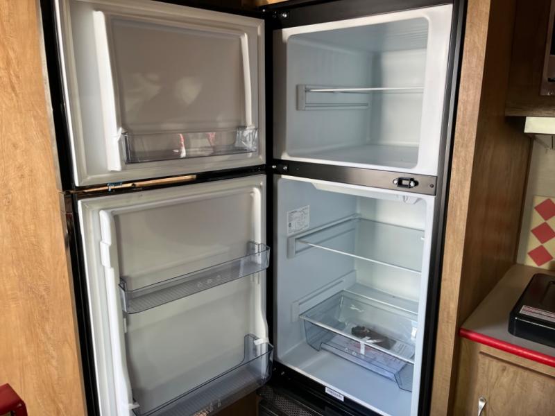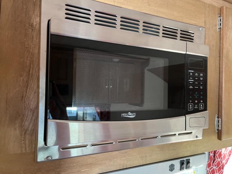 Make your camping trips memorable in this cozy travel trailer. Once you arrive at the campsite, you can unload the exterior pass-through storage, then head out on a trail to stretch your legs. The full bath will allow you to freshen up before dinner, and there is an entry closet with shelves to put your shoes and jackets up. A two burner cooktop and microwave oven comes standard, plus you'll find an 8 cu. ft. 12V refrigerator for your perishables. When it's time to call it a night, you'll enjoy the 54" x 74" front corner bed, while your overnight guest sleeps on the booth dinette!