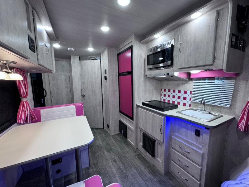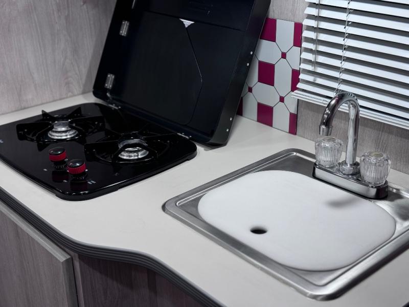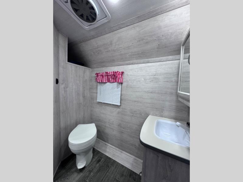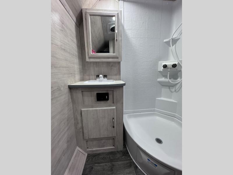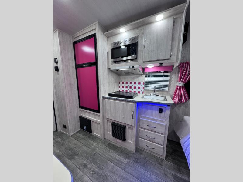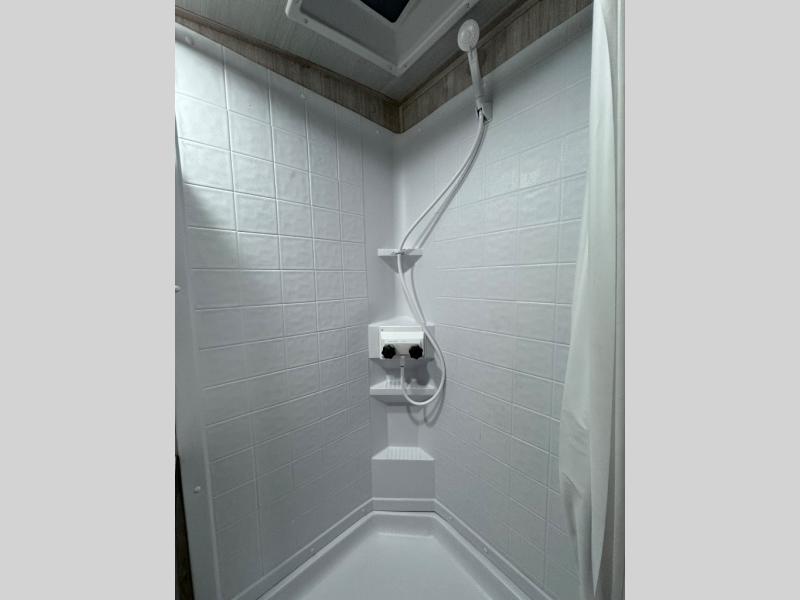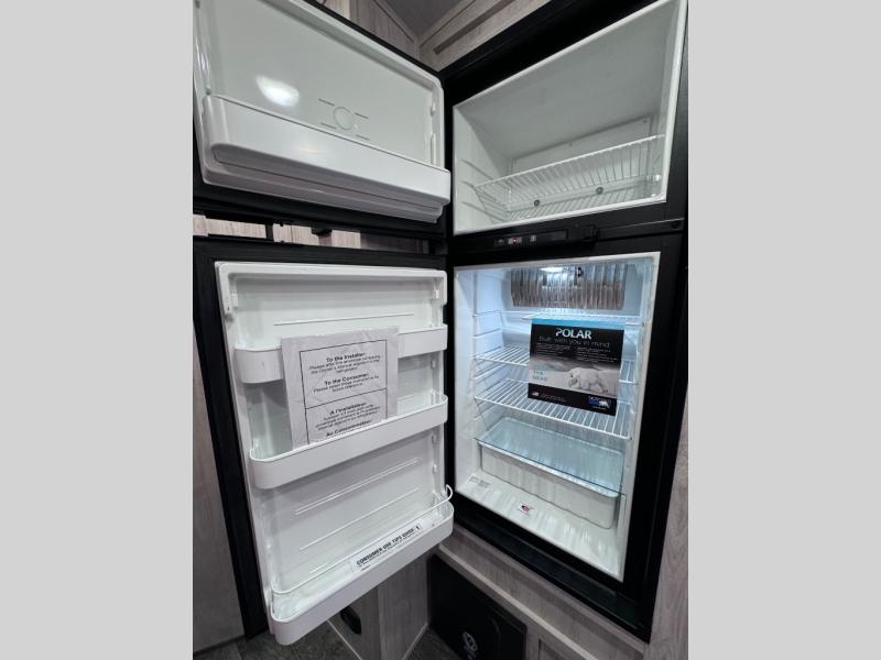 Make your camping trips memorable in this cozy travel trailer. Once you arrive at the campsite, you can unload the exterior pass-through storage, then head out on a trail to stretch your legs. The full bath will allow you to freshen up before dinner, and there is an entry closet with shelves to put your shoes and jackets up. A two burner cooktop and microwave oven comes standard, plus you'll find an 8 cu. ft. 12V refrigerator for your perishables. When it's time to call it a night, you'll enjoy the 54" x 74" front corner bed, while your overnight guest sleeps on the booth dinette!