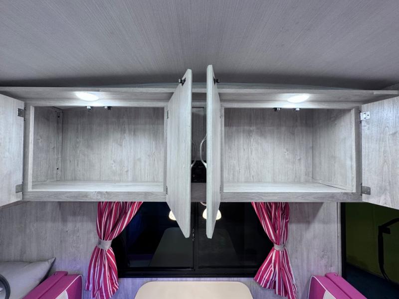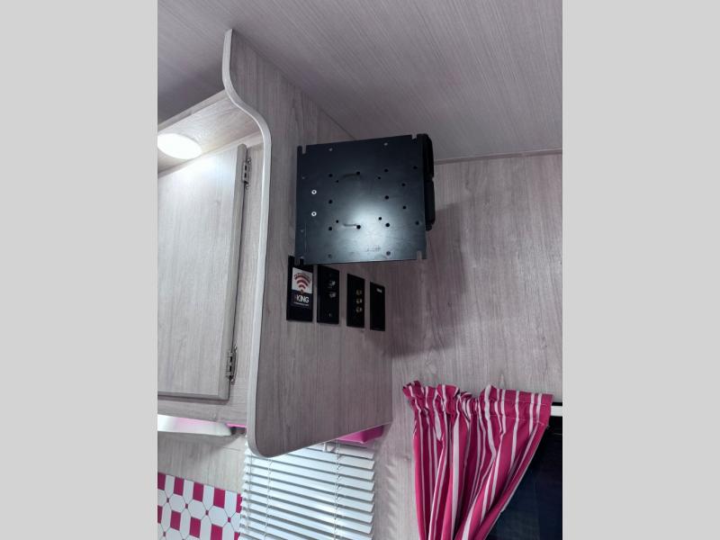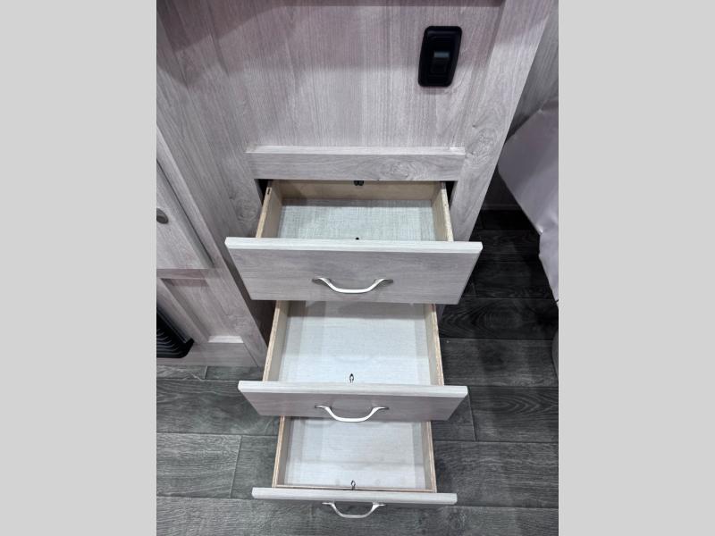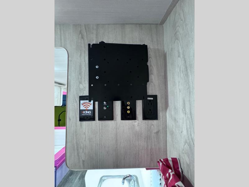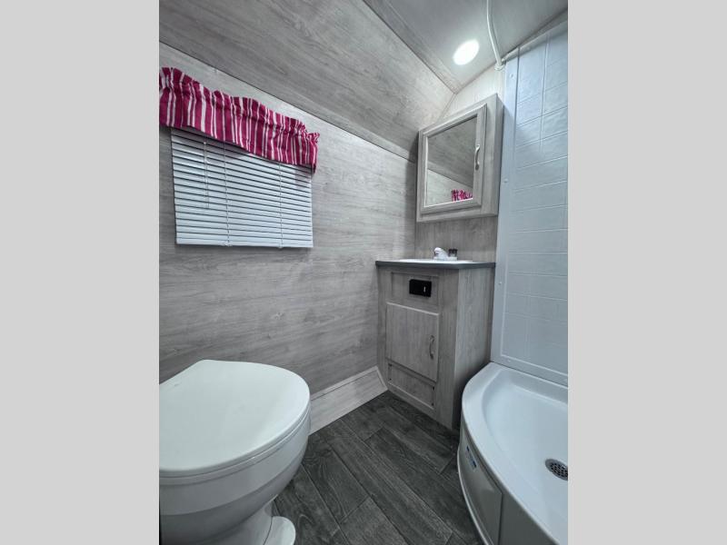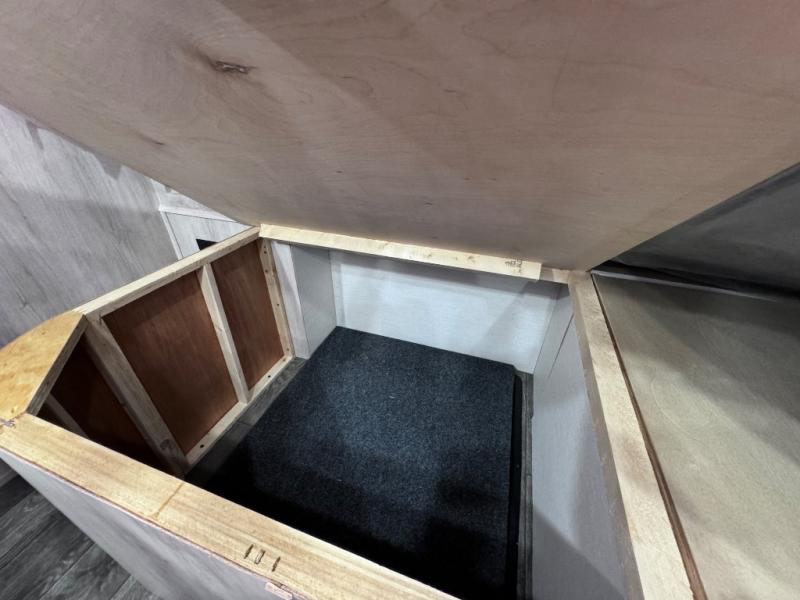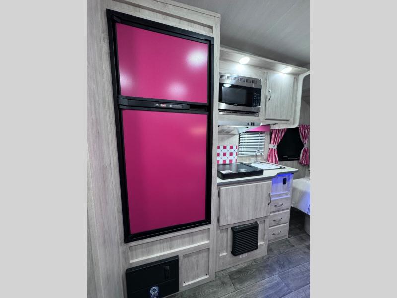 Make your camping trips memorable in this cozy travel trailer. Once you arrive at the campsite, you can unload the exterior pass-through storage, then head out on a trail to stretch your legs. The full bath will allow you to freshen up before dinner, and there is an entry closet with shelves to put your shoes and jackets up. A two burner cooktop and microwave oven comes standard, plus you'll find an 8 cu. ft. 12V refrigerator for your perishables. When it's time to call it a night, you'll enjoy the 54" x 74" front corner bed, while your overnight guest sleeps on the booth dinette!
