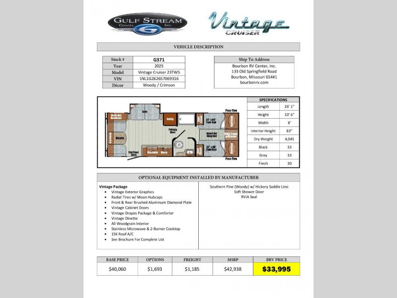 A truly stylish camper! Upgraded with the Woody Package and South Pine packages... this RV truly is "retro-cool" at its finest! The Gulf Stream Vintage Cruiser 23TWS is a rear dinette floorplan that also includes a slideout with a sleeper sofa.
