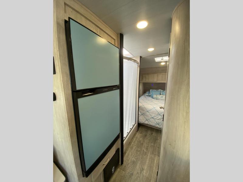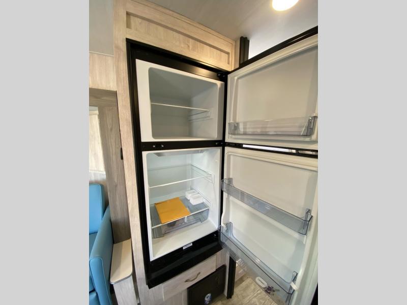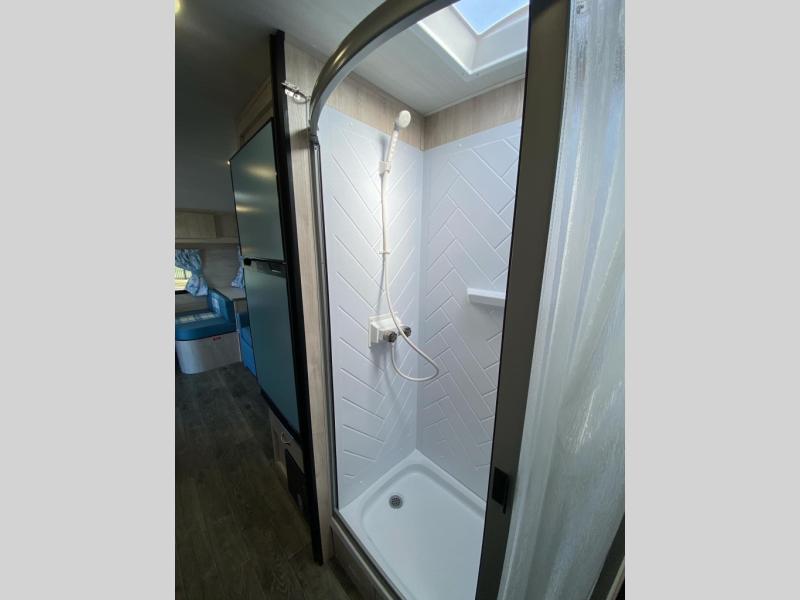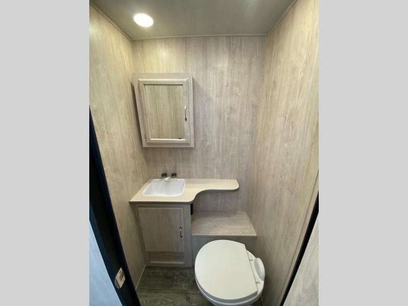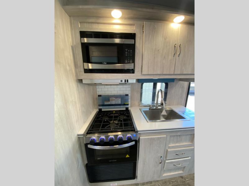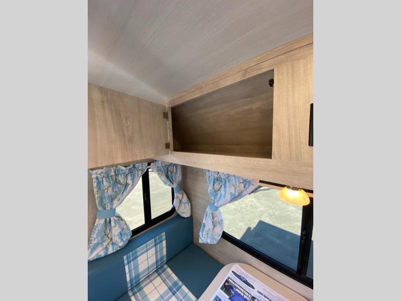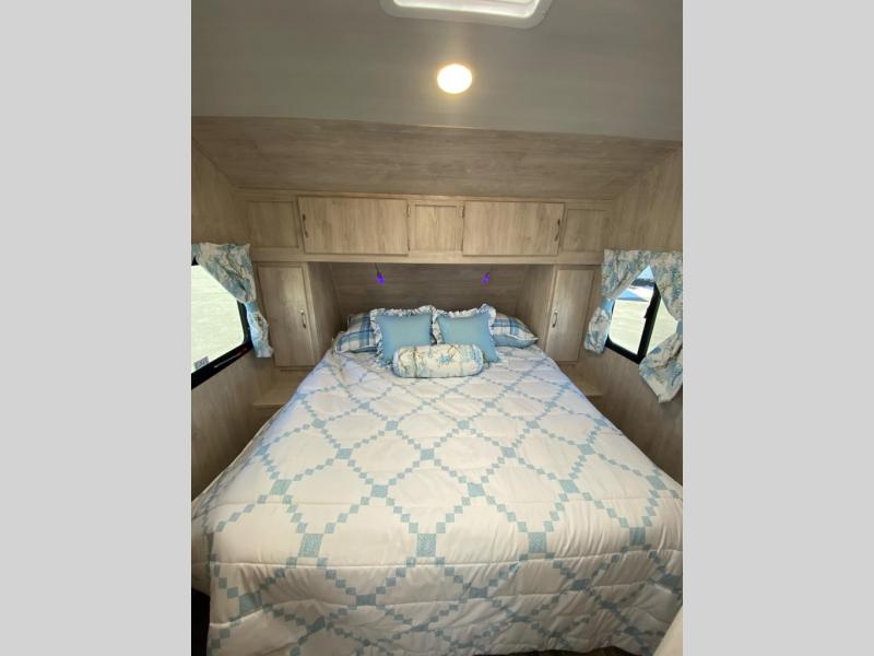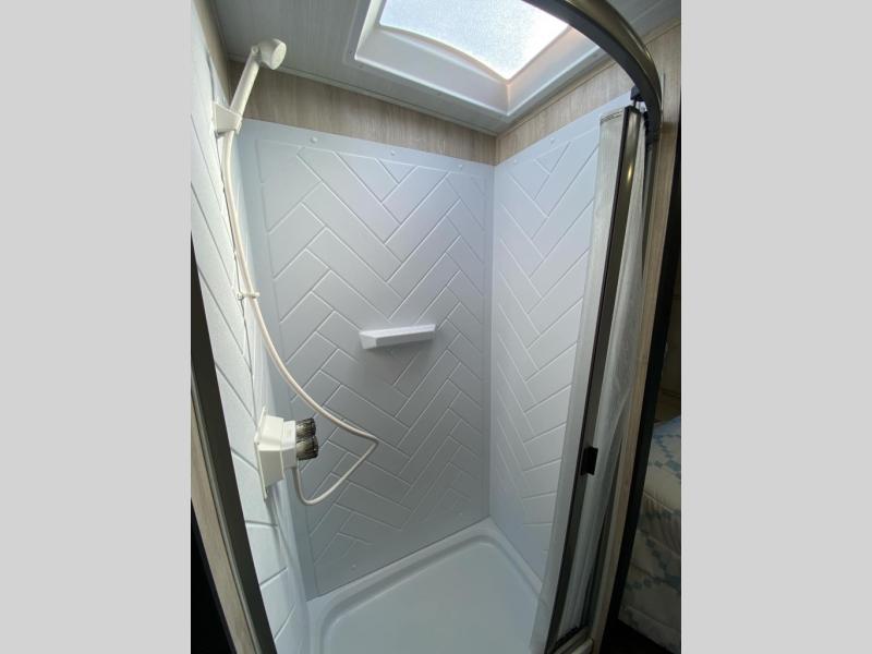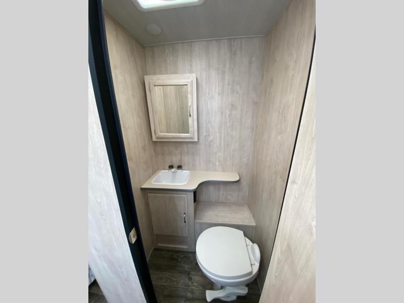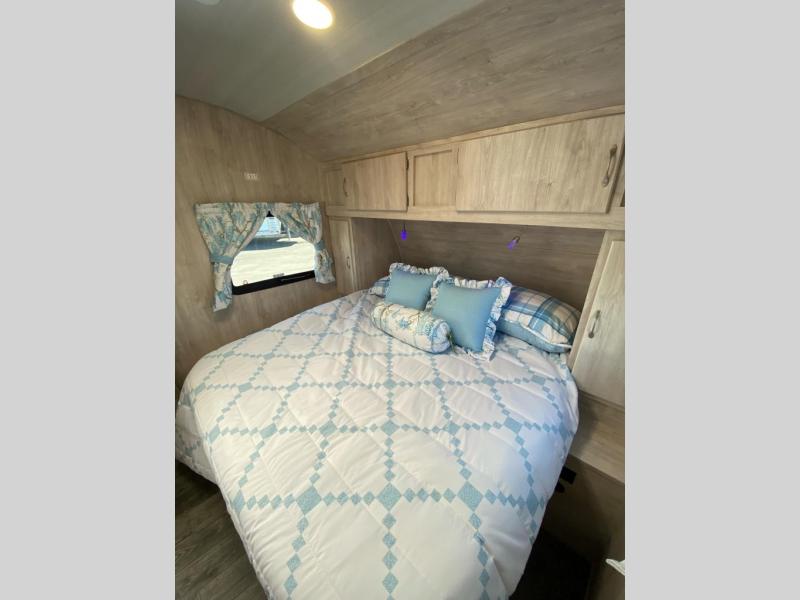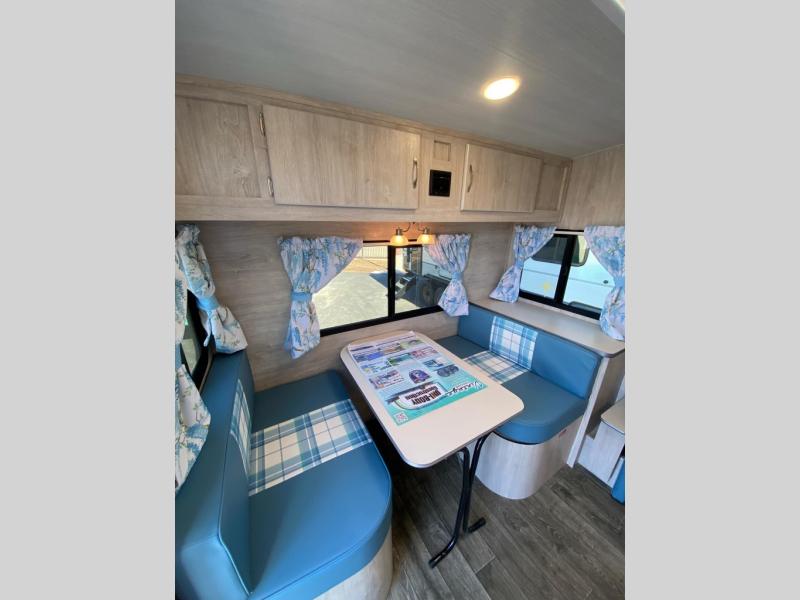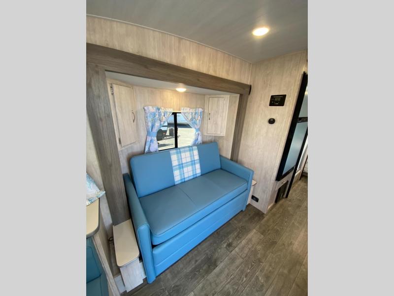 Step into comfort with this classic travel trailer in tow. You will find a rear vintage booth dinette and a sofa slide out with end tables to set your drinks on. The kitchen is complete with a microwave oven, cooktop, plus overhead cabinets for your belongings. After a day outdoors, you can clean up in the 24" x 36" shower, and there is a private toilet and sink across the hall if someone needs to use it while you're cleaning up. This model will feel just like home with its RV queen bed and dual shirt closets for your clothes.