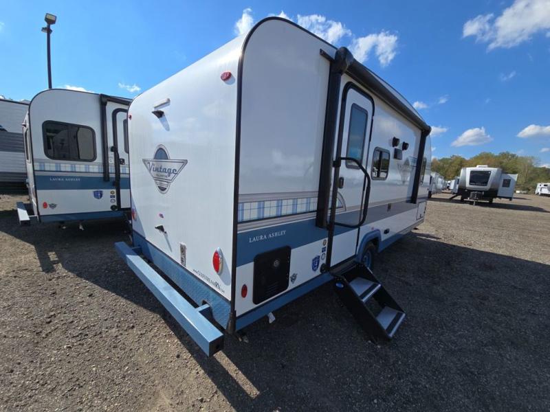 With any Vintage Yellowstone travel trailer by Gulf Stream, you will be taken back to the fun of the 50's with vintage Laura Ashley plaid exterior graphics and Laura Ashley timeless British designs. Each model is constructed with laminated fiberglass sidewalls with a layer of composite substrate, a one-piece fiberglass roof, and a lightweight welded aluminum frame. The Vintage Yellowstone travel trailers include high-performance vinyl flooring, an all-woodgrain interior and a solid surface countertop. There is also a Laura Ashley comforter with pillow shams and a Laura Ashley textiles package you are sure to love. A tankless water heater will provide endless hot showers, and a 100-watt roof-mounted solar panel will provide off-grid capabilities!
