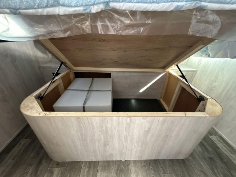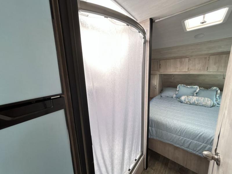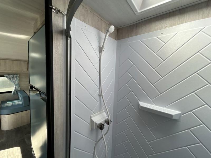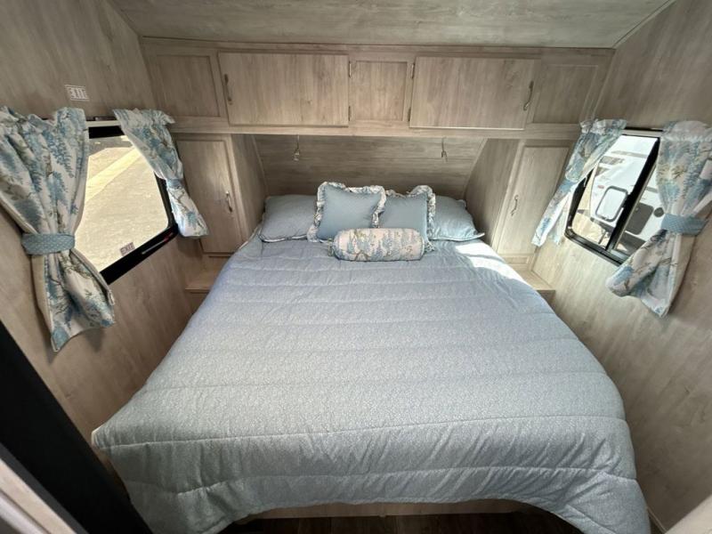 Step into comfort with this classic travel trailer in tow. You will find a rear vintage booth dinette and a sofa slide out with end tables to set your drinks on. The kitchen is complete with a microwave oven, cooktop, plus overhead cabinets for your belongings. After a day outdoors, you can clean up in the 24" x 36" shower, and there is a private toilet and sink across the hall if someone needs to use it while you're cleaning up. This model will feel just like home with its RV queen bed and dual shirt closets for your clothes.