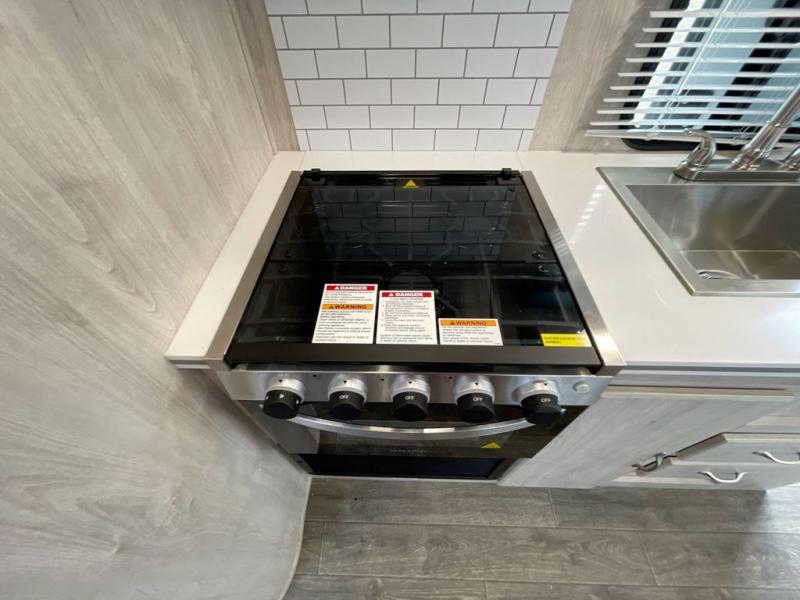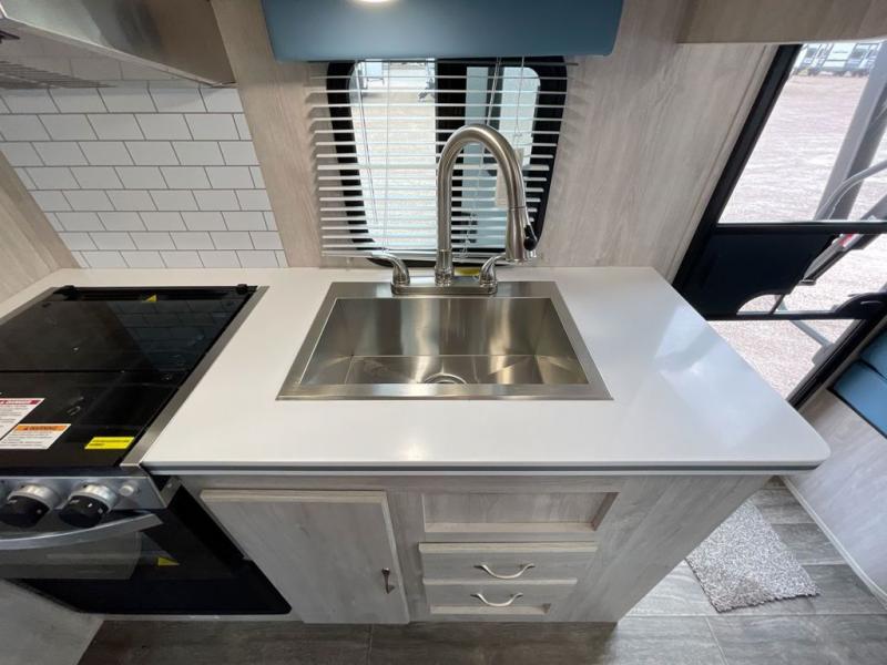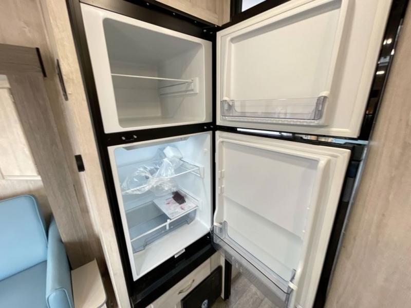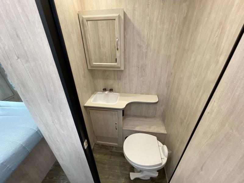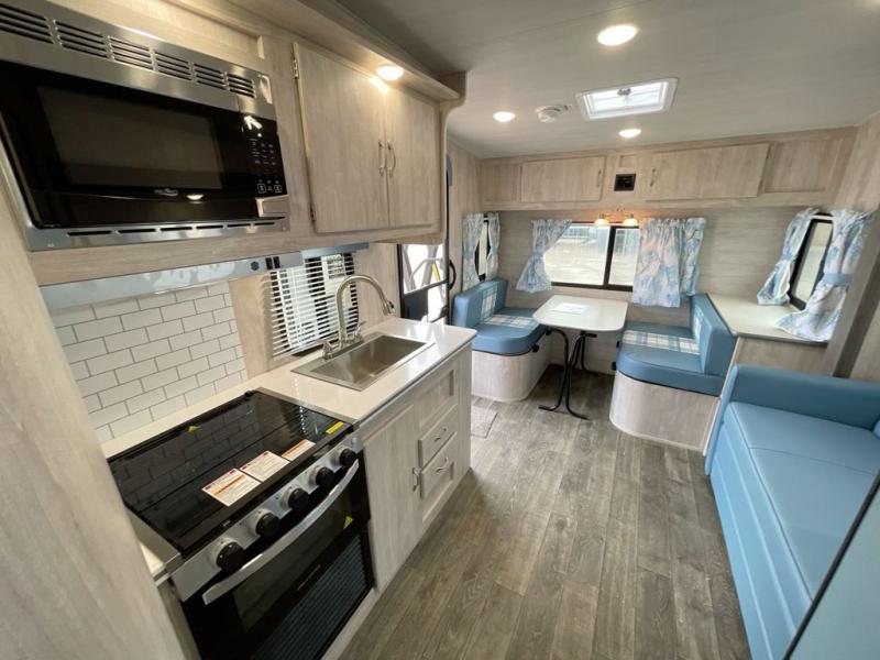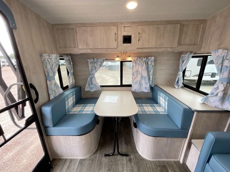 Step into comfort with this classic travel trailer in tow. You will find a rear vintage booth dinette and a sofa slide out with end tables to set your drinks on. The kitchen is complete with a microwave oven, cooktop, plus overhead cabinets for your belongings. After a day outdoors, you can clean up in the 24" x 36" shower, and there is a private toilet and sink across the hall if someone needs to use it while you're cleaning up. This model will feel just like home with its RV queen bed and dual shirt closets for your clothes.