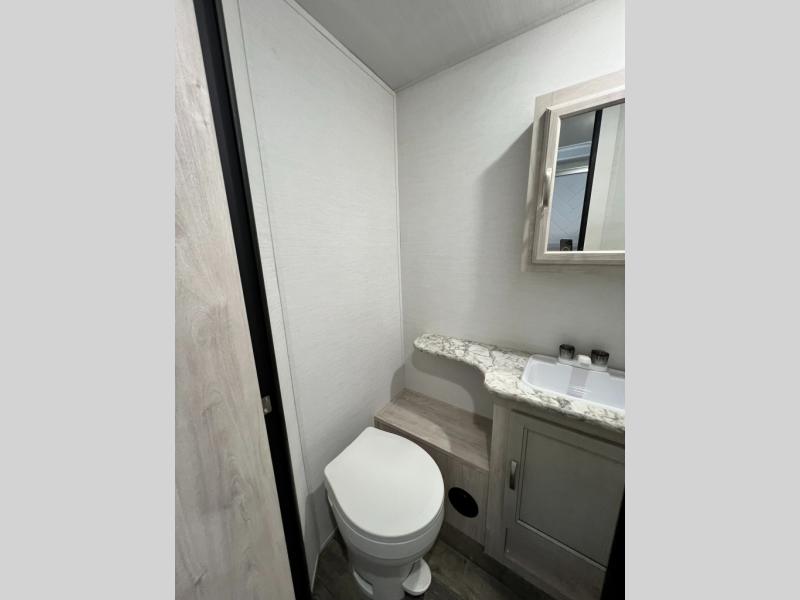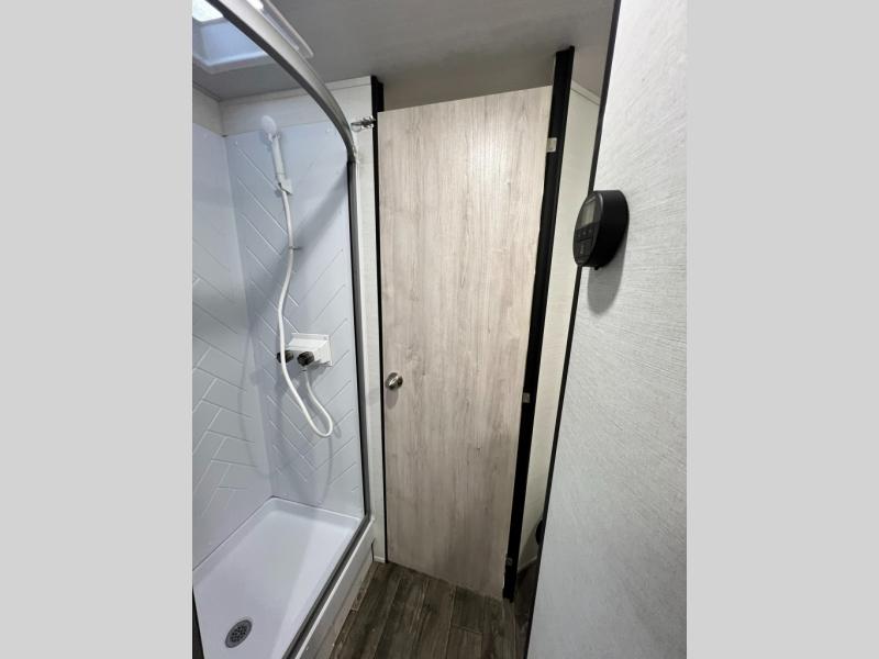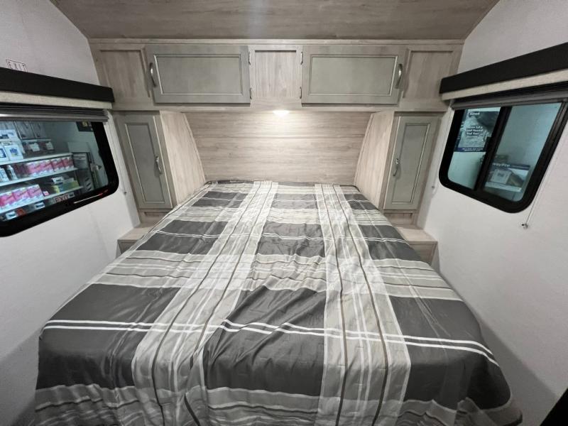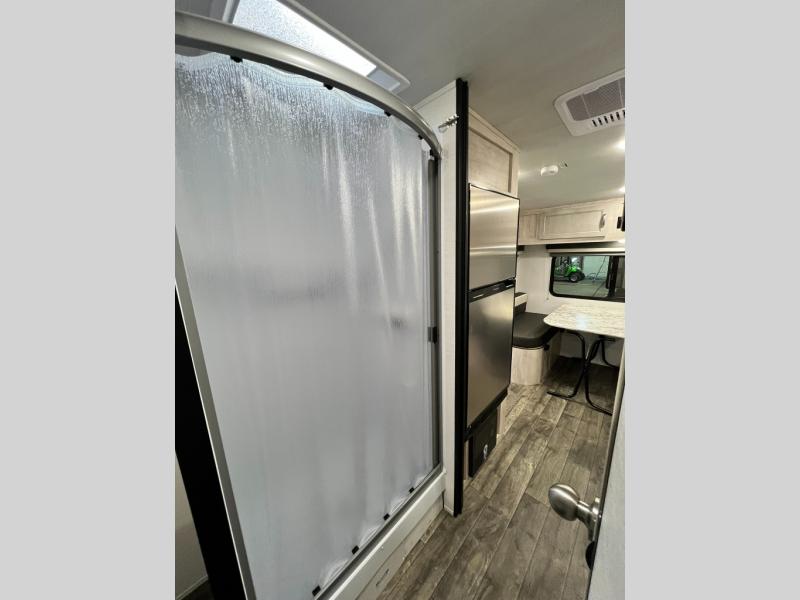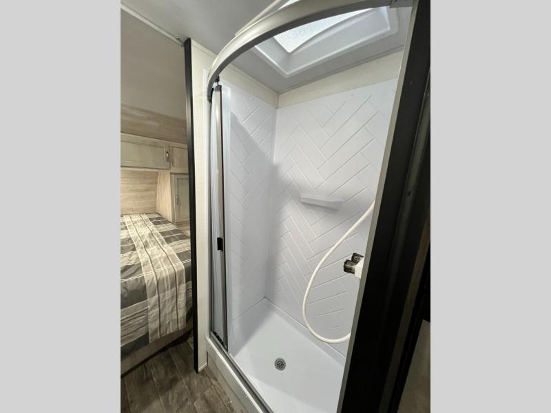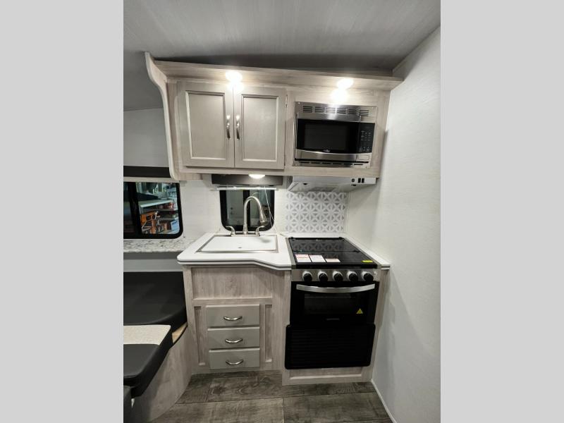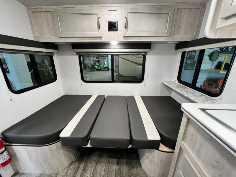 You will feel right at home in this travel trailer with the front queen bed that has privacy curtains to draw at night and shirt closets! The separated bathroom makes it easy for one to take a hot shower while another washes up for dinner. You can prepare delicious home cooked meals with the three burner cooktop and enjoy them at the rear booth dinette. The dinette can also transform into an extra sleeping space and there is a TV mount location diagonal to it also!