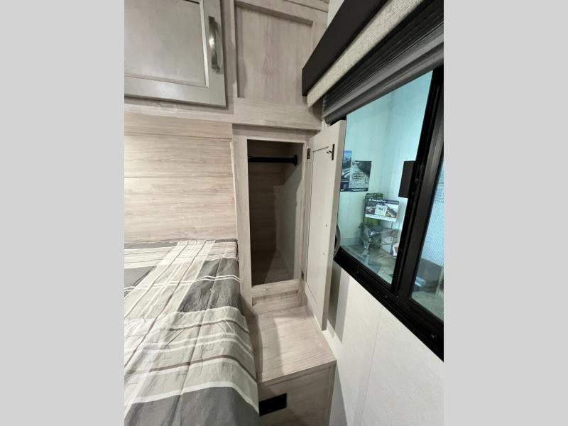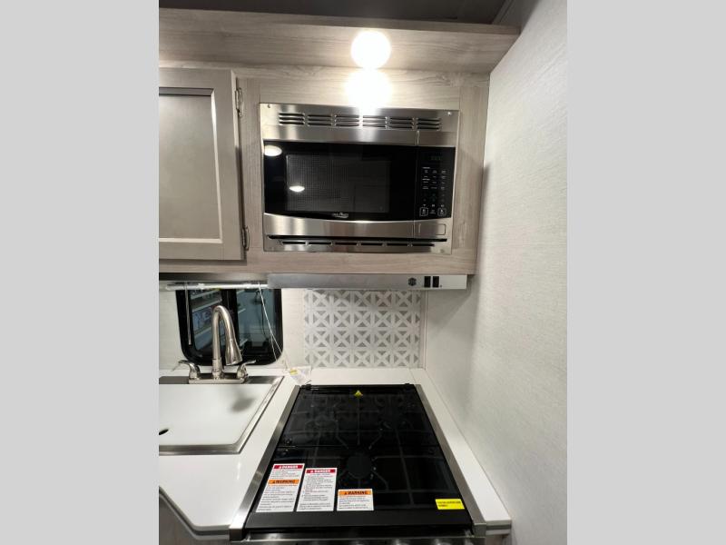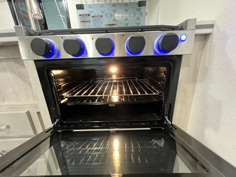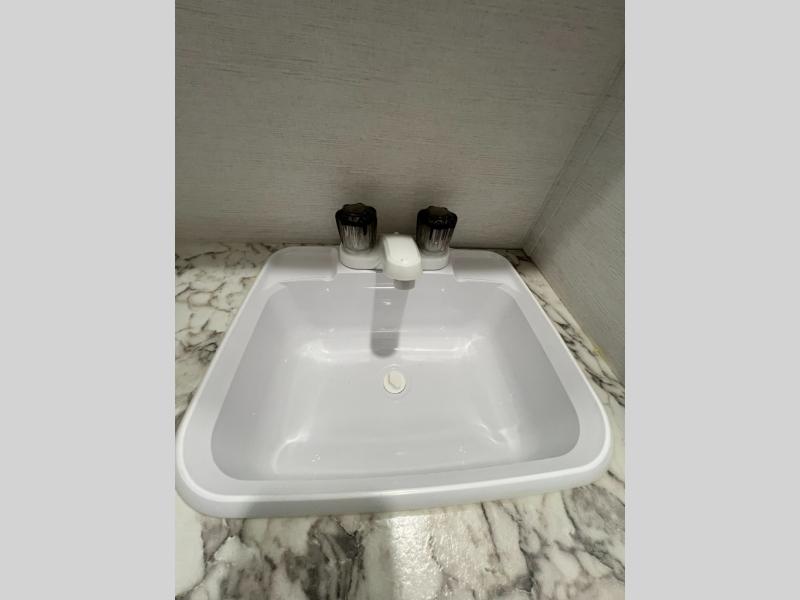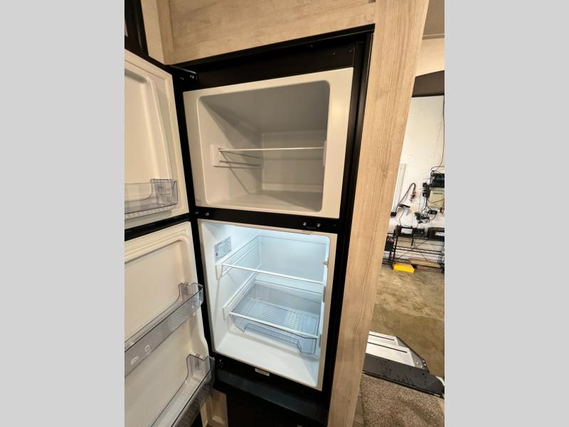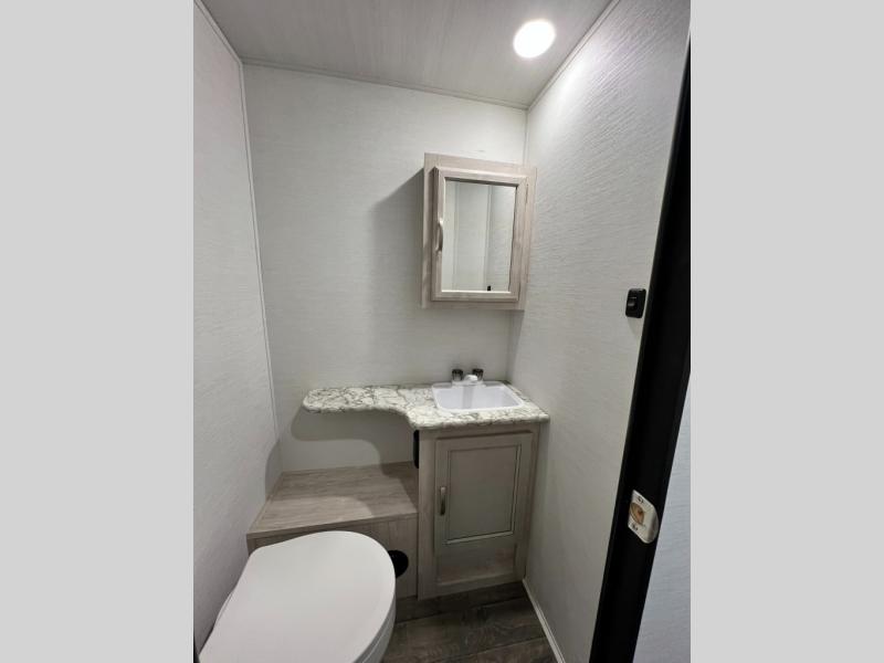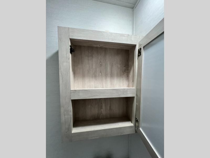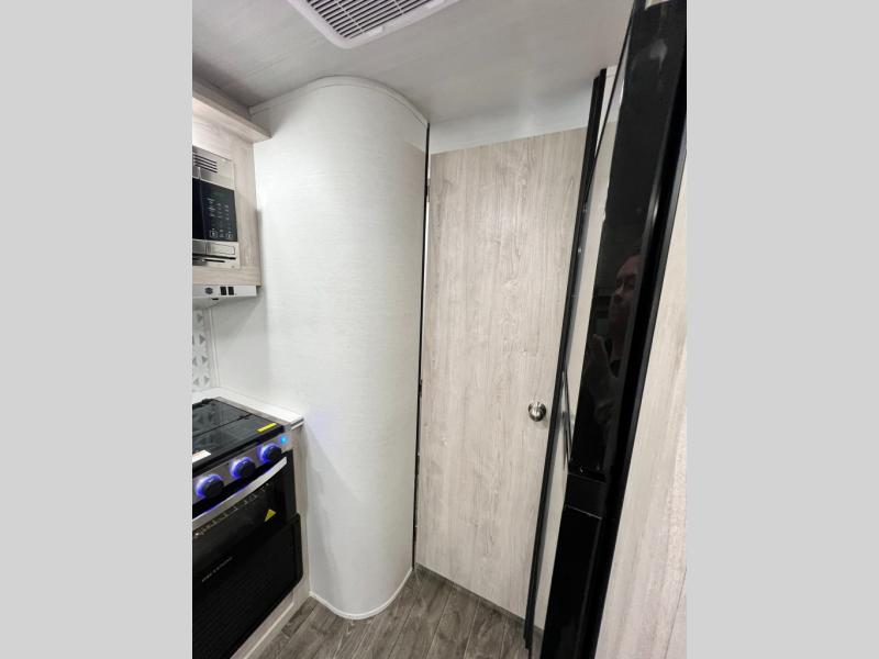 You will feel right at home in this travel trailer with the front queen bed that has privacy curtains to draw at night and shirt closets! The separated bathroom makes it easy for one to take a hot shower while another washes up for dinner. You can prepare delicious home cooked meals with the three burner cooktop and enjoy them at the rear booth dinette. The dinette can also transform into an extra sleeping space and there is a TV mount location diagonal to it also!