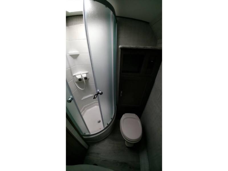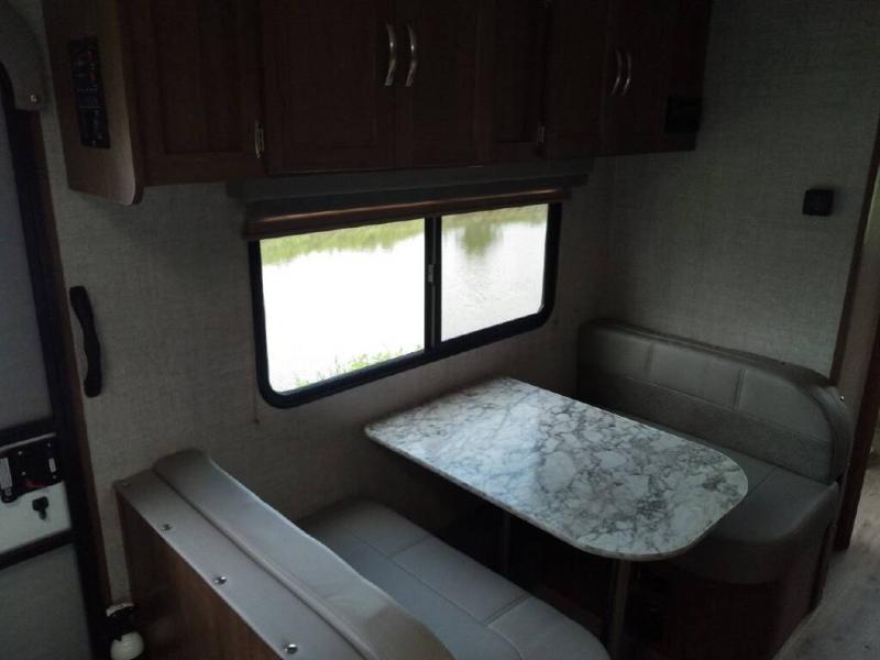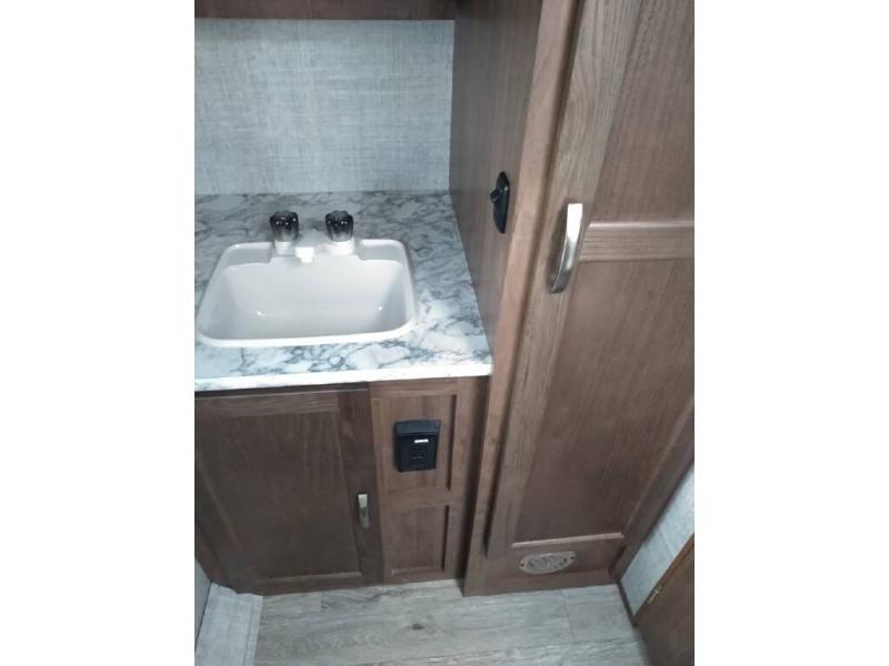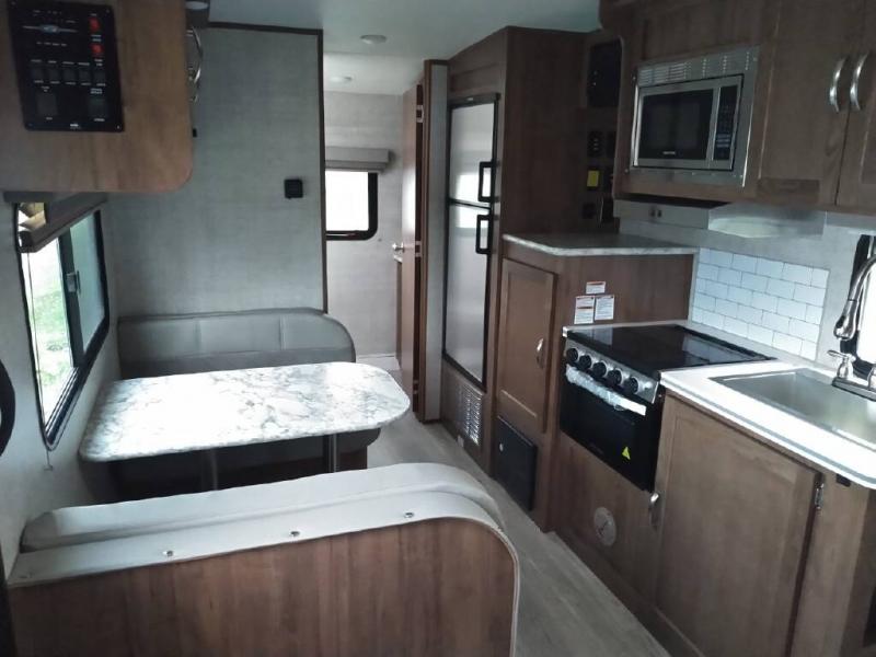 Enjoy a relaxing getaway with your spouse in this travel trailer! The front 60" x 74" bed ensures you will have a good night's rest each night, and the shirt closets on either side will keep your clothes looking nice. The rear full bathroom has a radius shower with a high velocity vent to eliminate any unwanted steam and a medicine cabinet with mirror. The pantry has a TV mount location by it and the three burner cooktop is just waiting for you to prepare a delicious home cooked meal that you can enjoy at the booth dinette!