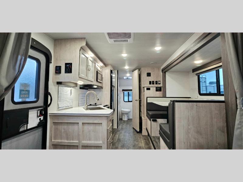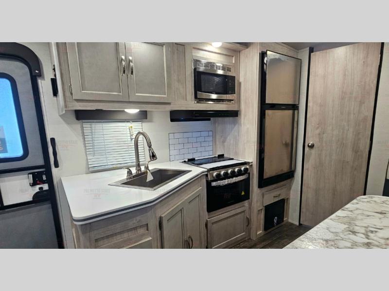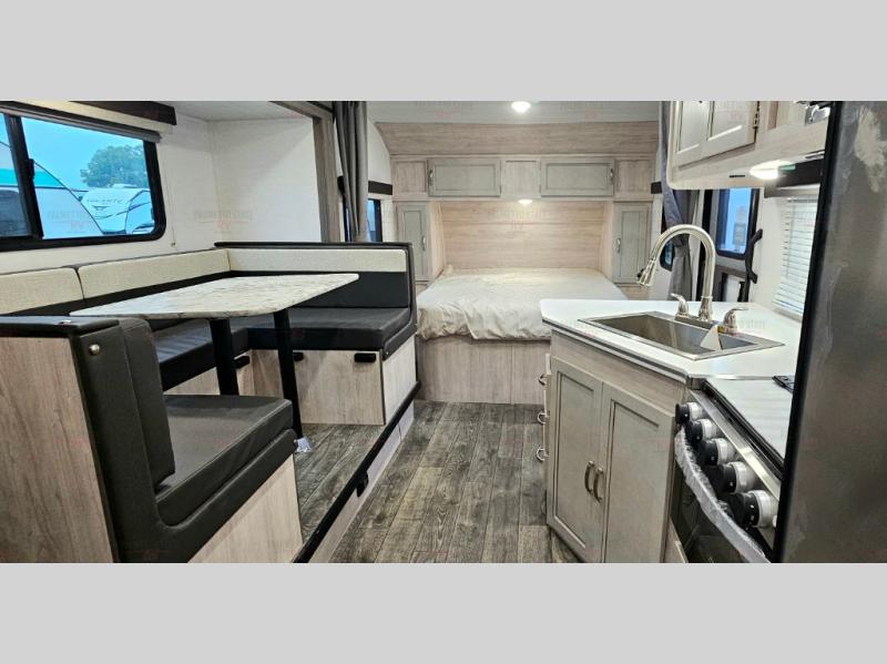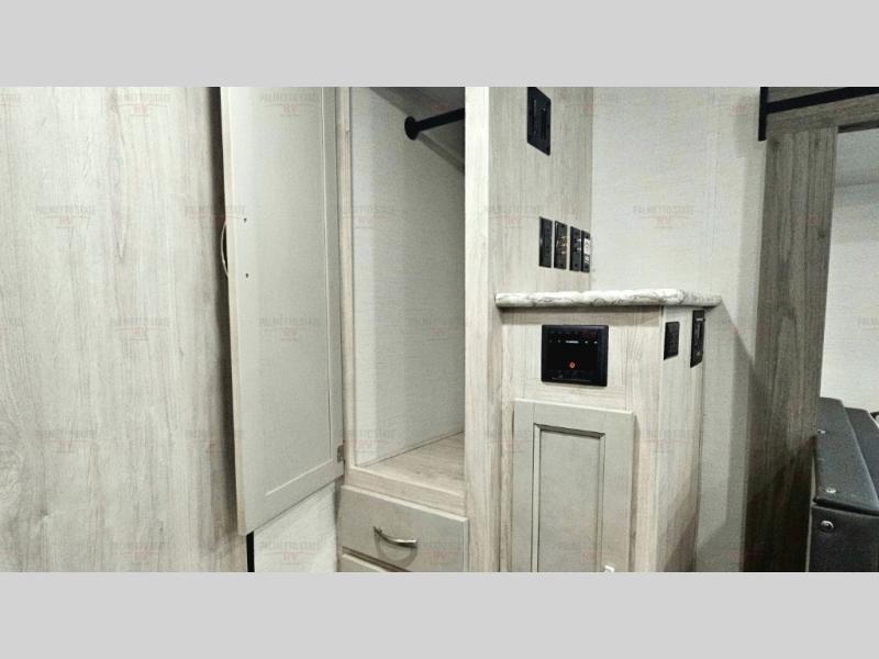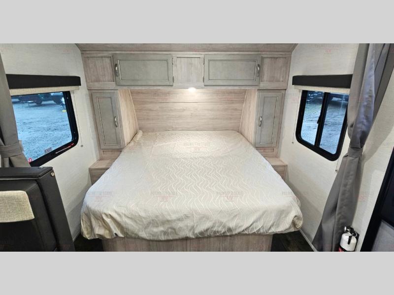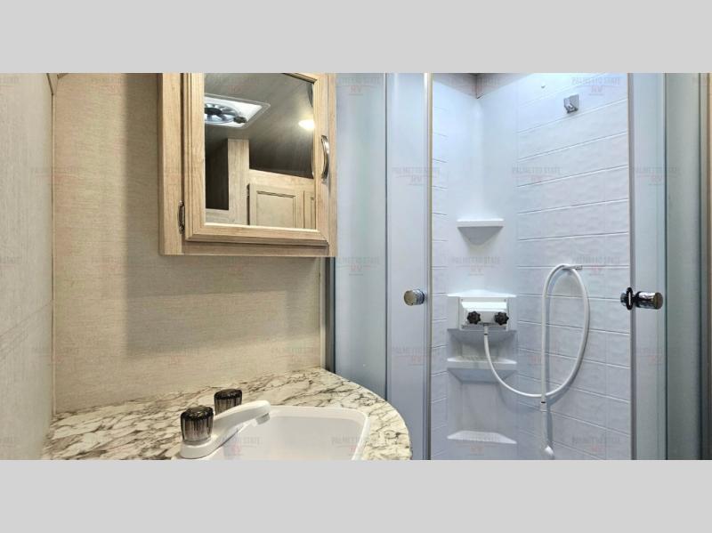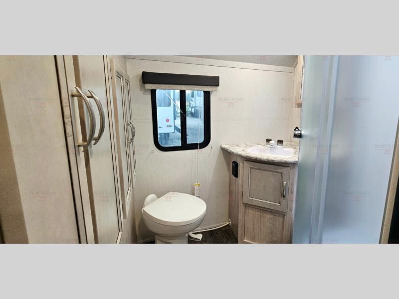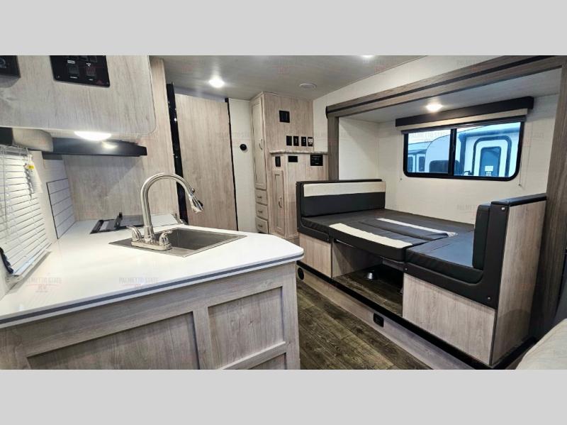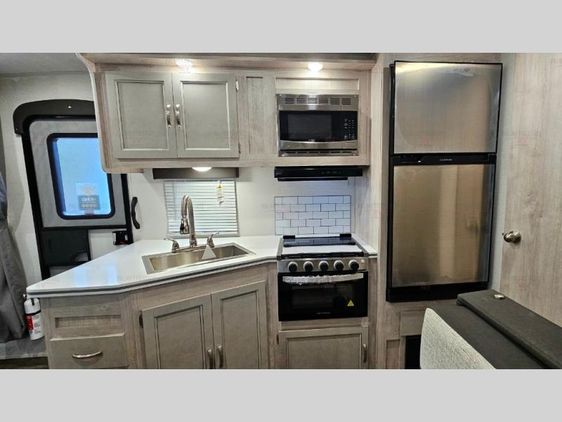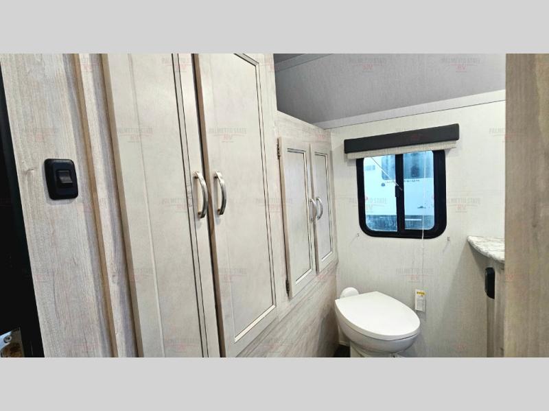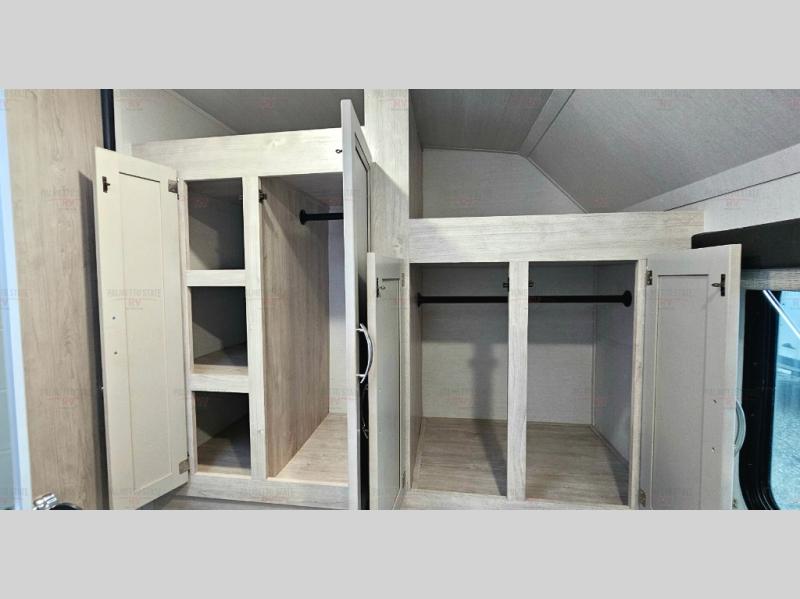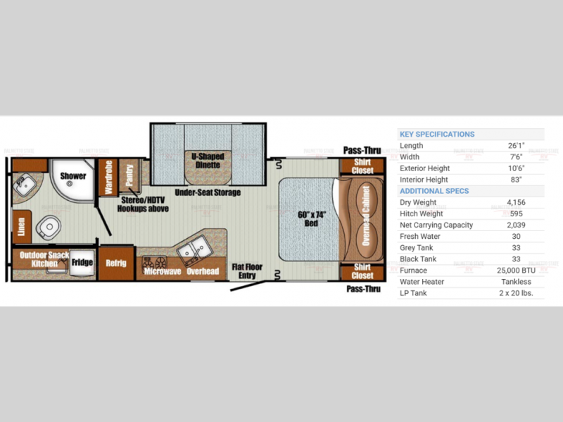 An outdoor snack kitchen with this travel trailer makes it easy to quickly grab a cold drink and get back to playing cornhole! The rear corner bathroom has a radius shower, a linen closet to keep your towels close by, and a high velocity vent to eliminate any steam. Just outside the bathroom is a wardrobe and a pantry with stereo and HDTV hookups above it. The U-shaped dinette slide has under-seat storage for your games and can convert into a sleeping space for an extra guest or two maybe. The front 60" x 74" bed has shirt closets on either side, overhead cabinets, and privacy curtains to draw at night!