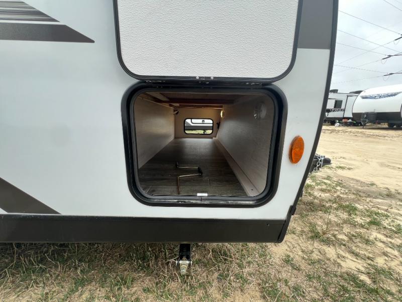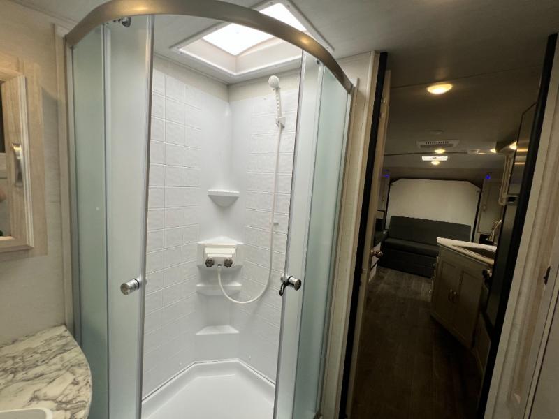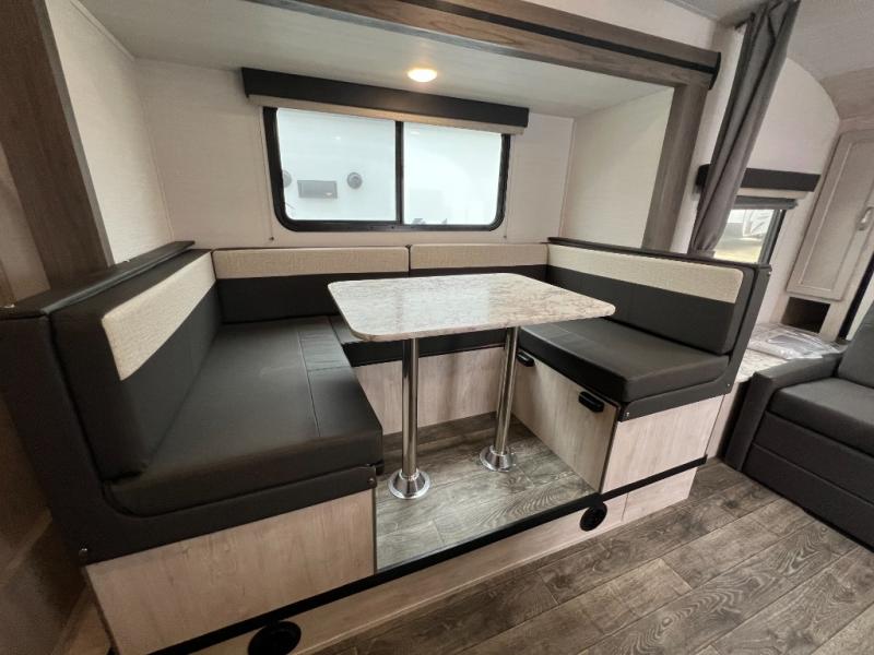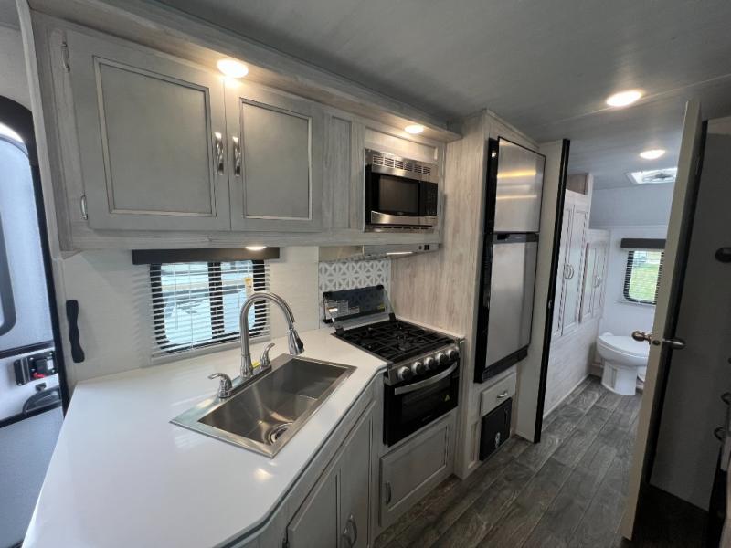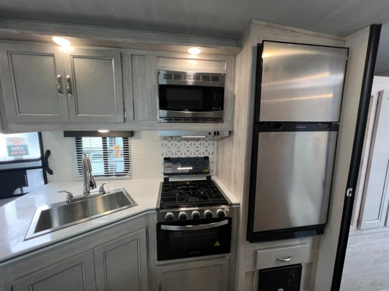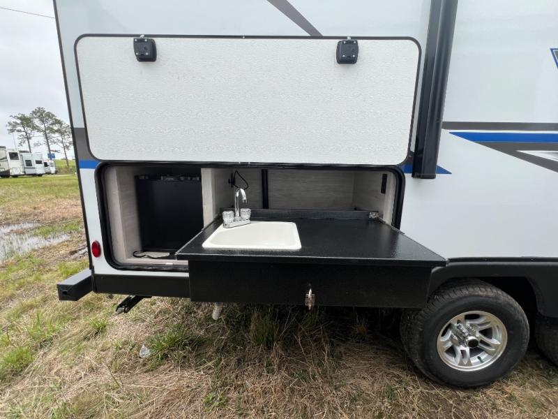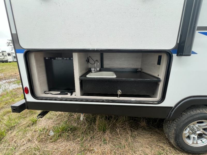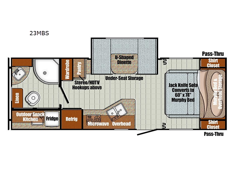 You will experience versatile living in this travel trailer! It features a front jackknife sofa that converts into a 60" x 74" Murphy bed, and the U-shaped dinette slide can also convert into a sleeping space. The rear corner bathroom has a radius shower with a high velocity vent to eliminate any unwanted steam and a linen closet to store your towels. The wardrobe is next to the kitchen pantry which has stereo and HDTV hookups above it. The outdoor snack kitchen has a refrigerator to keep your beverages cold while you play games outside!