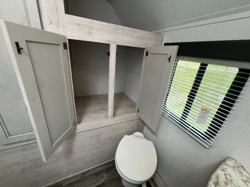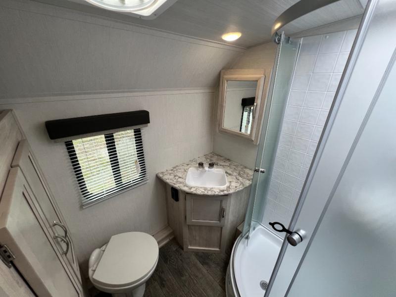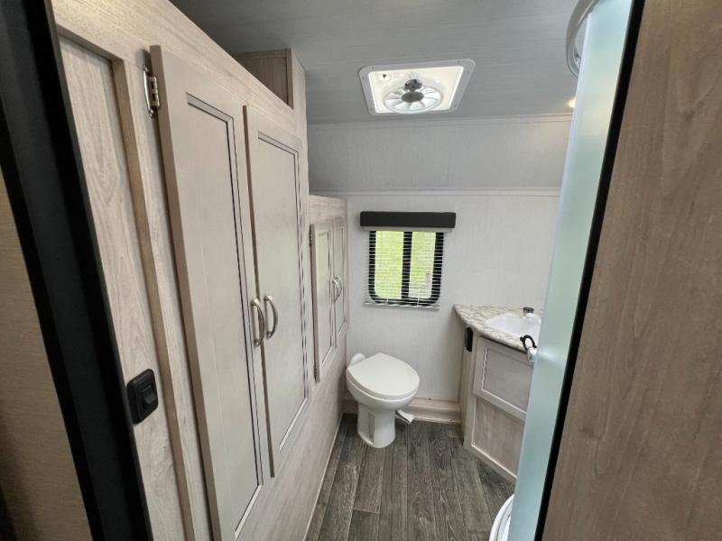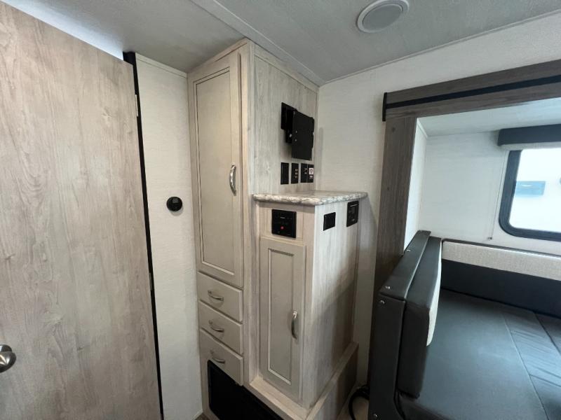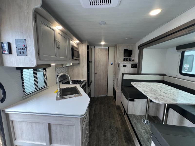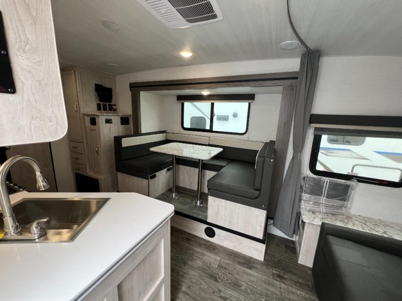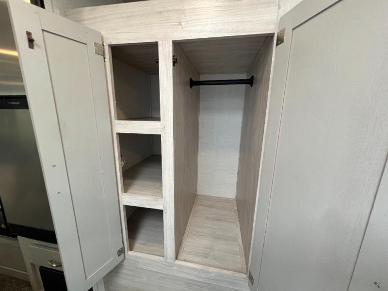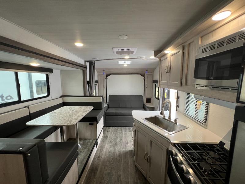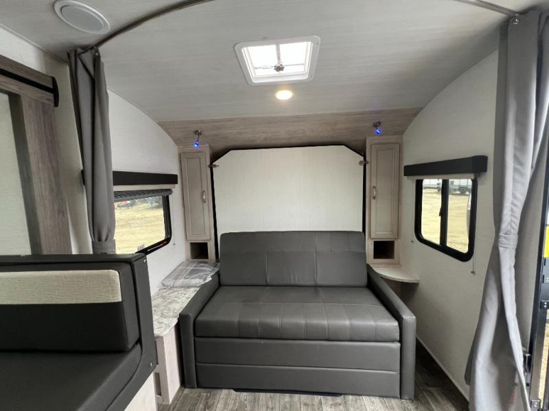 You will experience versatile living in this travel trailer! It features a front jackknife sofa that converts into a 60" x 74" Murphy bed, and the U-shaped dinette slide can also convert into a sleeping space. The rear corner bathroom has a radius shower with a high velocity vent to eliminate any unwanted steam and a linen closet to store your towels. The wardrobe is next to the kitchen pantry which has stereo and HDTV hookups above it. The outdoor snack kitchen has a refrigerator to keep your beverages cold while you play games outside!