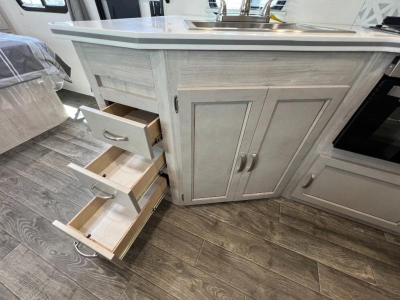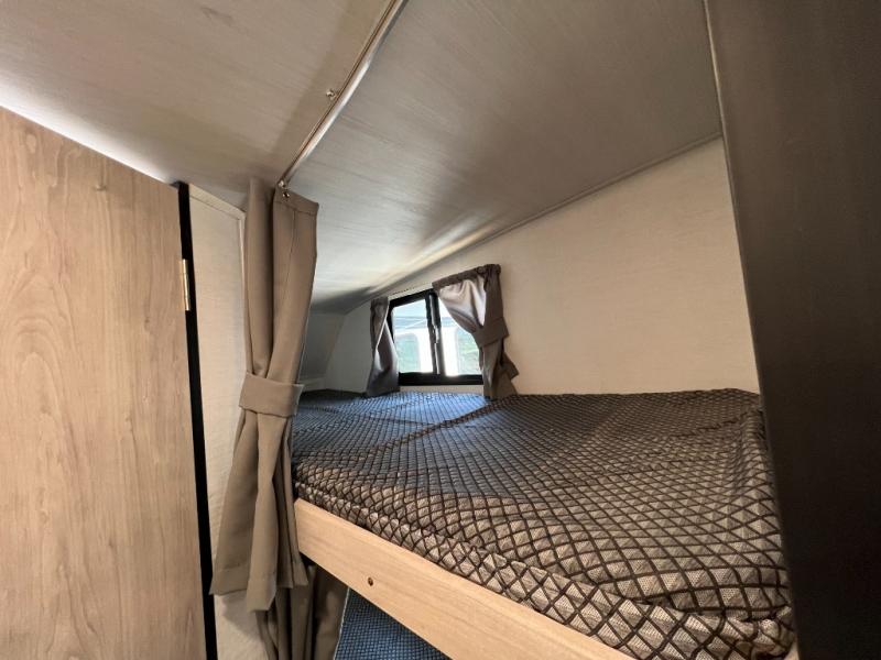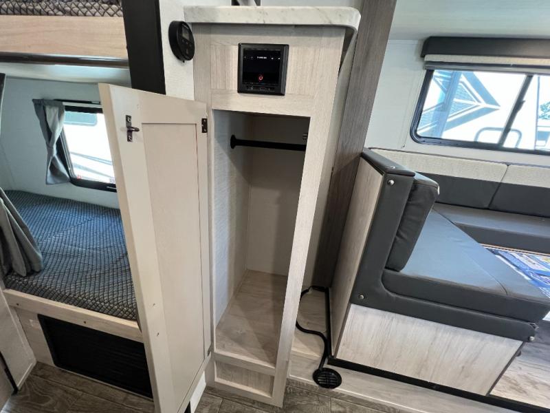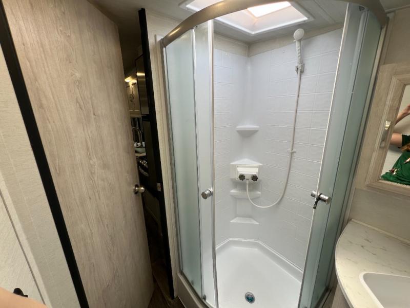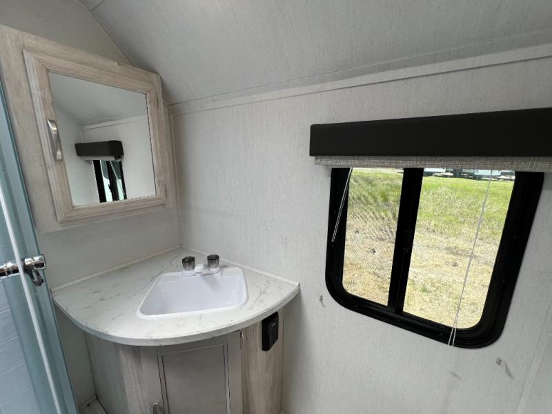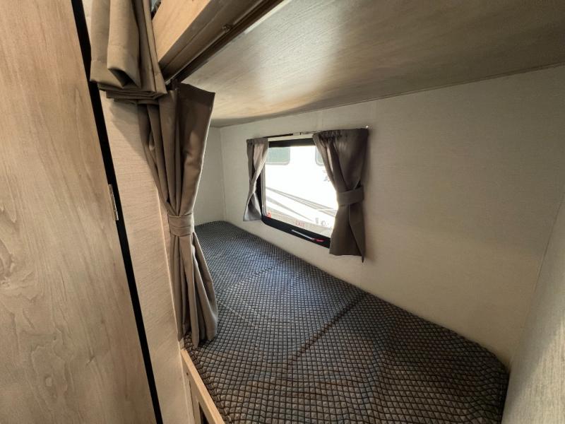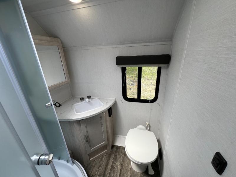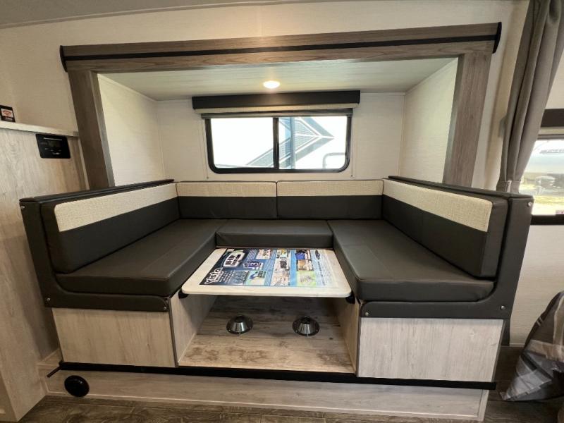 You will feel right at home camping in this travel trailer! With a set of corner bunk beds and a 60" x 74" bed up front, everyone will enjoy a good night's rest, plus the U-shaped dinette slide can also transform into a sleeping space. There are also under-seat drawers to store your games, and a TV mount with home theater by the wardrobe. The rear corner bathroom has a neo-angled shower, a high velocity vent to eliminate any steam, and a deluxe wood medicine cabinet with a mirror!