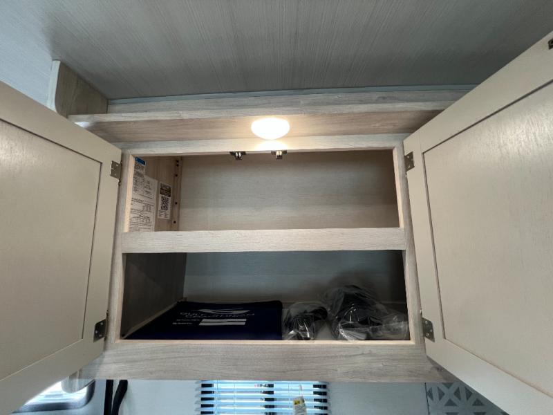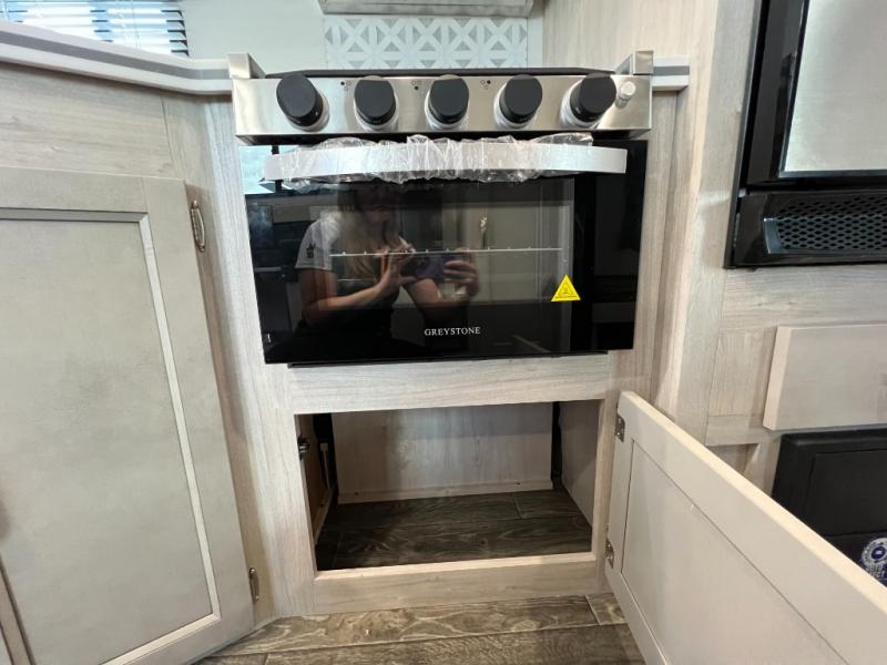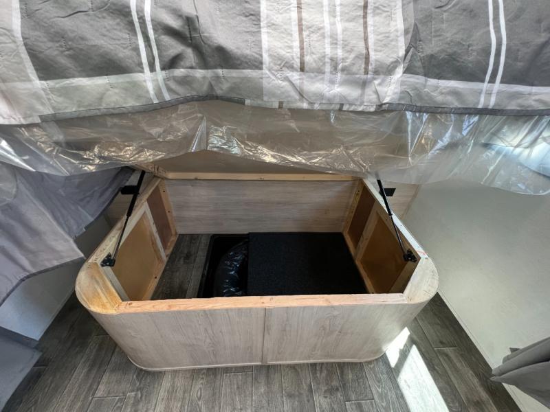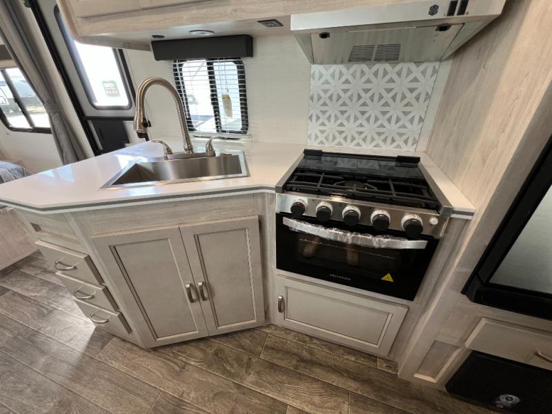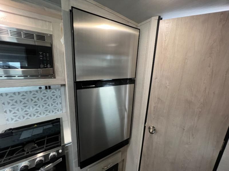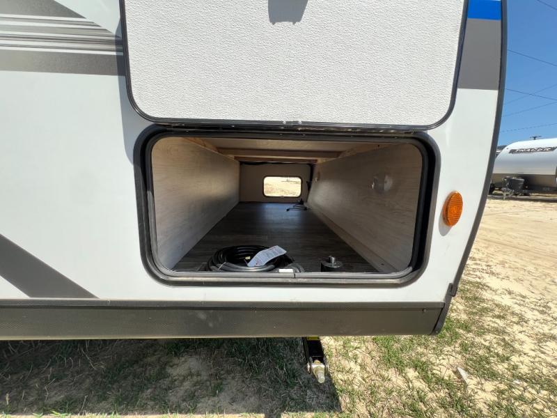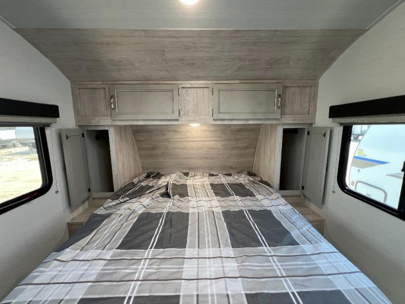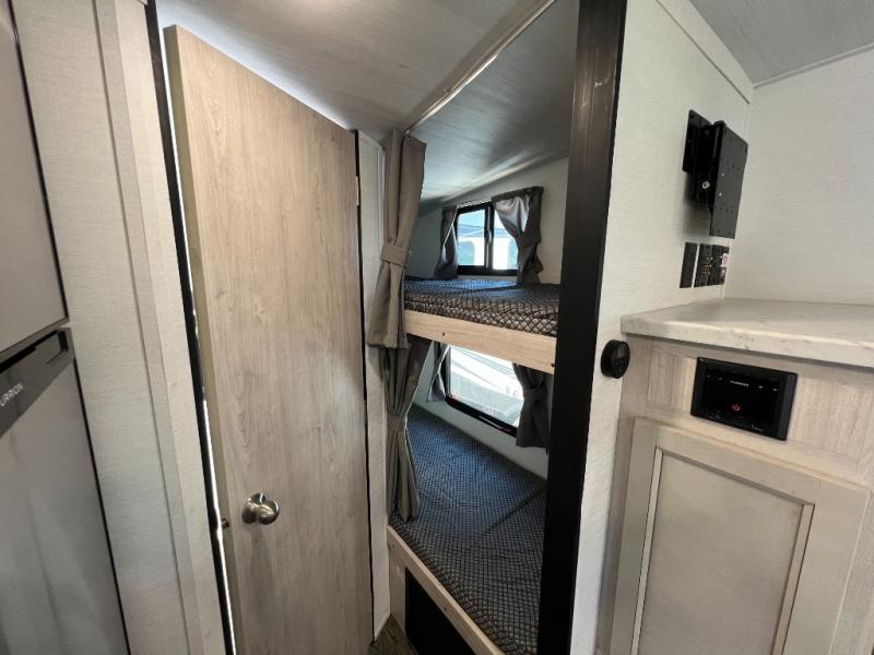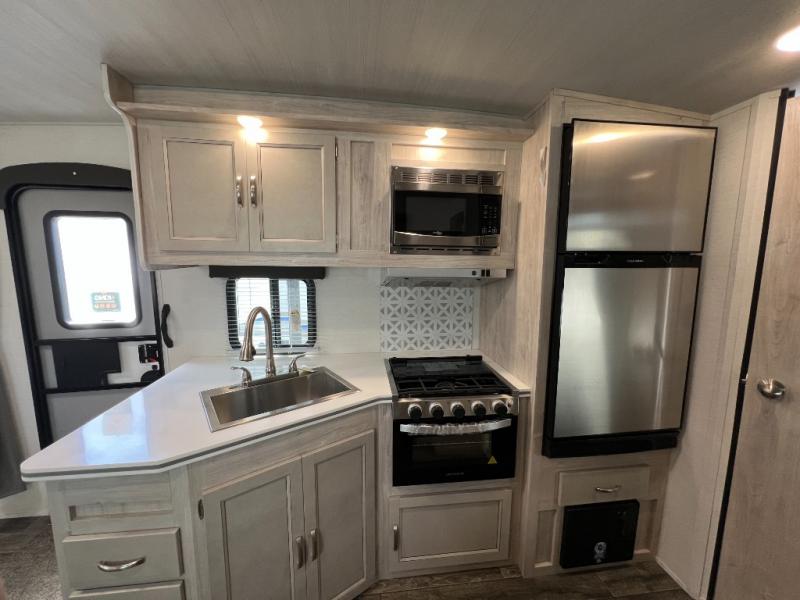 You will feel right at home camping in this travel trailer! With a set of corner bunk beds and a 60" x 74" bed up front, everyone will enjoy a good night's rest, plus the U-shaped dinette slide can also transform into a sleeping space. There are also under-seat drawers to store your games, and a TV mount with home theater by the wardrobe. The rear corner bathroom has a neo-angled shower, a high velocity vent to eliminate any steam, and a deluxe wood medicine cabinet with a mirror!