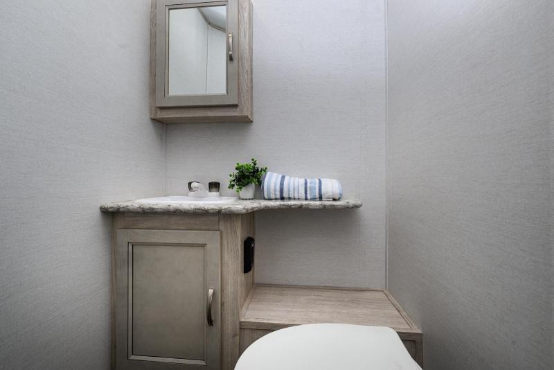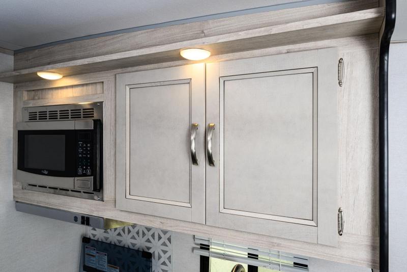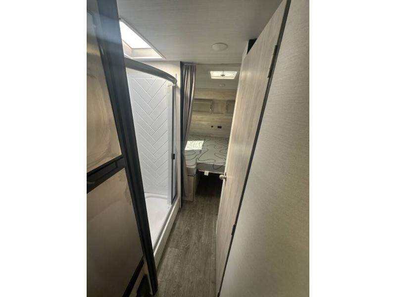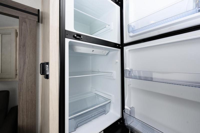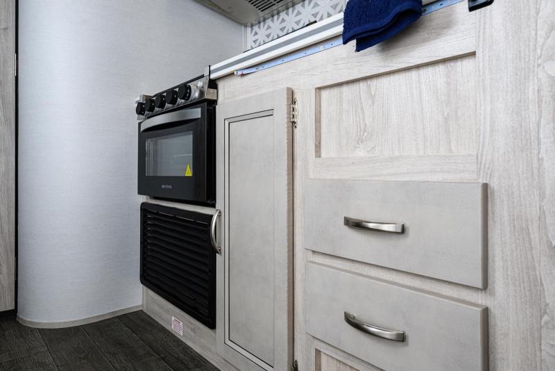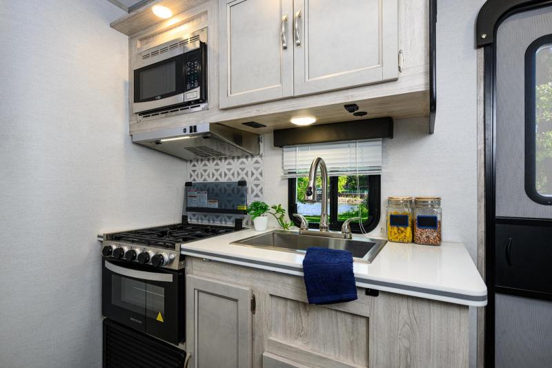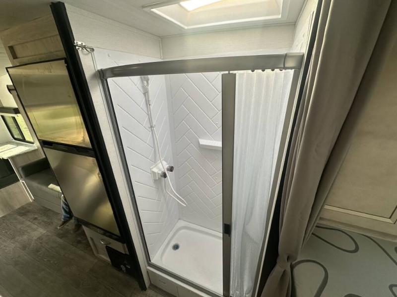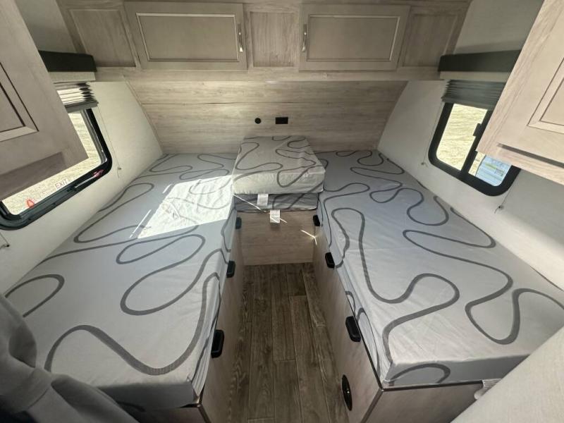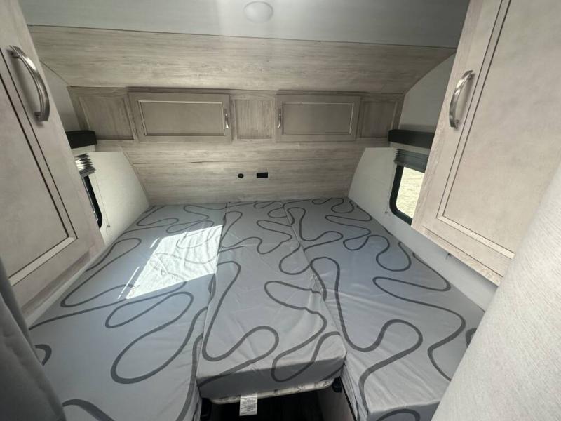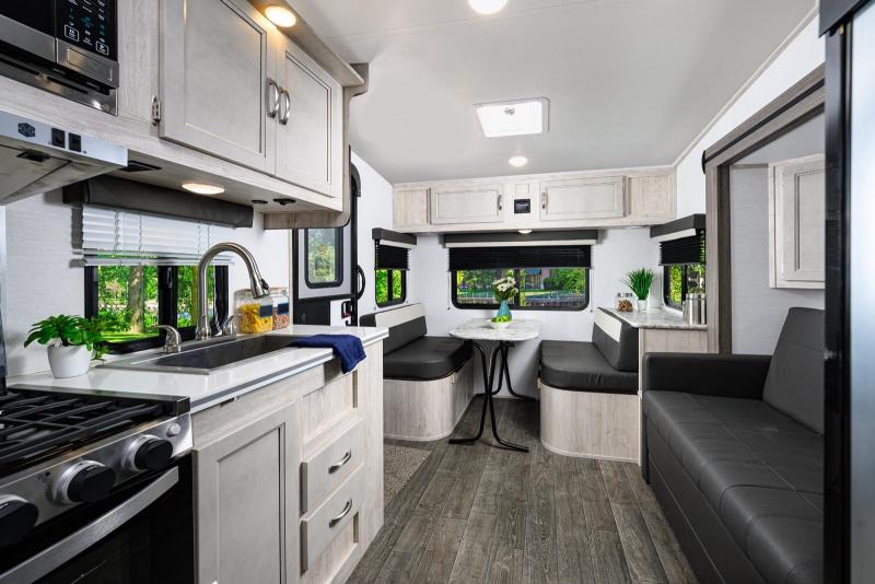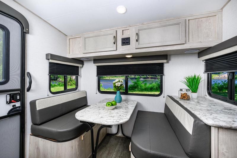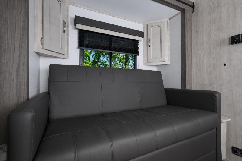 You will appreciate how versatile this travel trailer is! It features two front 32" x 80" twin beds with an insert for a king bed, plus a night stand with a drawer to keep your valuables secure. The separated bathroom allows one person to rinse the sand out of their hair in the shower while another uses the private lavatory and sink. The booth dinette is not only great for enjoying a meal or playing a card game, but also for transforming into an extra sleeping space. The sofa slide can also be another sleeping space, and the flat floor entry helps keep everyone from tripping as they enter or exit!