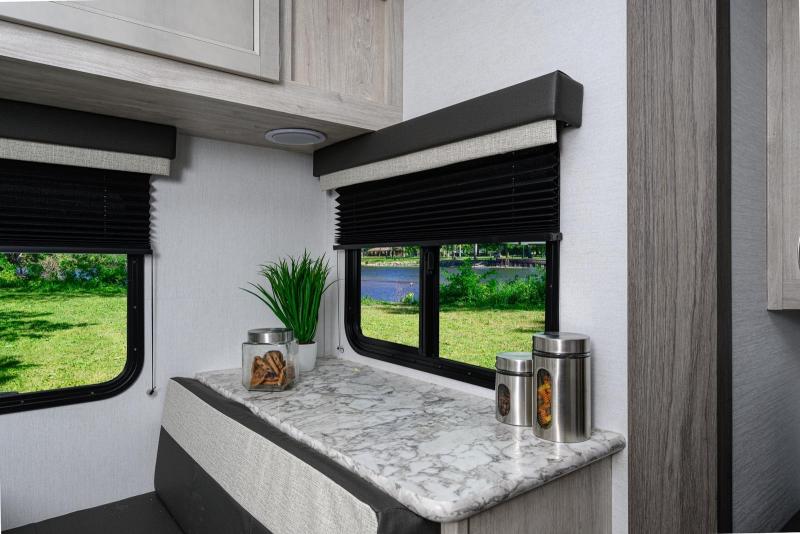 With any Vista Cruiser by Gulf Stream, you will enjoy premium quality in a compact and easy to tow travel trailer. The one-piece fiberglass roof, welded aluminum frame, and vacuum-bonded sidewalls with a composite barrier layer will create a strong and durable foundation to your RV. There are also LED running lights, along with an outside spray port, an electric awning, and a power tongue jack for easy set up. A home theater stereo with Bluetooth and speakers will allow you to listen to your favorite tunes, and there are interior and exterior TV mounting brackets if you decide to bring along a television. More interior features include "Opulence River Rock" wall vinyl, designer window treatments and night shades, tile backsplash at the range, and a premium foam mattress for your comfort.