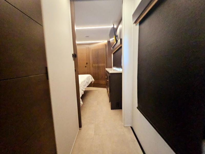 - Bedroom, Hidden Storage in Dresser, One Piece Fiberglass Shower w/ Spa Head and Body Sprays, Porcelain Foot Flush