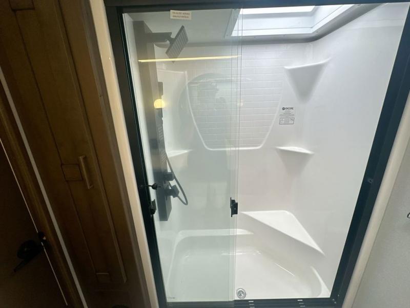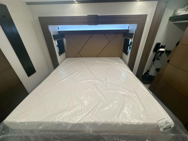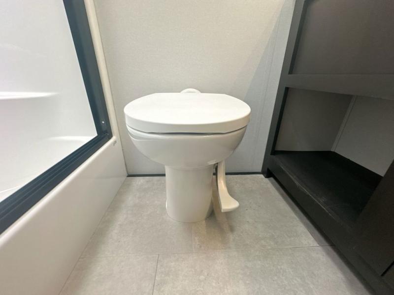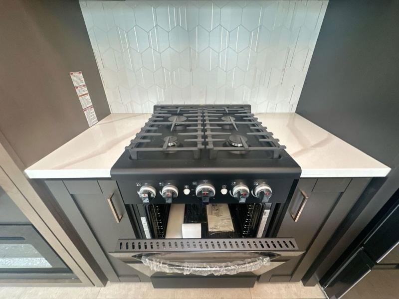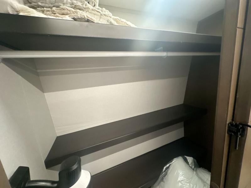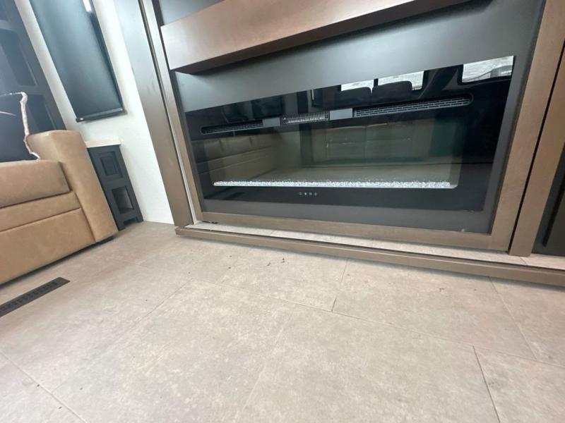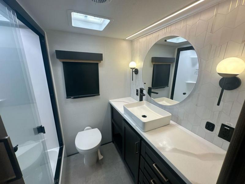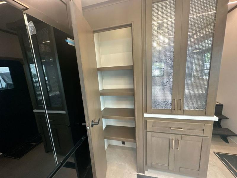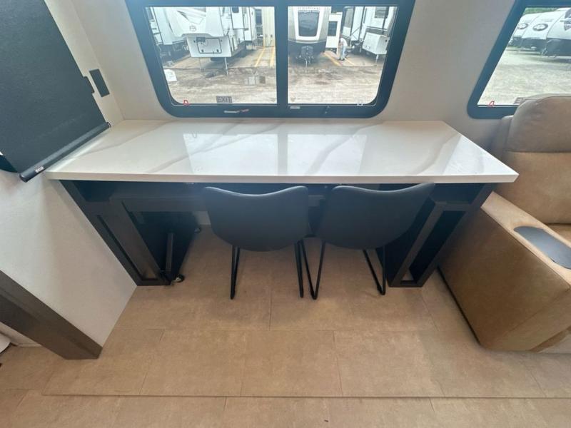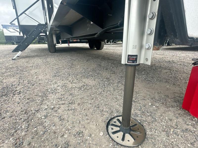 This fifth wheel is perfect for you and your partner. The rear living room is the perfect place to unwind, featuring a plush sofa, theater seating, and a swing desk for working or playing. The culinary dream kitchen has a hidden pantry, overhead cabinet, 3-burner cooktop, 12V refrigerator, kitchen island, and pantry for all your favorite snacks. The full bathroom is fitted with everything you need to freshen up, and the front bedroom is a spacious place so you can comfortably rest and sleep, equipped with a king bed, washer and dryer prep, closet, and overhead cabinets for all your belongings. But the real excitement begins when you step outside, where you'll find not one, but two awnings, perfect for relaxing in the shade. Whether you're a seasoned RVer or just starting, our fifth wheel has everything you need to experience the ultimate in luxury living on wheels.