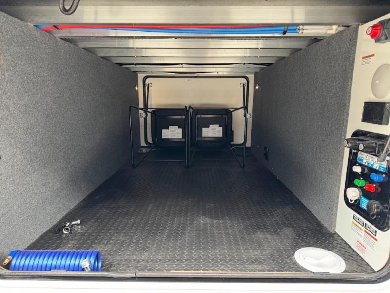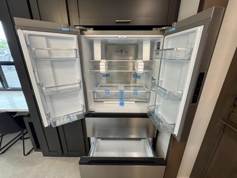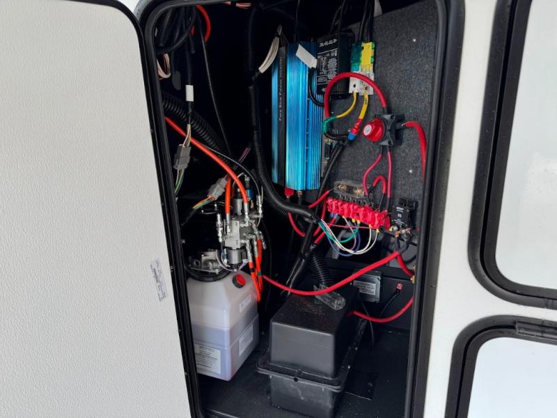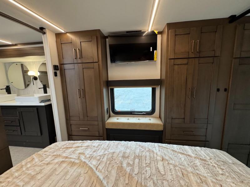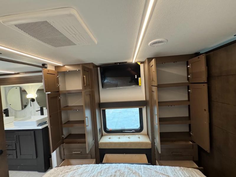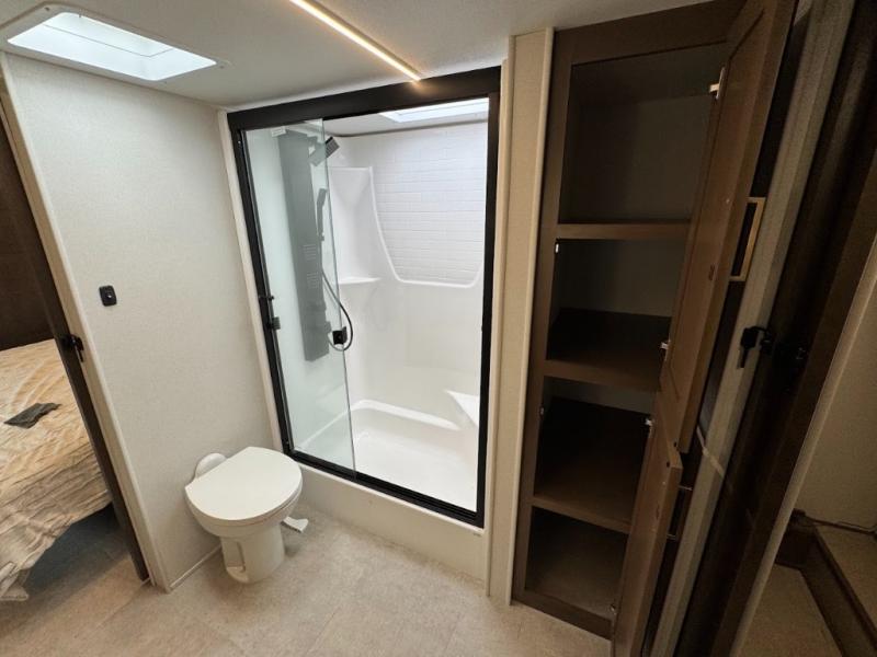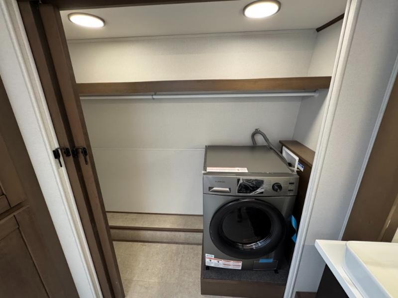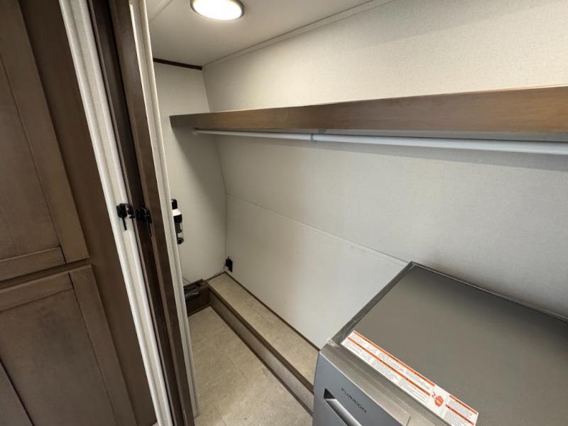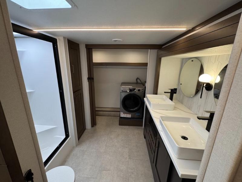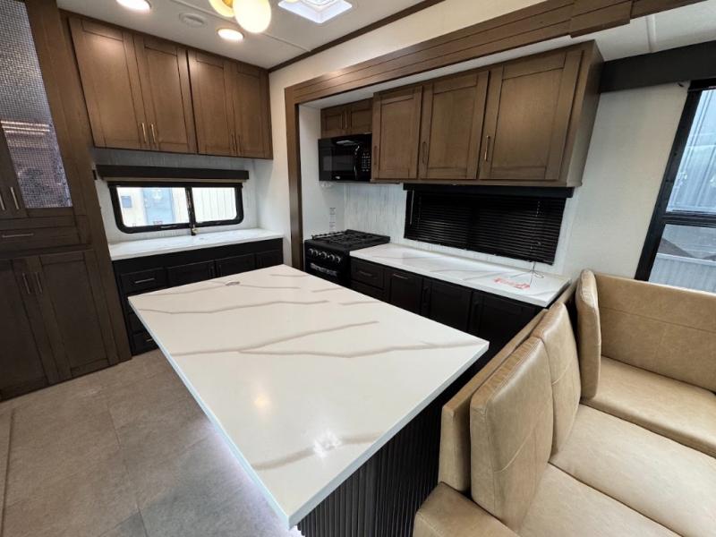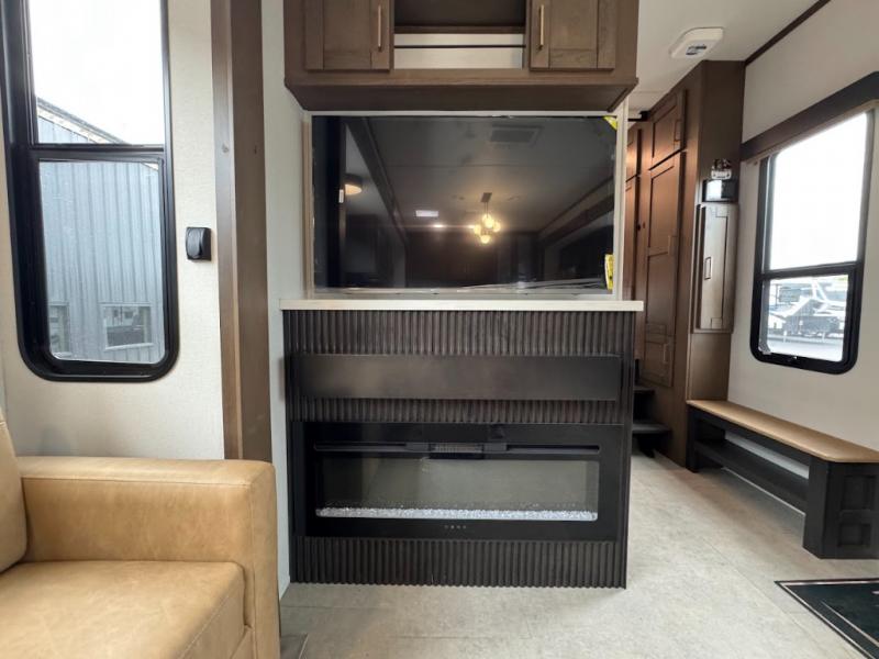 Cook like a chef in the spacious rear kitchen of this luxurious fifth wheel, equipped with overhead cabinets, a pantry, a 12V refrigerator, along with a microwave, and a table with stools for casual dining with family and friends. The living room is the perfect place to relax and entertain yourself, featuring a swing desk for working or playing, an L-shaped sofa for lounging, an entertainment center with a fireplace for cozy nights in, and a convenient half bathroom, ideal for guests. The bedroom is incredibly comfortable, featuring a king bed, a dual dresser for ample storage, and a comfy bench for relaxing. The front bathroom is a spacious oasis, complete with a dual sink, linen closet, walk-in closet, and washer and dryer prep for added convenience. Finally, step outside and enjoy the fresh air under our massive 16’ awning, perfect for relaxing and enjoying the exterior view.