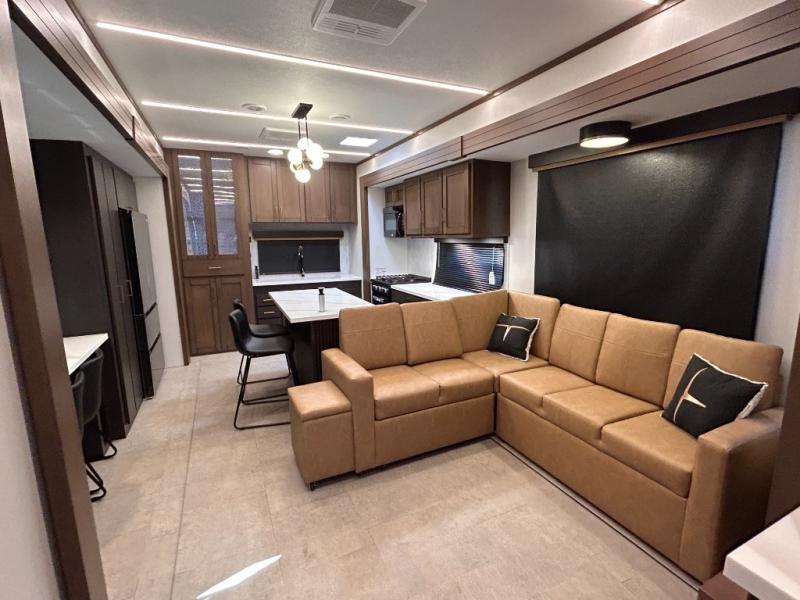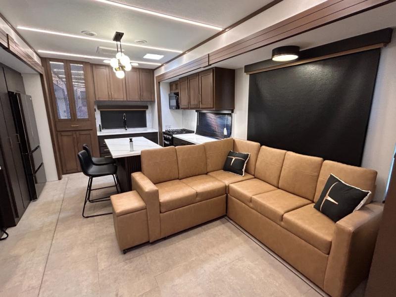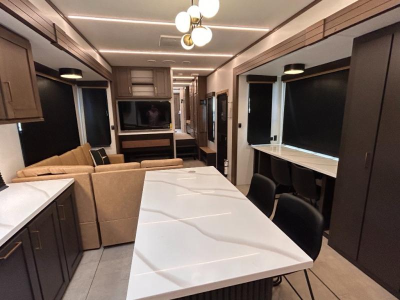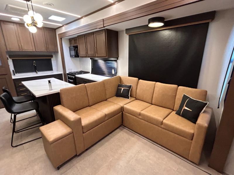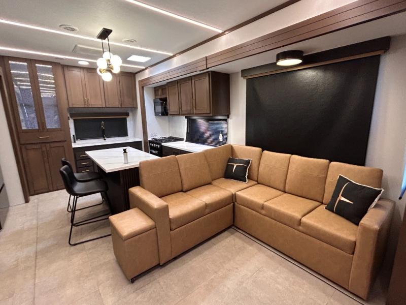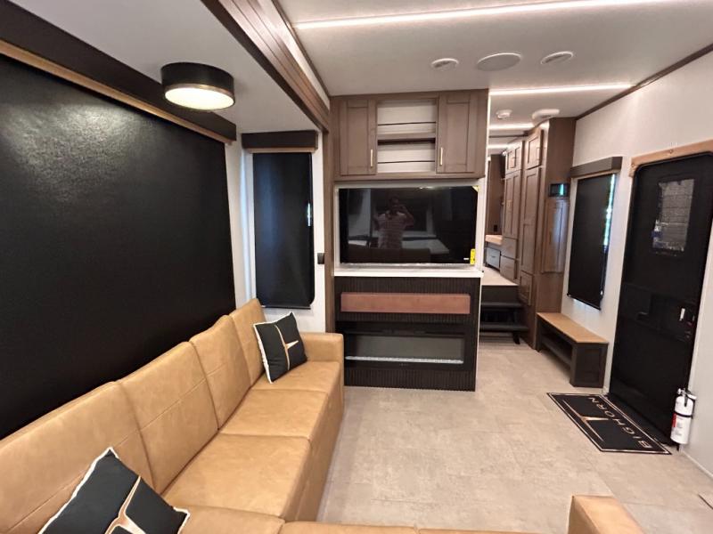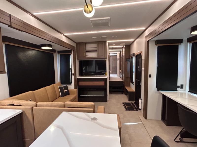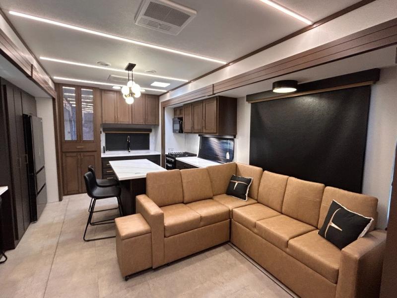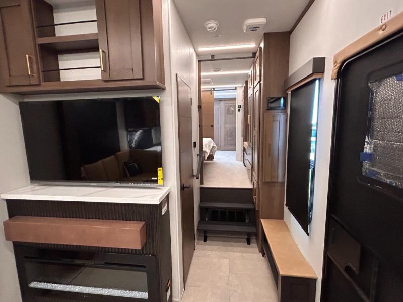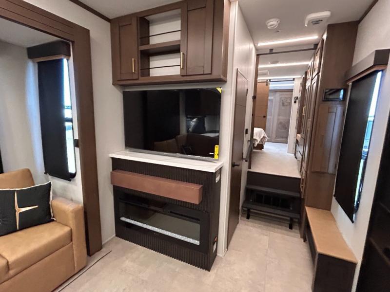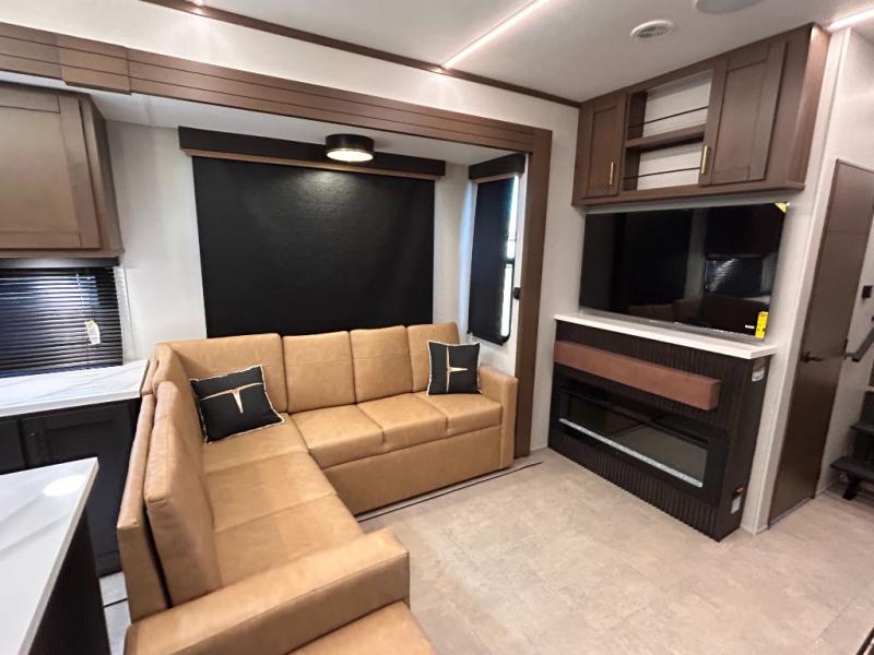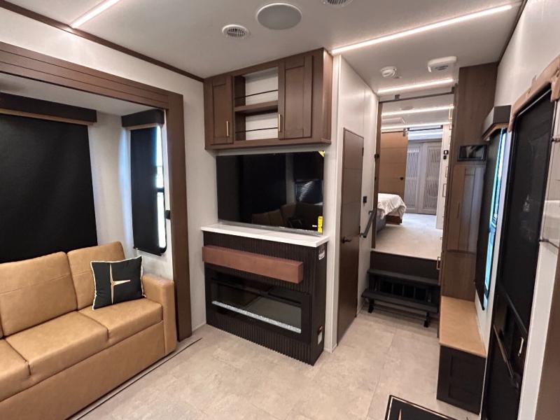 - Core Comfort Package: 76" Main Slideout Height, Hydraulic Slide Outs w/Flush Floors, Luxury Dimmable LED Light Strips Throughout, Electric Fireplace w/ 5000 BTU Heat Output, 55" LED Smart TV w/ Bluetooth Ceiling Speaker,