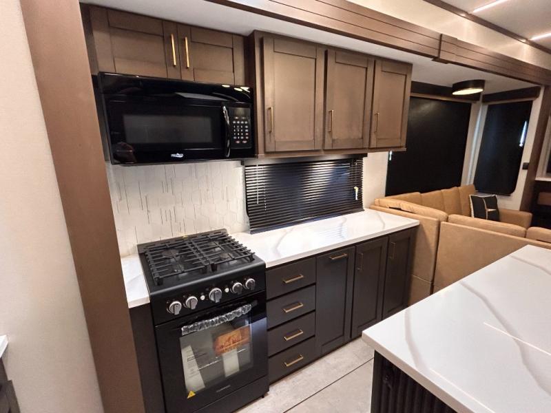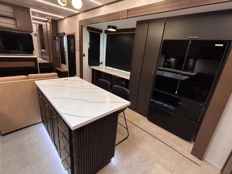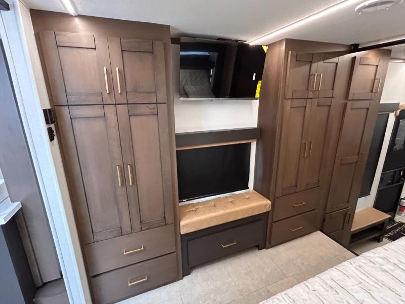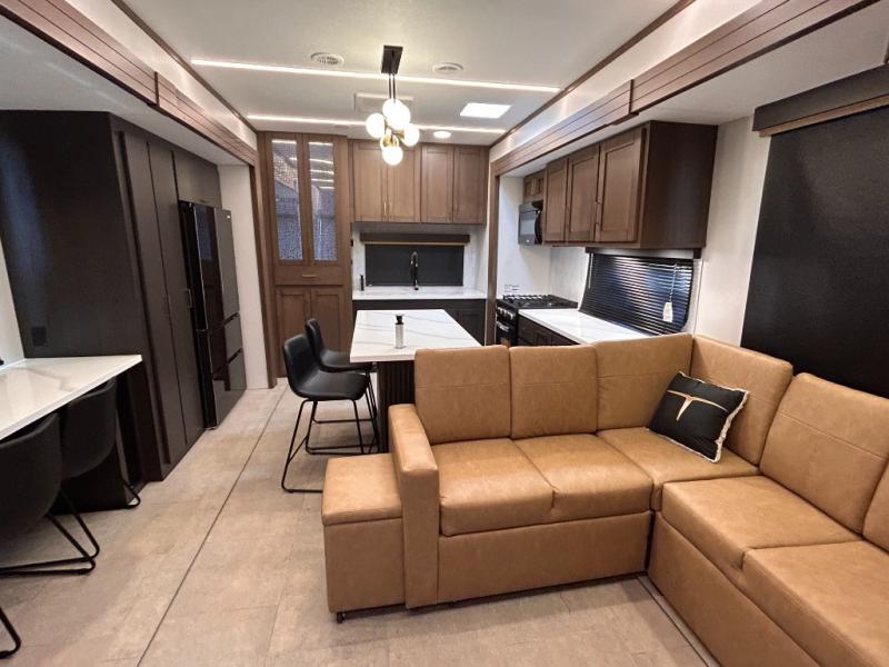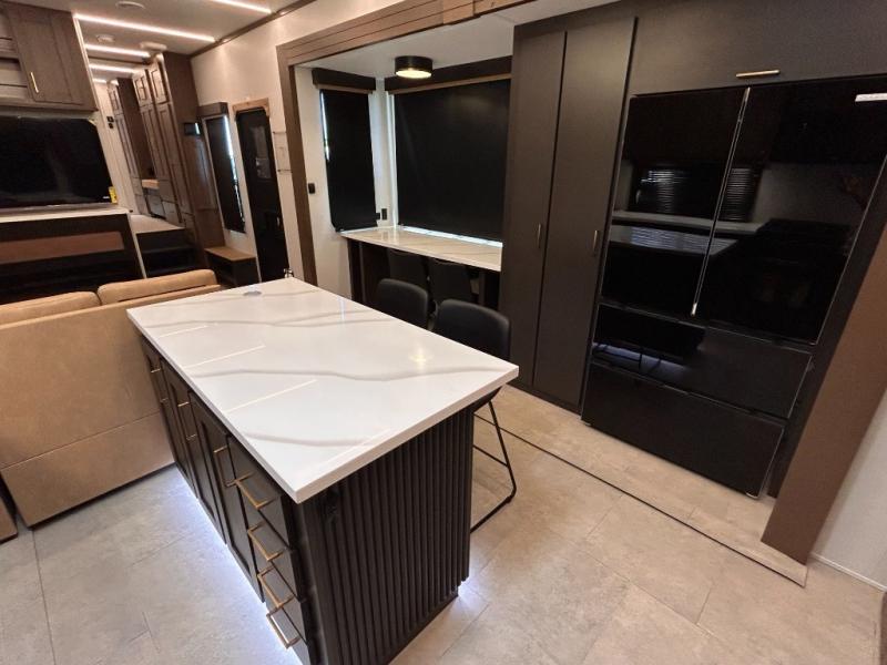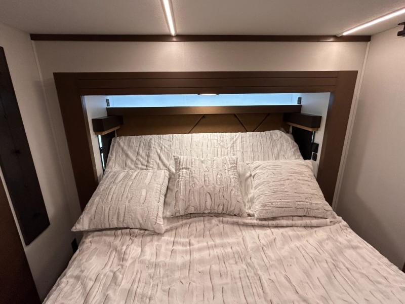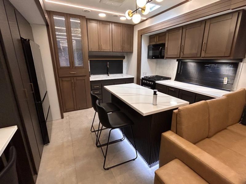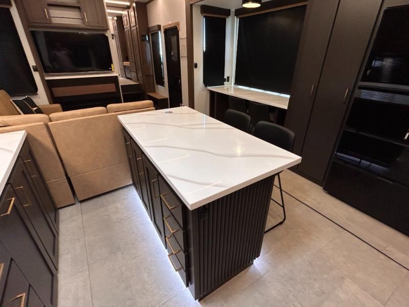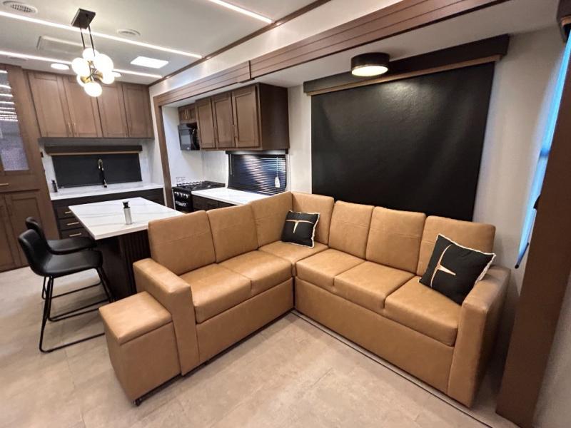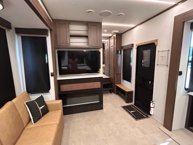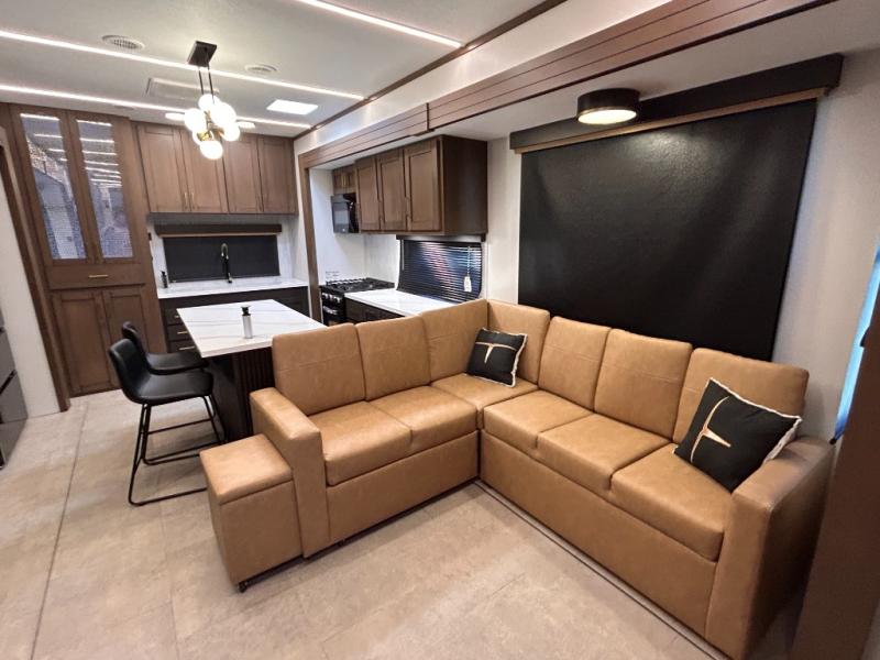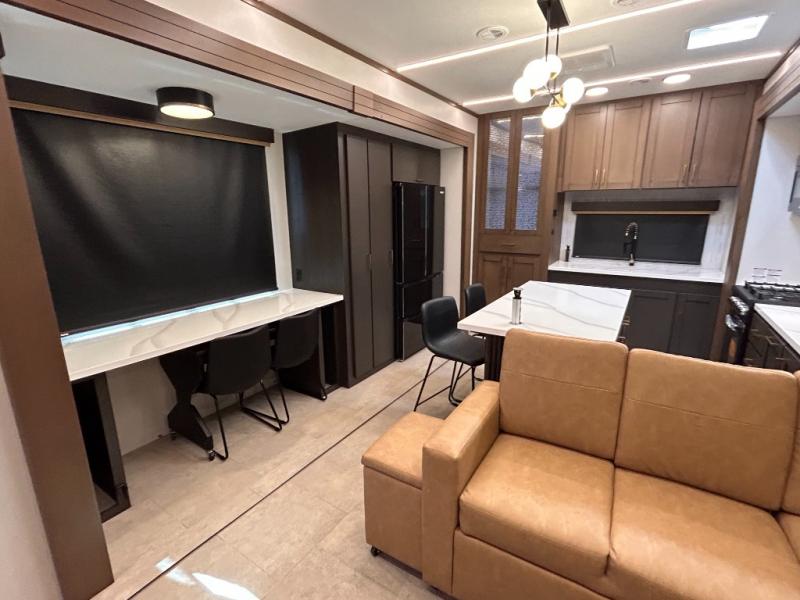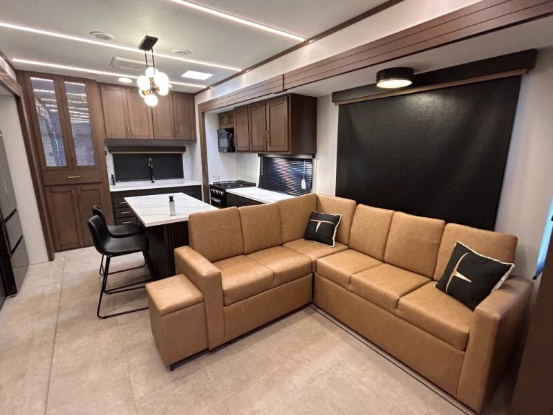 - Core Comfort Package: 76" Main Slideout Height, Hydraulic Slide Outs w/Flush Floors, Luxury Dimmable LED Light Strips Throughout, Electric Fireplace w/ 5000 BTU Heat Output, 55" LED Smart TV w/ Bluetooth Ceiling Speaker,