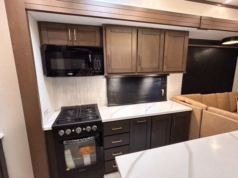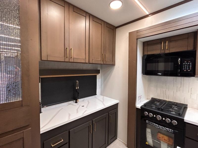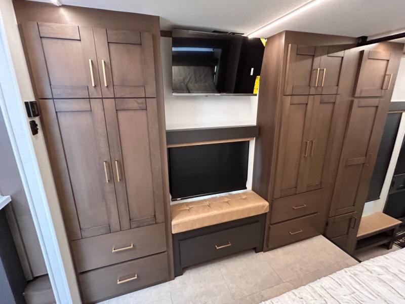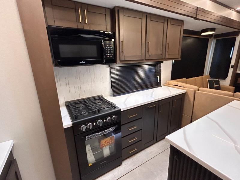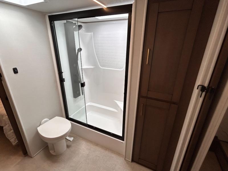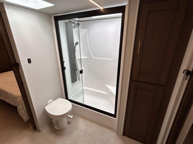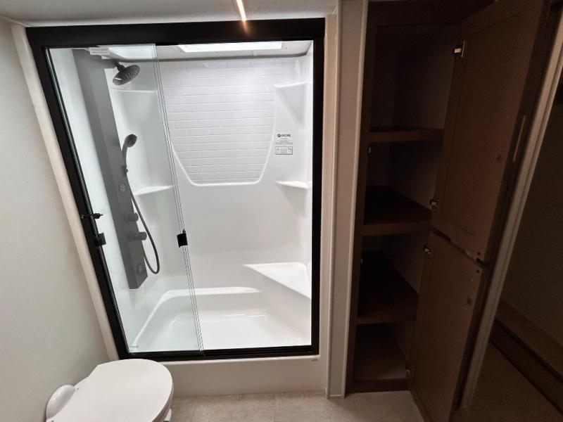 - Residential Oven w/ 30" Microwave, Residential King Bed w/ Upgraded Comforter & Throw Pillows, 40" LED TV in Bedroom, Hidden Storage in Dresser, One Piece Fiberglass Shower w/ Spa Head and Body Sprays, Porcelain Foot Flush Toilet, Sol 380-380 Watts Solar w/2000 watt inverter & 30 amp controller, Heated and Enclosed Underbelly