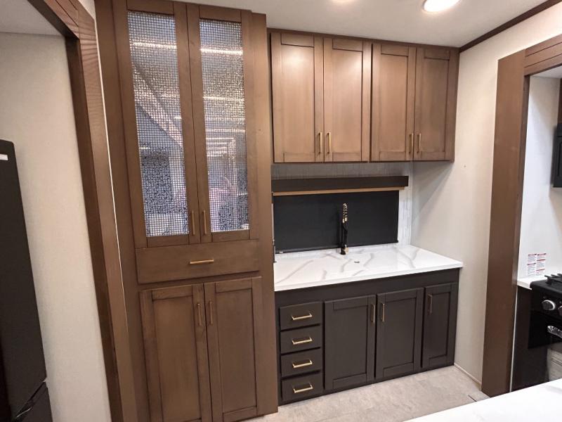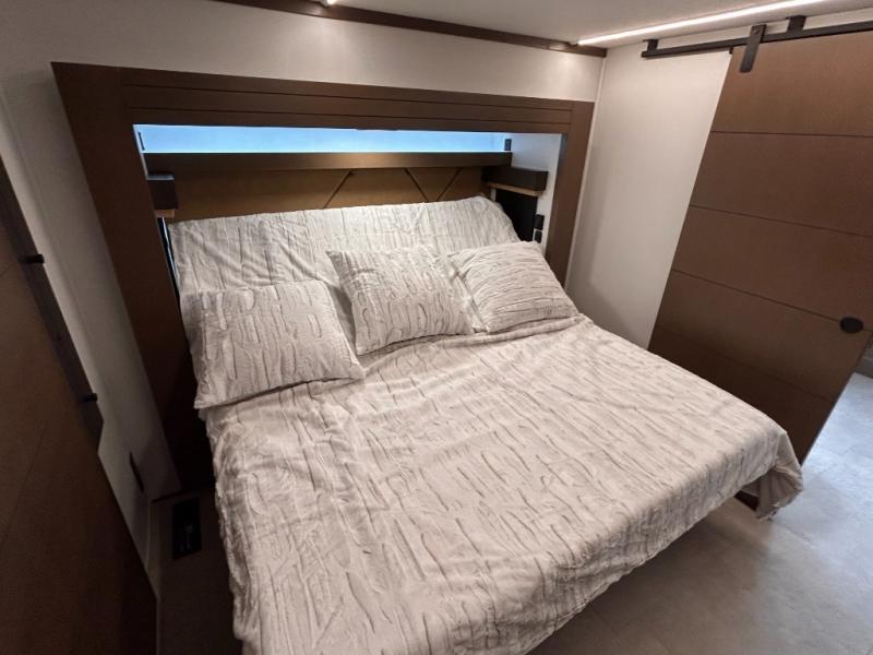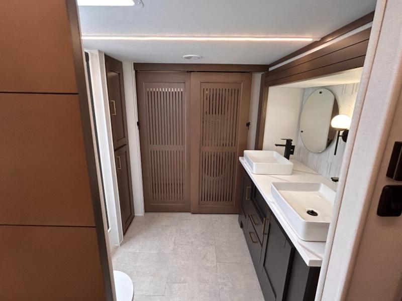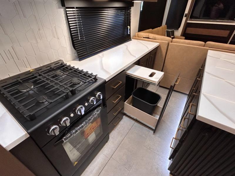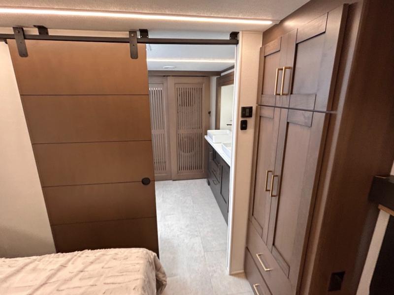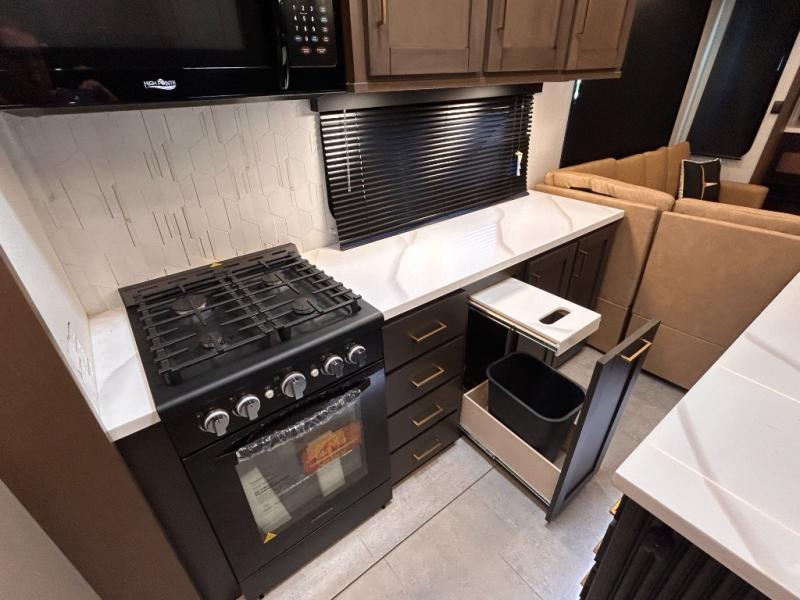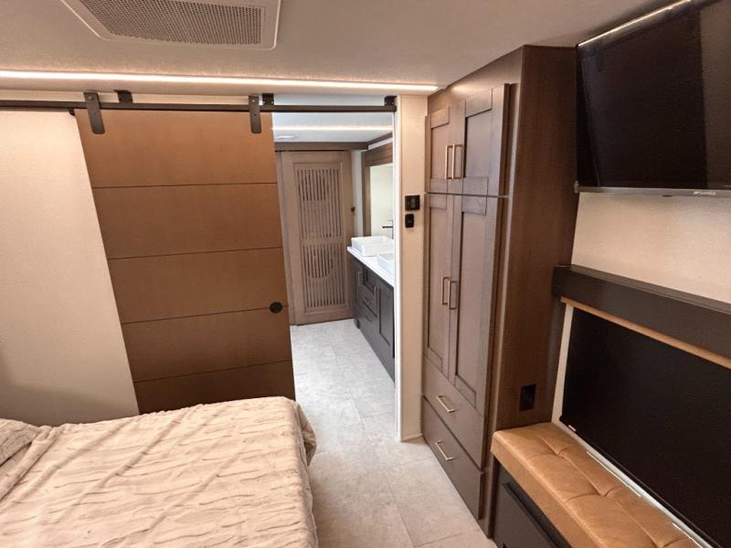 - Residential Oven w/ 30" Microwave, Residential King Bed w/ Upgraded Comforter & Throw Pillows, 40" LED TV in Bedroom, Hidden Storage in Dresser, One Piece Fiberglass Shower w/ Spa Head and Body Sprays, Porcelain Foot Flush Toilet, Sol 380-380 Watts Solar w/2000 watt inverter & 30 amp controller, Heated and Enclosed Underbelly