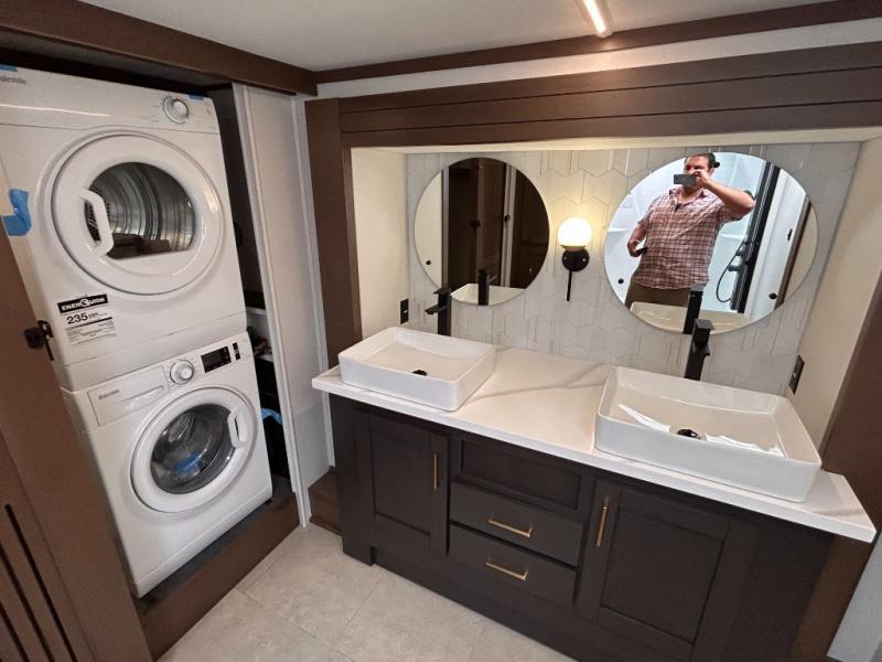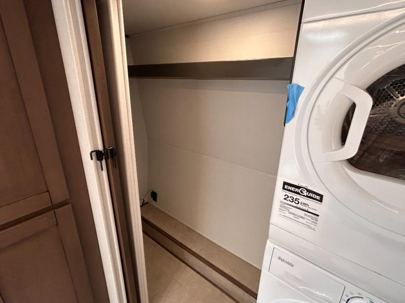 - New Front Cap w/ Automotive LED Light Bar, LED Underframe Lighting, Custom Hardwood Cabinetry, Premium Furniture PKG w/ Throw Pillows, Triple High Efficiency AC's w/Trio Airflow Technology, Washer/Dryer, On Demand Water Heater, Message Center, Logo Doormat, Wall Clock, Decorative Wall Hooks,