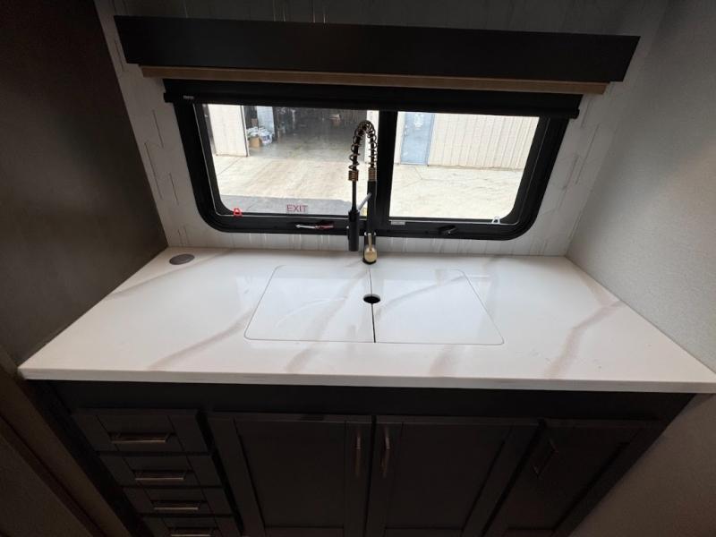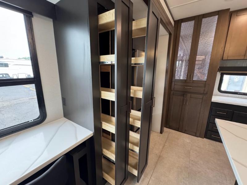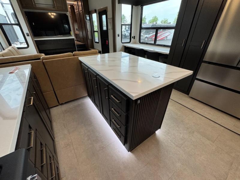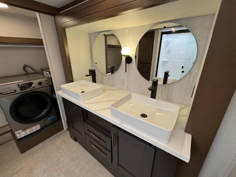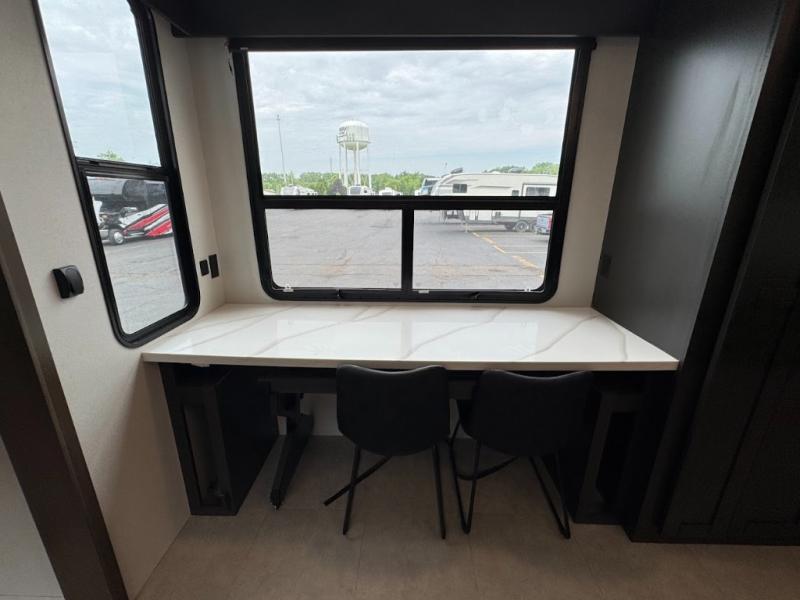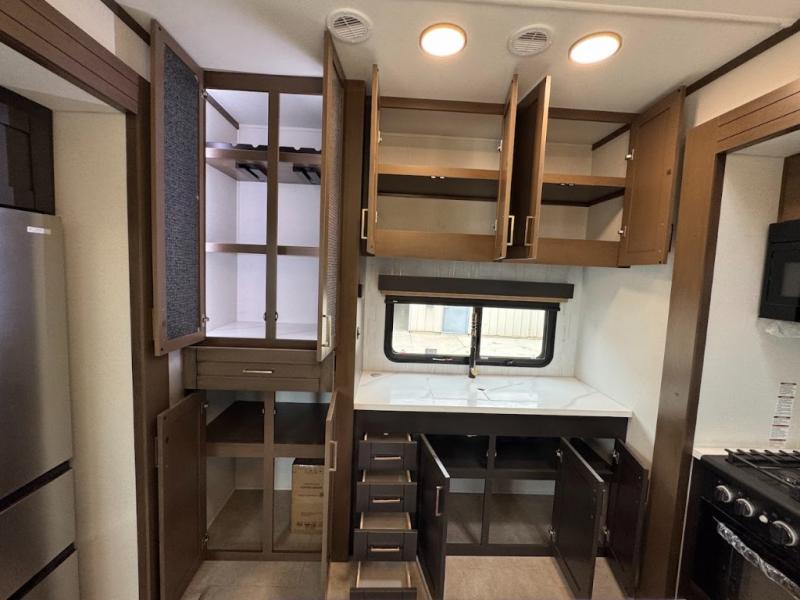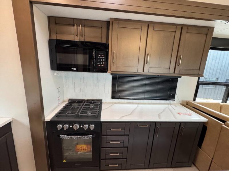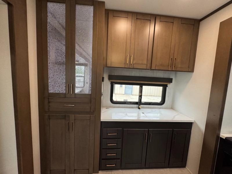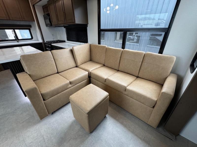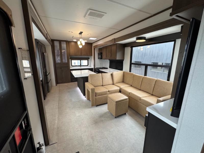 Cook like a chef in the spacious rear kitchen of this luxurious fifth wheel, equipped with overhead cabinets, a pantry, a 12V refrigerator, along with a microwave, and a table with stools for casual dining with family and friends. The living room is the perfect place to relax and entertain yourself, featuring a swing desk for working or playing, an L-shaped sofa for lounging, an entertainment center with a fireplace for cozy nights in, and a convenient half bathroom, ideal for guests. The bedroom is incredibly comfortable, featuring a king bed, a dual dresser for ample storage, and a comfy bench for relaxing. The front bathroom is a spacious oasis, complete with a dual sink, linen closet, walk-in closet, and washer and dryer prep for added convenience. Finally, step outside and enjoy the fresh air under our massive 16’ awning, perfect for relaxing and enjoying the exterior view.
