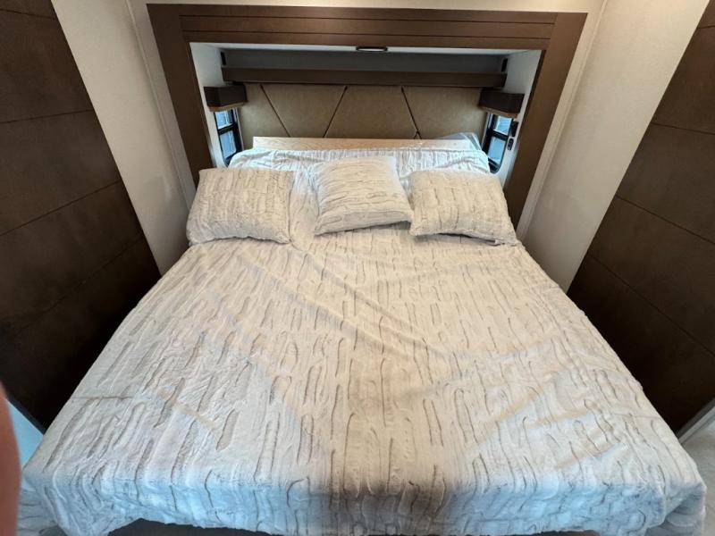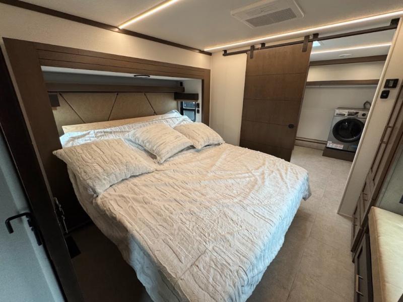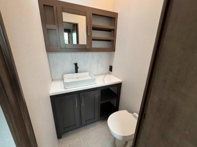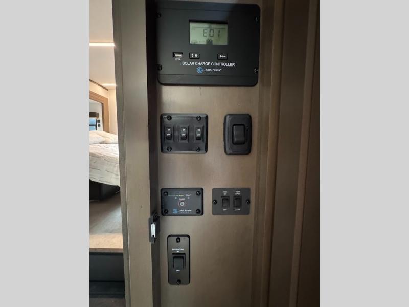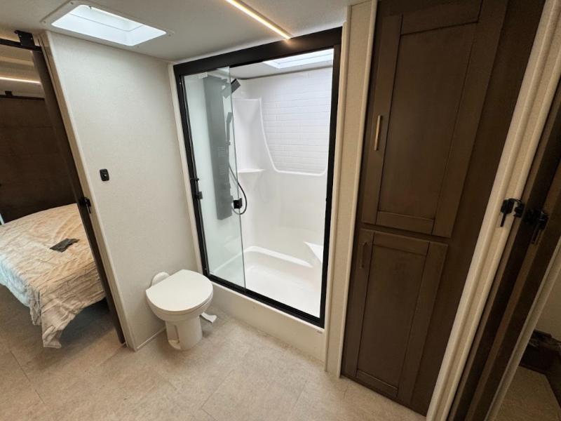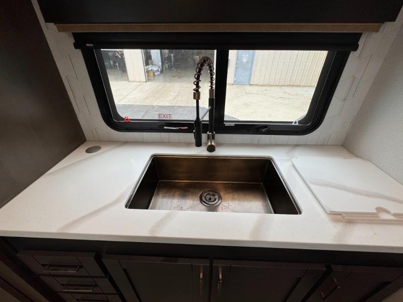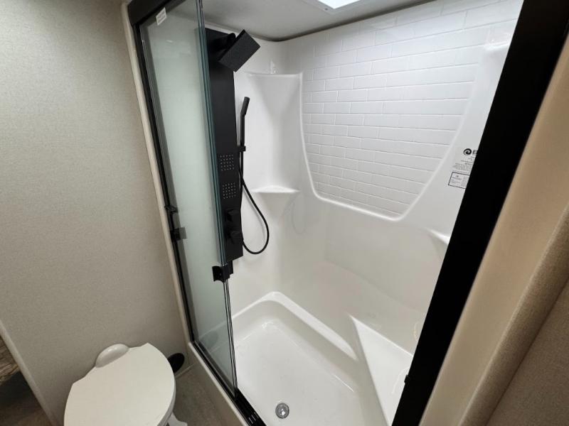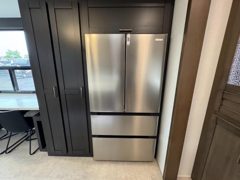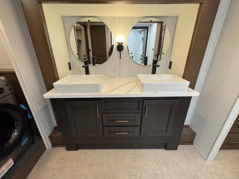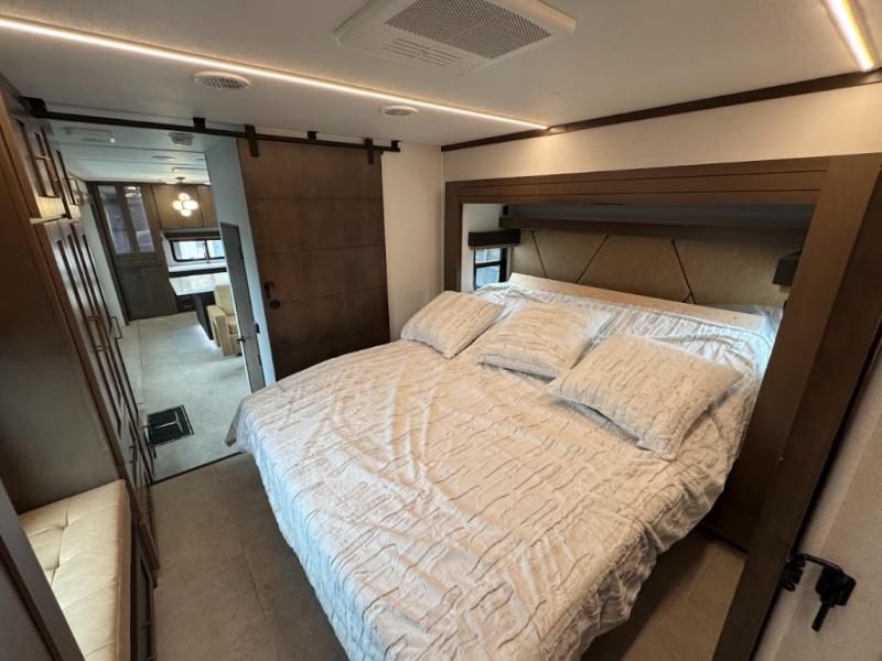 Cook like a chef in the spacious rear kitchen of this luxurious fifth wheel, equipped with overhead cabinets, a pantry, a 12V refrigerator, along with a microwave, and a table with stools for casual dining with family and friends. The living room is the perfect place to relax and entertain yourself, featuring a swing desk for working or playing, an L-shaped sofa for lounging, an entertainment center with a fireplace for cozy nights in, and a convenient half bathroom, ideal for guests. The bedroom is incredibly comfortable, featuring a king bed, a dual dresser for ample storage, and a comfy bench for relaxing. The front bathroom is a spacious oasis, complete with a dual sink, linen closet, walk-in closet, and washer and dryer prep for added convenience. Finally, step outside and enjoy the fresh air under our massive 16’ awning, perfect for relaxing and enjoying the exterior view.