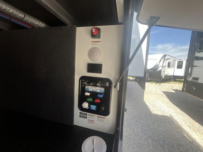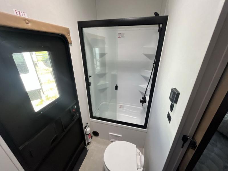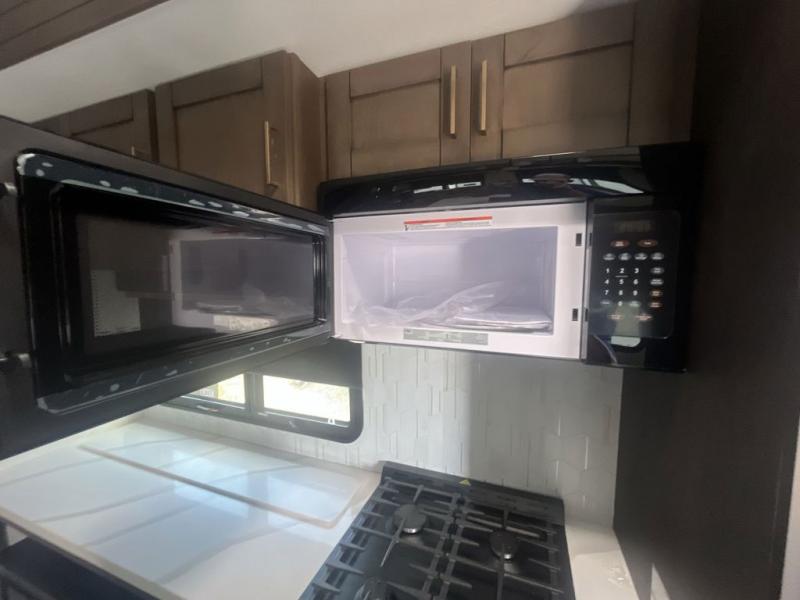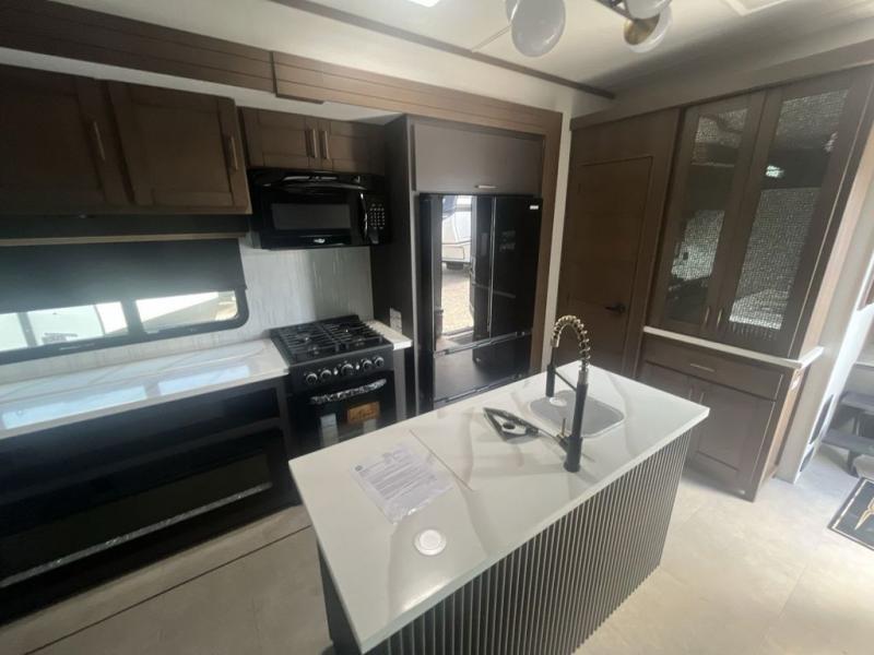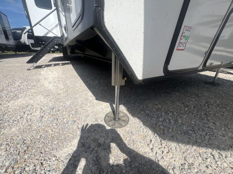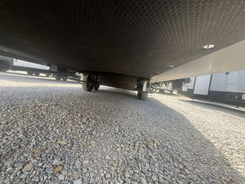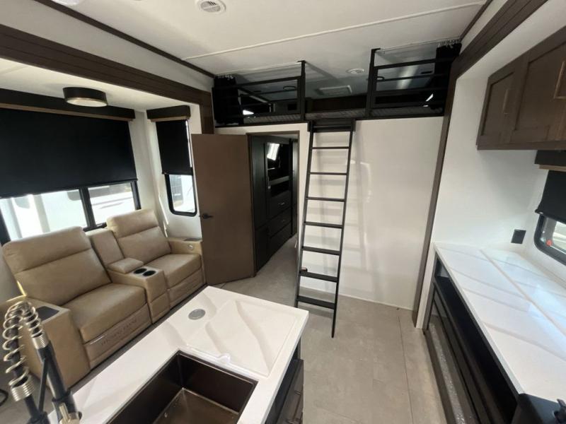 This fifth wheel is perfect for all family members! The full rear bathroom is perfect for getting ready for the day. The bedroom is ideal for two people since they would easily fit in the queen bed, also comes with a dresser, and TV for relaxing. Above the bedroom, a loft area with overhead cabinets provides additional storage and a cozy nook. The kitchen/living area is the heart of the home, equipped with a sofa, entertainment center, fireplace, microwave, kitchen island, refrigerator, and pantry. Perfect for cooking up a storm or relaxing with family and friends. A second full bathroom is a spacious oasis and provides added convenience, while the front bedroom is a luxurious retreat, featuring a king bed, ample closet, and washer and dryer prep. Finally, you and your family and friends can enjoy nature and have fun under the shade of the 16’ awning.