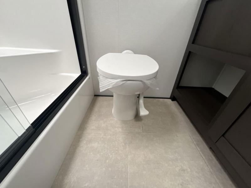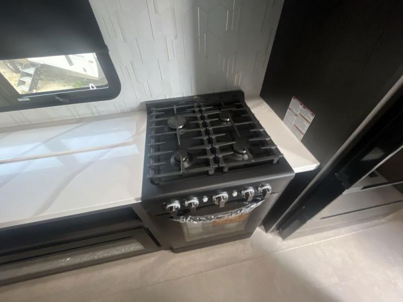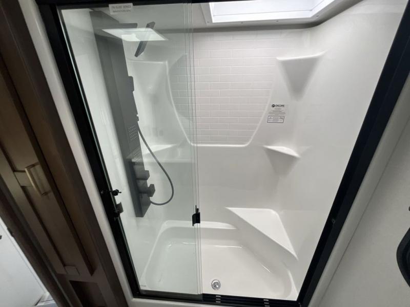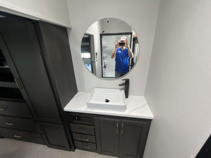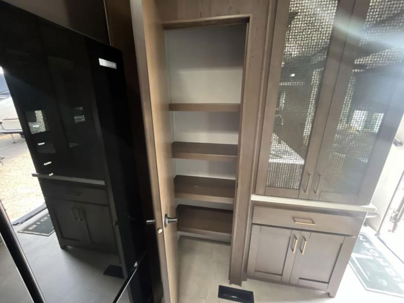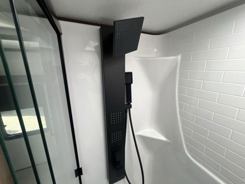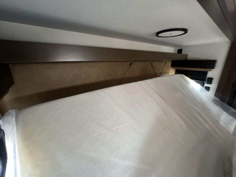This fifth wheel is perfect for all family members! The full rear bathroom is perfect for getting ready for the day. The bedroom is ideal for two people since they would easily fit in the queen bed, also comes with a dresser, and TV for relaxing. Above the bedroom, a loft area with overhead cabinets provides additional storage and a cozy nook. The kitchen/living area is the heart of the home, equipped with a sofa, entertainment center, fireplace, microwave, kitchen island, refrigerator, and pantry. Perfect for cooking up a storm or relaxing with family and friends. A second full bathroom is a spacious oasis and provides added convenience, while the front bedroom is a luxurious retreat, featuring a king bed, ample closet, and washer and dryer prep. Finally, you and your family and friends can enjoy nature and have fun under the shade of the 16’ awning.