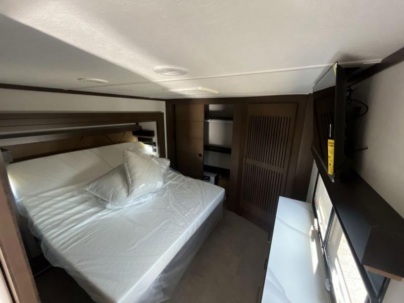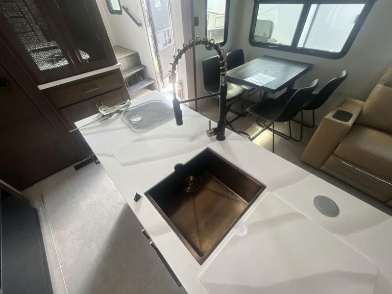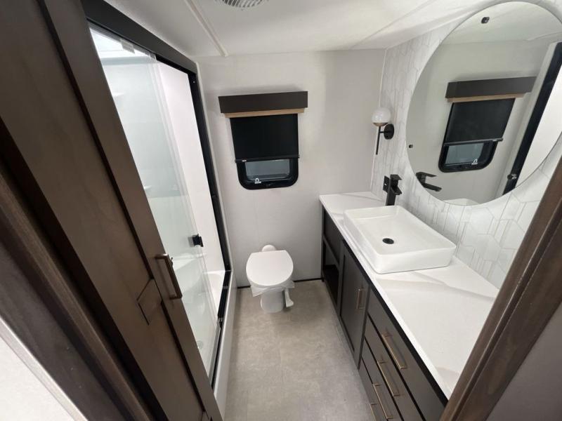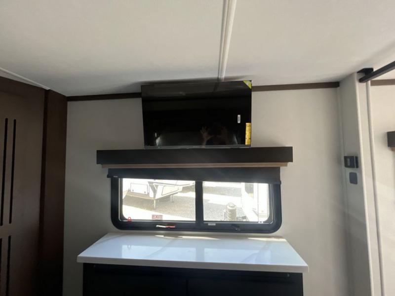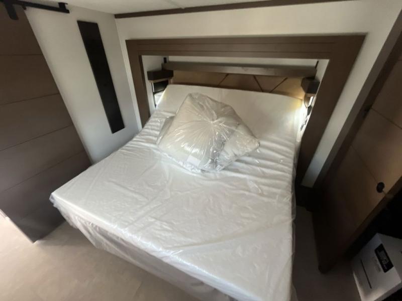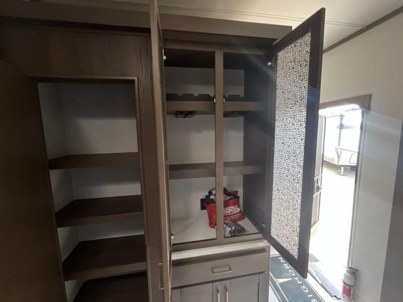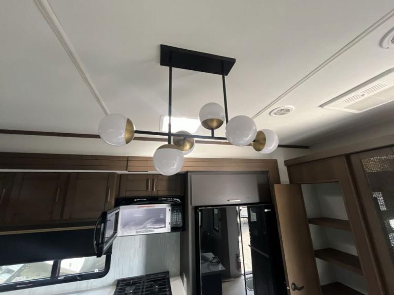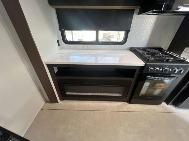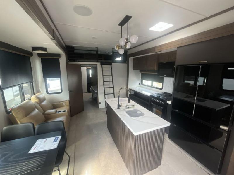 This fifth wheel is perfect for all family members! The full rear bathroom is perfect for getting ready for the day. The bedroom is ideal for two people since they would easily fit in the queen bed, also comes with a dresser, and TV for relaxing. Above the bedroom, a loft area with overhead cabinets provides additional storage and a cozy nook. The kitchen/living area is the heart of the home, equipped with a sofa, entertainment center, fireplace, microwave, kitchen island, refrigerator, and pantry. Perfect for cooking up a storm or relaxing with family and friends. A second full bathroom is a spacious oasis and provides added convenience, while the front bedroom is a luxurious retreat, featuring a king bed, ample closet, and washer and dryer prep. Finally, you and your family and friends can enjoy nature and have fun under the shade of the 16’ awning.