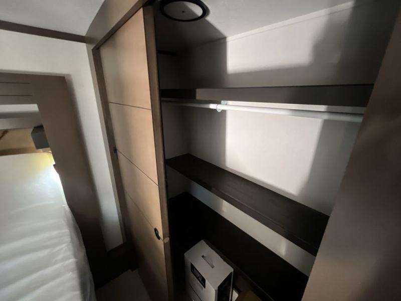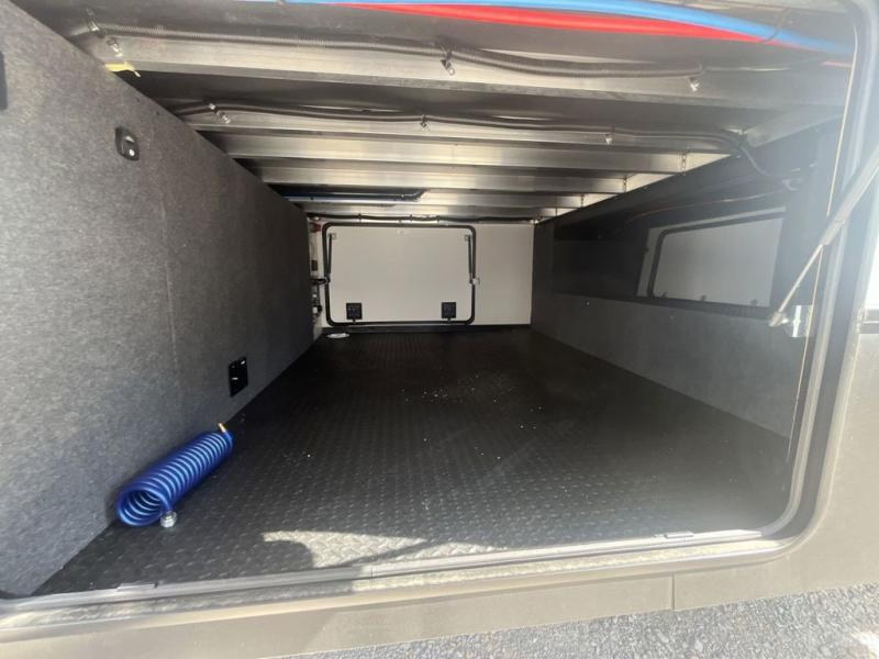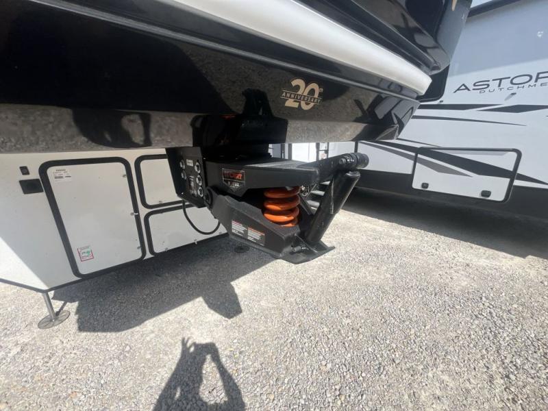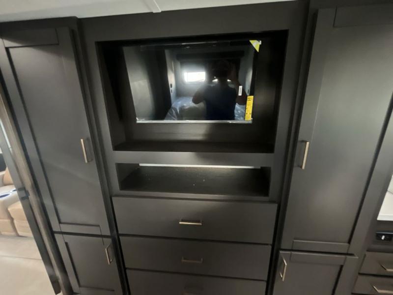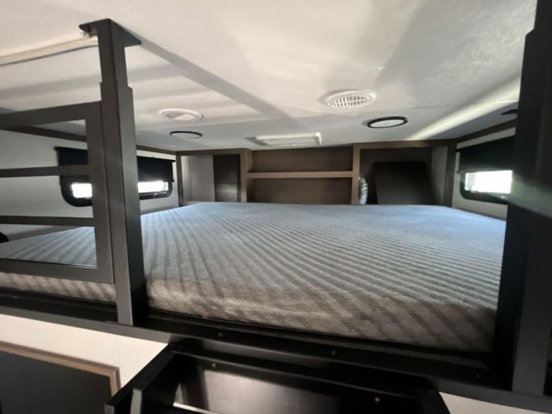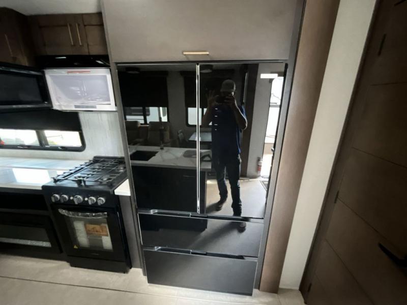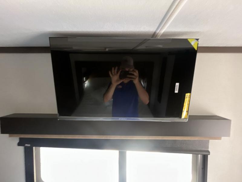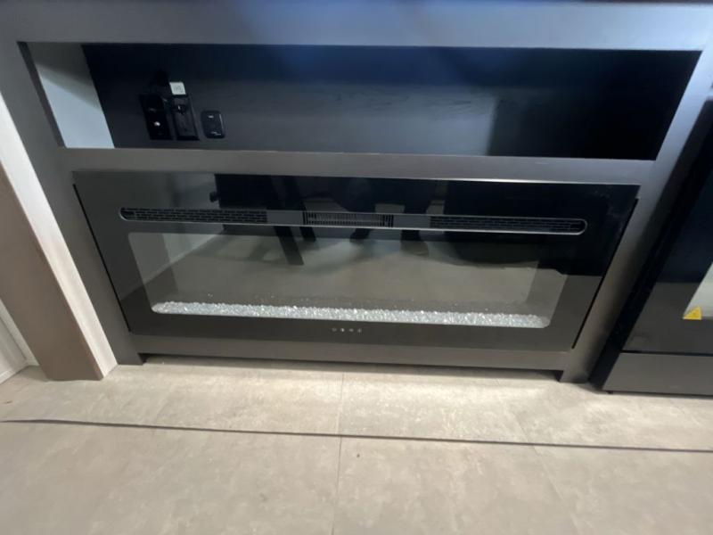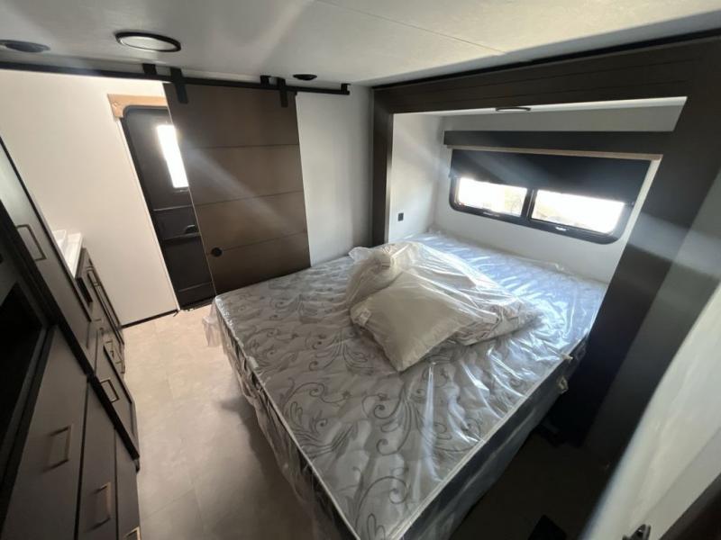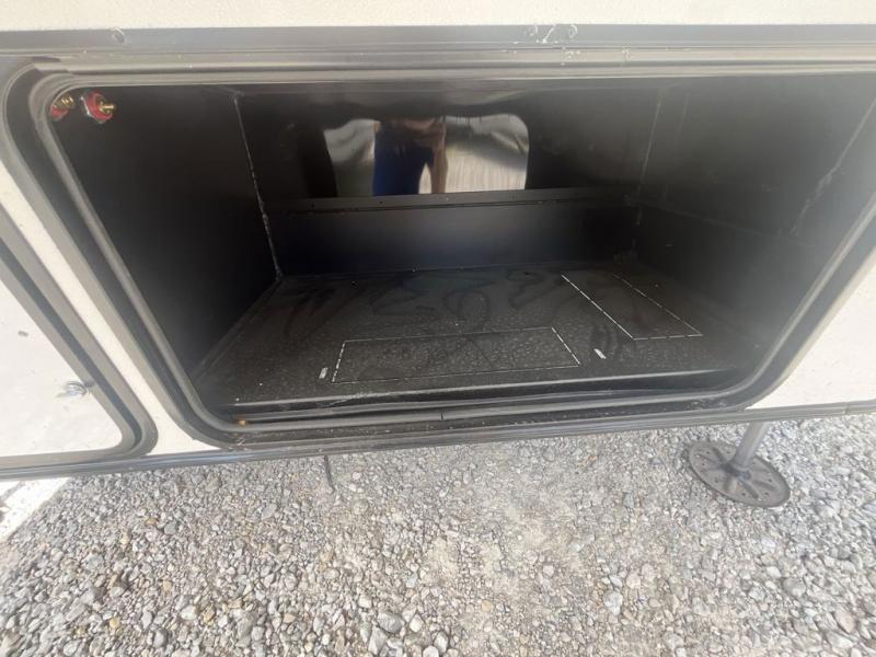 This fifth wheel is perfect for all family members! The full rear bathroom is perfect for getting ready for the day. The bedroom is ideal for two people since they would easily fit in the queen bed, also comes with a dresser, and TV for relaxing. Above the bedroom, a loft area with overhead cabinets provides additional storage and a cozy nook. The kitchen/living area is the heart of the home, equipped with a sofa, entertainment center, fireplace, microwave, kitchen island, refrigerator, and pantry. Perfect for cooking up a storm or relaxing with family and friends. A second full bathroom is a spacious oasis and provides added convenience, while the front bedroom is a luxurious retreat, featuring a king bed, ample closet, and washer and dryer prep. Finally, you and your family and friends can enjoy nature and have fun under the shade of the 16’ awning.