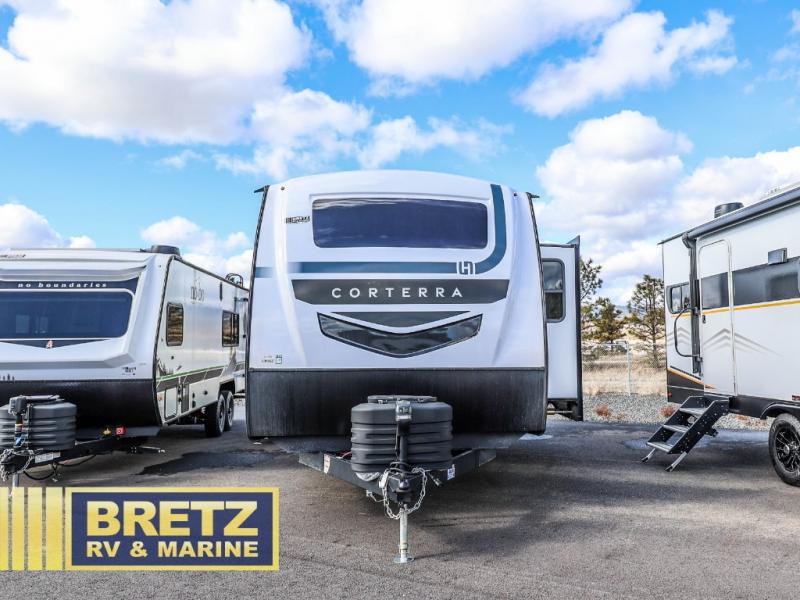Explore the open road with any one of these Heartland Corterra fifth wheels or travel trailers! They are built with a 8" I-beam, Azdel Onboard composite sidewalls, and a heated and enclosed underbelly to protect your unit's vitals. The Vault XL and color coded wiring makes it easy to navigate through it and the exclusive TRIO airflow AC system ensures maximum cooling to keep you cooled off on a hot summer day. You can safely enter and exit the unit through the deluxe tinted glass entry door with Extended Safe-T entry grab handle. The interiors abound in luxury with hidden storage throughout, a wine and/or coffee bar for entertaining, and a residential appliance package for home cooked meals everywhere you go. Come find your favorite one today!