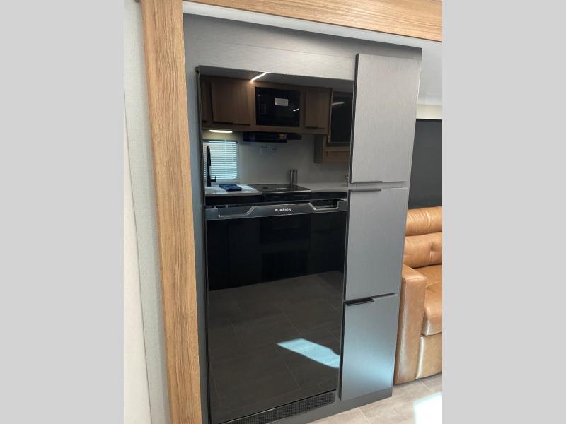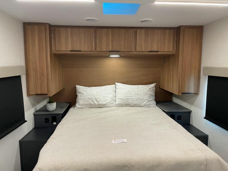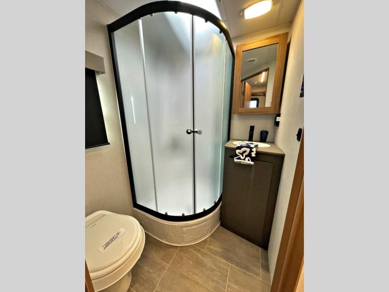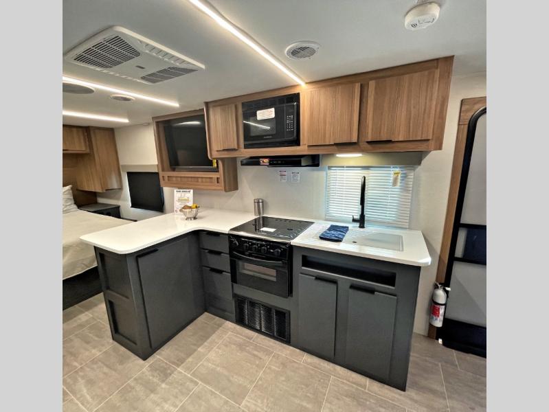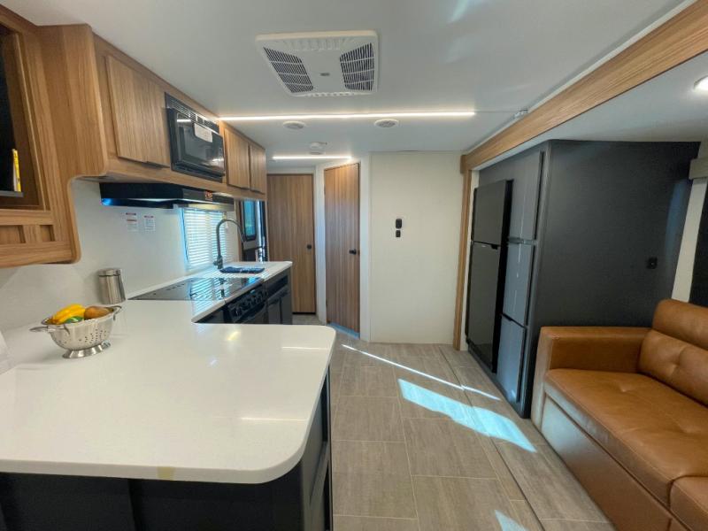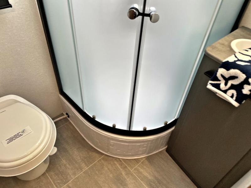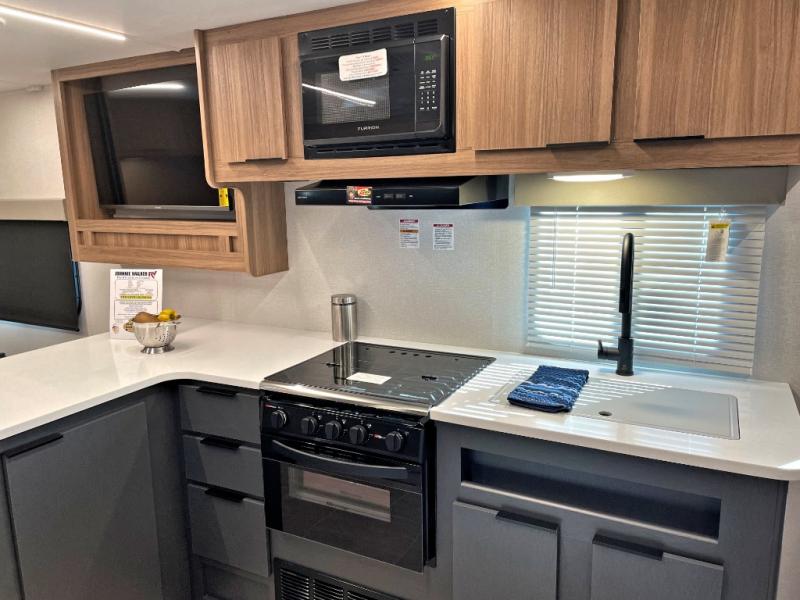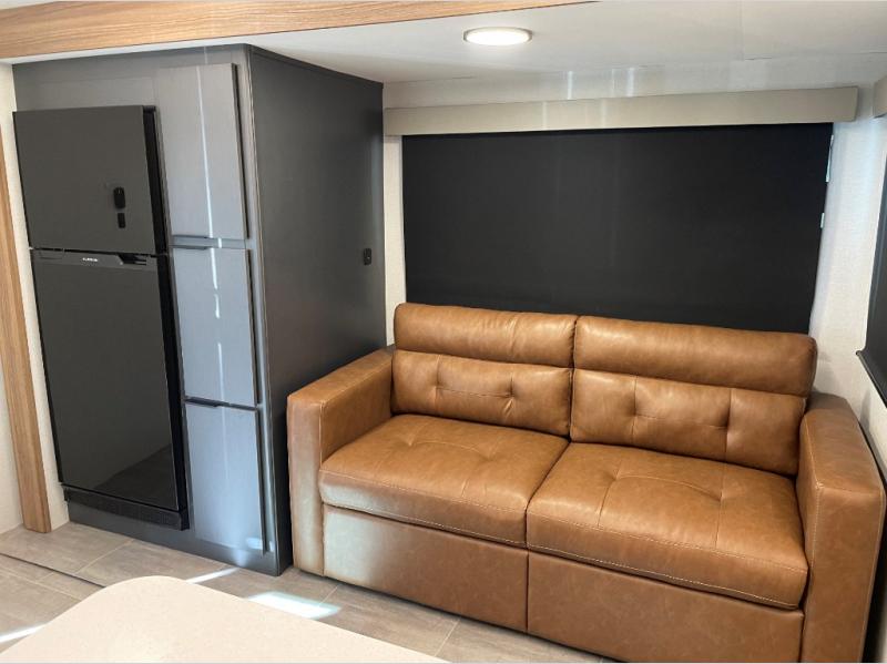 Pack your bags and hitch up this travel trailer for a fun time at the campground! The queen size bed up front offers a comfortable place to lay your head at night with wardrobes and nightstands on either side of it for your items. Prepare your best home cooked meals in the fully equipped kitchen with stainless steel appliances. The luxurious sofa is a comfy place to sit while you watch your favorite movies on the 40" LED TV. Throughout the unit is USB/USBC and 110V outlets, plus an upgraded Bluetooth interior sound system for crystal clear music. Freshen up after a fun day at the beach in the radius shower located in the rear corner bathroom!