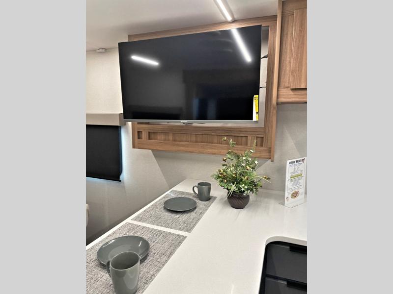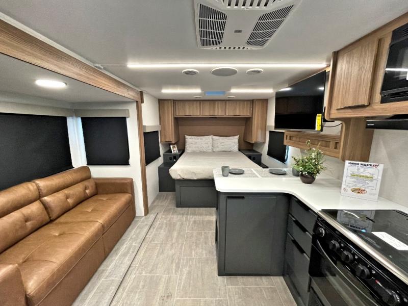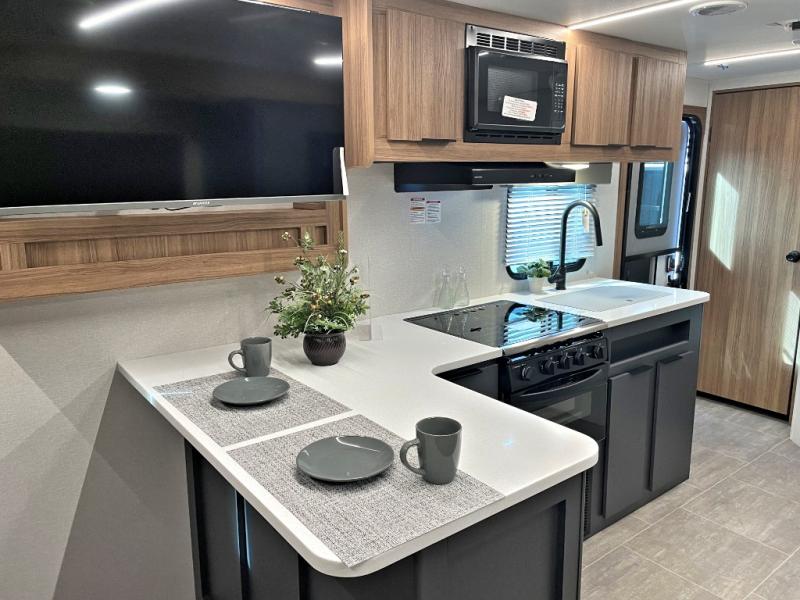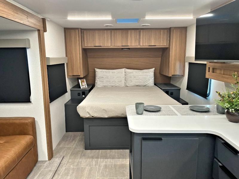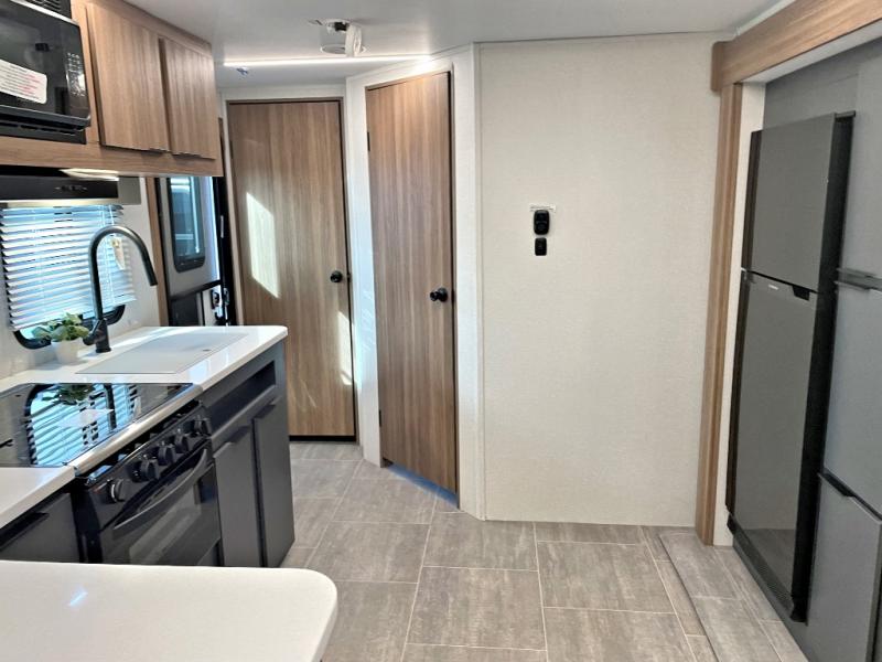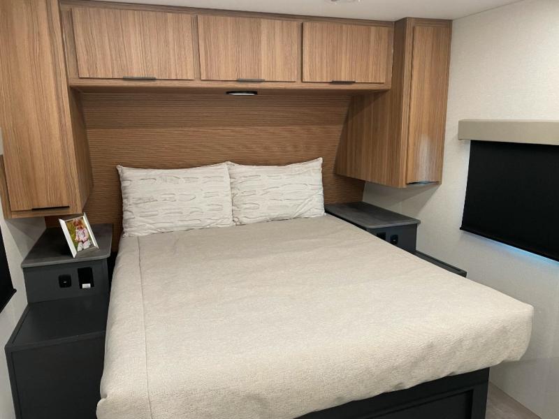 Pack your bags and hitch up this travel trailer for a fun time at the campground! The queen size bed up front offers a comfortable place to lay your head at night with wardrobes and nightstands on either side of it for your items. Prepare your best home cooked meals in the fully equipped kitchen with stainless steel appliances. The luxurious sofa is a comfy place to sit while you watch your favorite movies on the 40" LED TV. Throughout the unit is USB/USBC and 110V outlets, plus an upgraded Bluetooth interior sound system for crystal clear music. Freshen up after a fun day at the beach in the radius shower located in the rear corner bathroom!