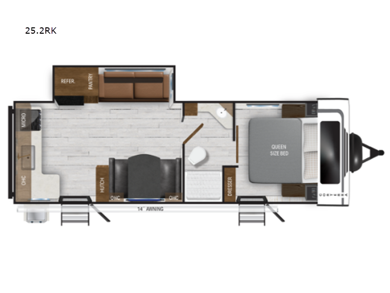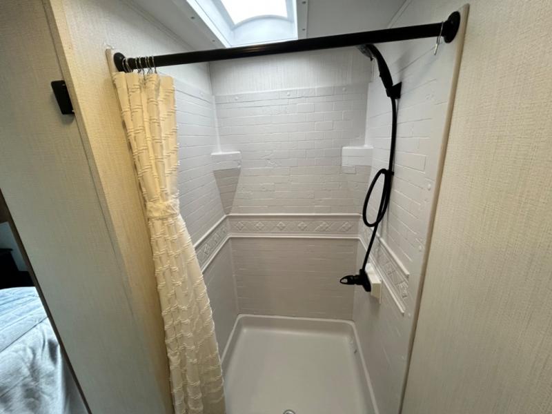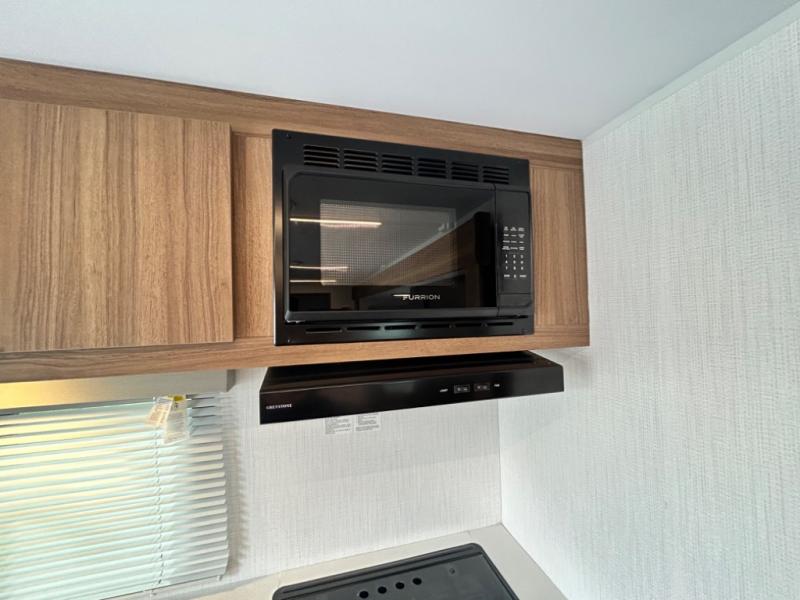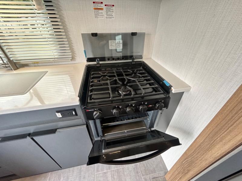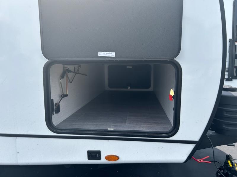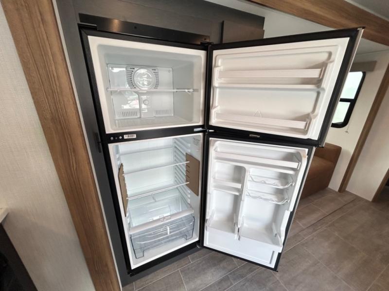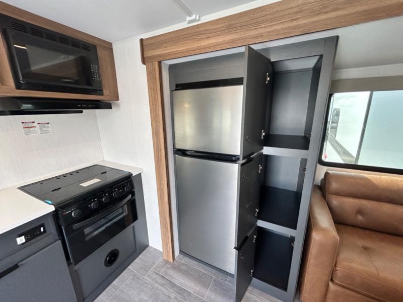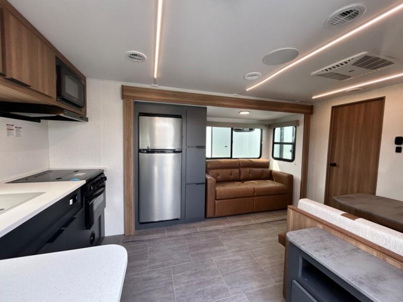 Head to the great outdoors in this travel trailer! Enter the unit through one of the dual entry doors and see all that it has to offer. Starting with the front private bedroom that has a queen size bed to lay your head on at night and wardrobes on either side to hang up your clothes, plus it enters right into the walk-through bathroom which has a full shower surround. The rear kitchen has stainless steel appliances to prepare your best home cooked meals, but if you're wanting some more fresh air while you cook then head to the outdoor kitchen where you can grill some burgers on the cooktop and enjoy a cold beverage stored in the refrigerator. Next to the booth dinette is a hutch to store all of your dishes, and across from it is a sofa to relax on while you watch a movie on the 40" LED TV!