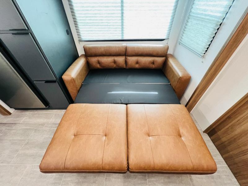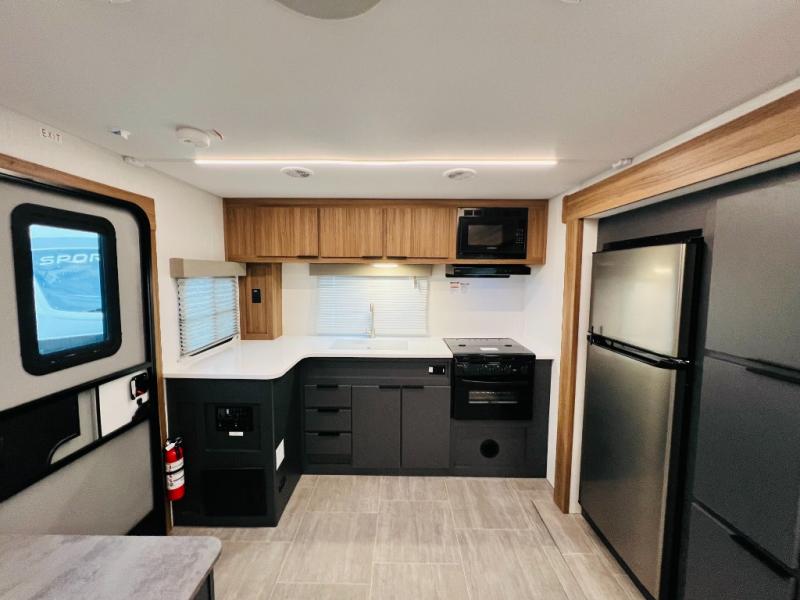 Head to the great outdoors in this travel trailer! Enter the unit through one of the dual entry doors and see all that it has to offer. Starting with the front private bedroom that has a queen size bed to lay your head on at night and wardrobes on either side to hang up your clothes, plus it enters right into the walk-through bathroom which has a full shower surround. The rear kitchen has stainless steel appliances to prepare your best home cooked meals, but if you're wanting some more fresh air while you cook then head to the outdoor kitchen where you can grill some burgers on the cooktop and enjoy a cold beverage stored in the refrigerator. Next to the booth dinette is a hutch to store all of your dishes, and across from it is a sofa to relax on while you watch a movie on the 40" LED TV!