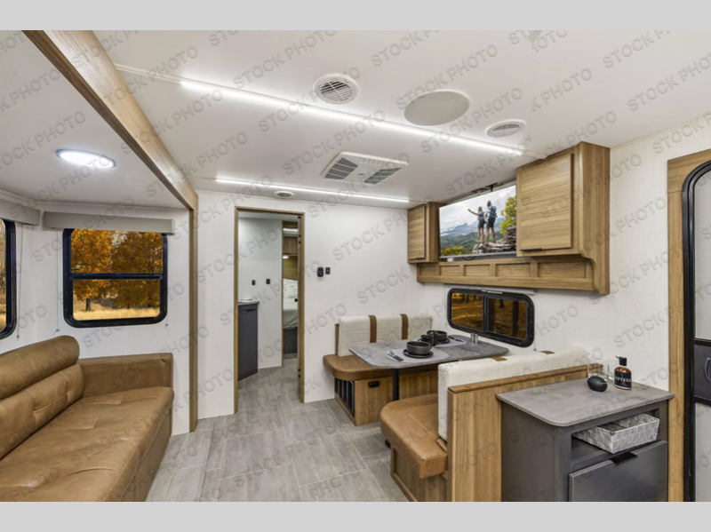 Head to the great outdoors in this travel trailer! Enter the unit through one of the dual entry doors and see all that it has to offer. Starting with the front private bedroom that has a queen size bed to lay your head on at night and wardrobes on either side to hang up your clothes, plus it enters right into the walk-through bathroom which has a full shower surround. The rear kitchen has stainless steel appliances to prepare your best home cooked meals, but if you're wanting some more fresh air while you cook then head to the outdoor kitchen where you can grill some burgers on the cooktop and enjoy a cold beverage stored in the refrigerator. Next to the booth dinette is a hutch to store all of your dishes, and across from it is a sofa to relax on while you watch a movie on the 40" LED TV!