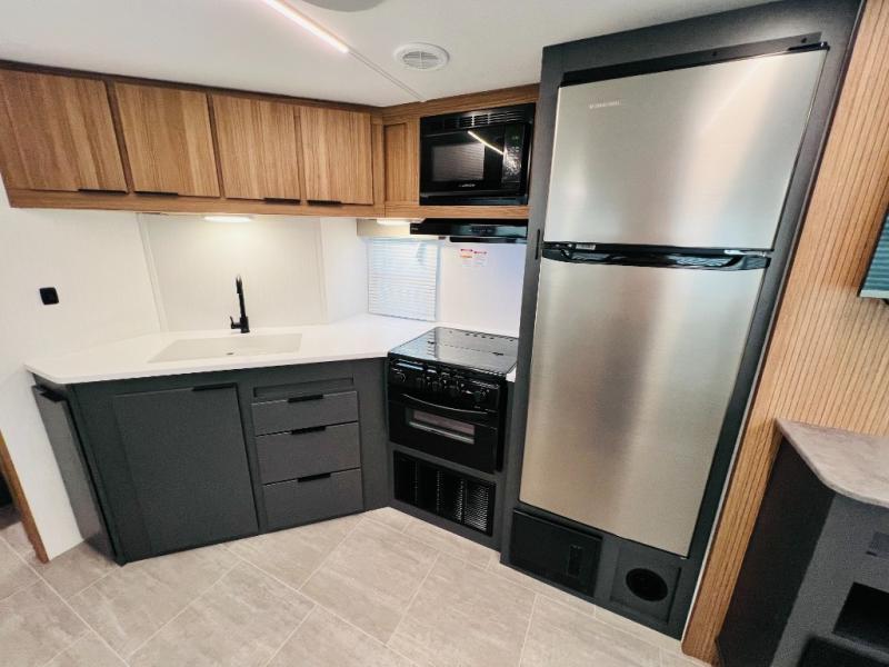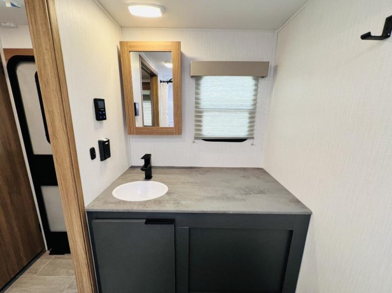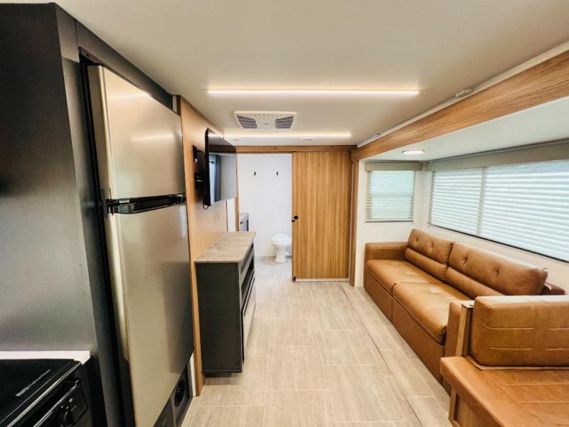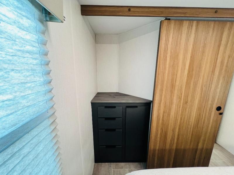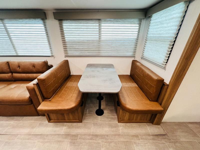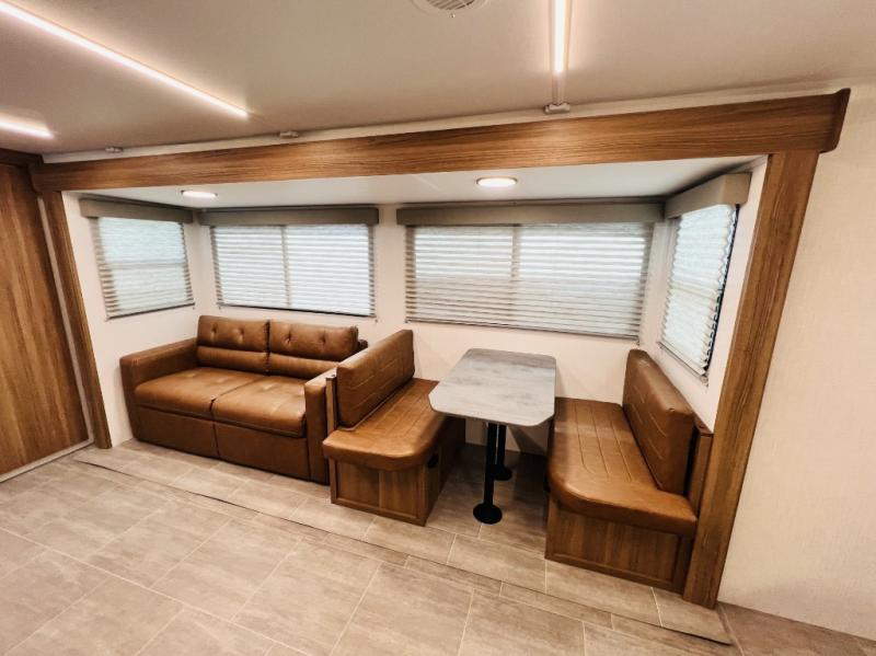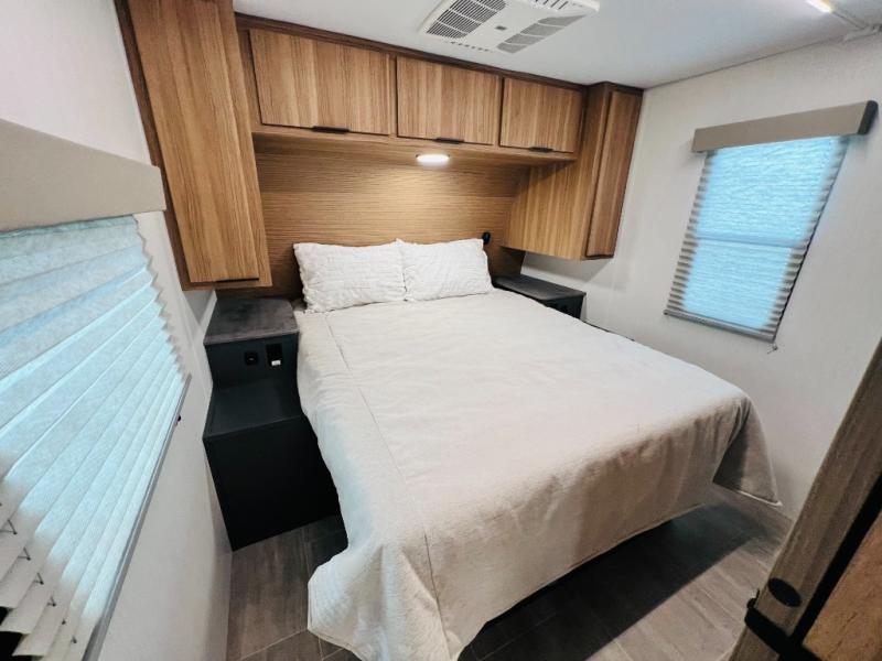 If you want luxury while you camp, then you came to the right place with this travel trailer! After a fun-filled day at the beach, you can rinse the sand out of your hair in the full shower surround located in the full rear bathroom which also has a linen closet and a sink with plenty of countertop space for your necessities that might not fit inside the medicine cabinet. Just outside the bathroom is the walk-in pantry where you can store all of your favorite snacks, a sofa to relax on, a booth dinette to enjoy meals at or transform into an extra sleeping space, and a fully equipped kitchen with stainless steel appliances to whip up your best dishes. The front private bedroom has a queen size bed to lay your head on at night along with wardrobes and nightstands on either side for your items!